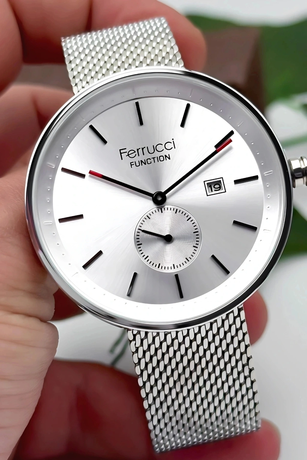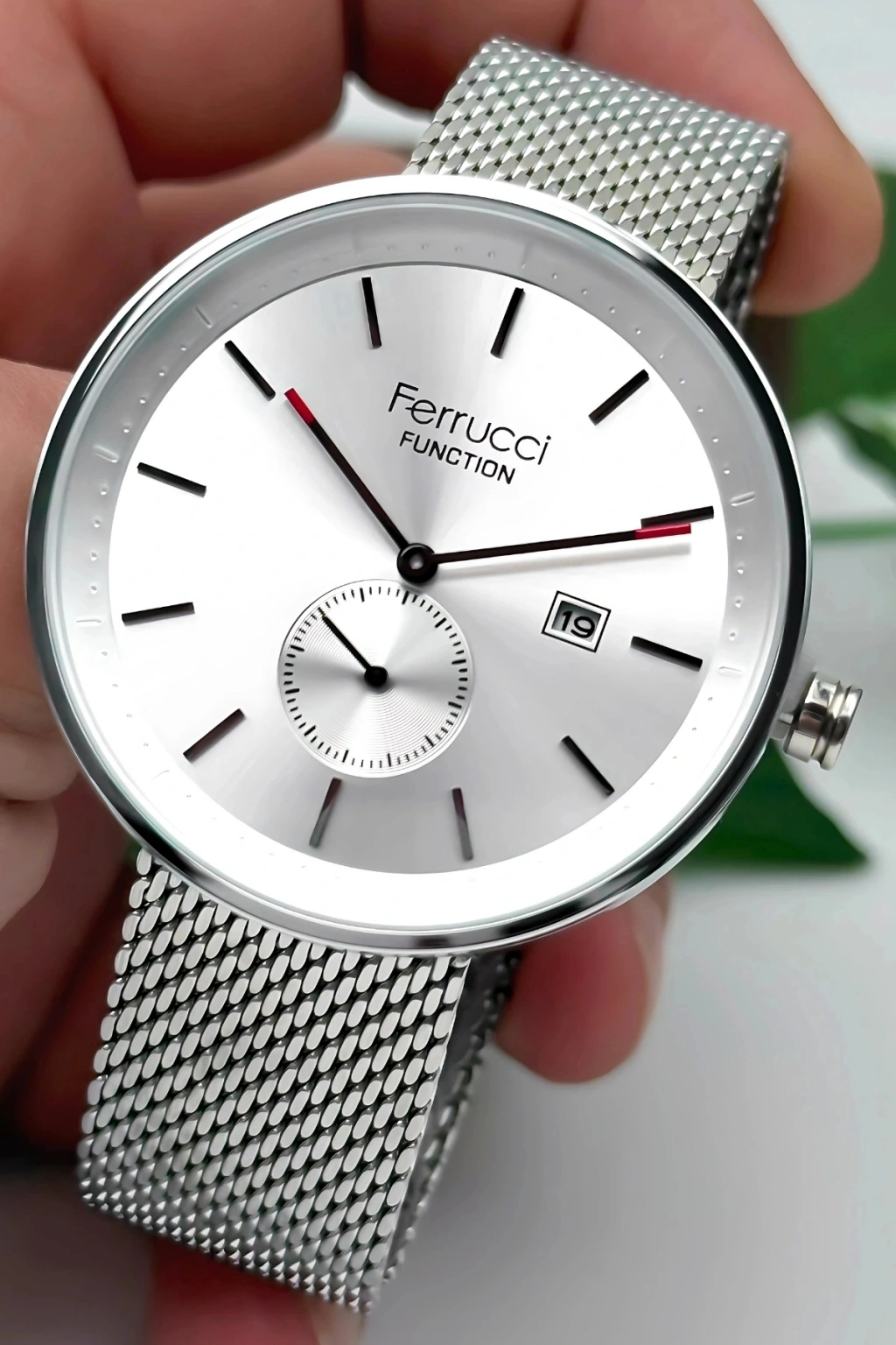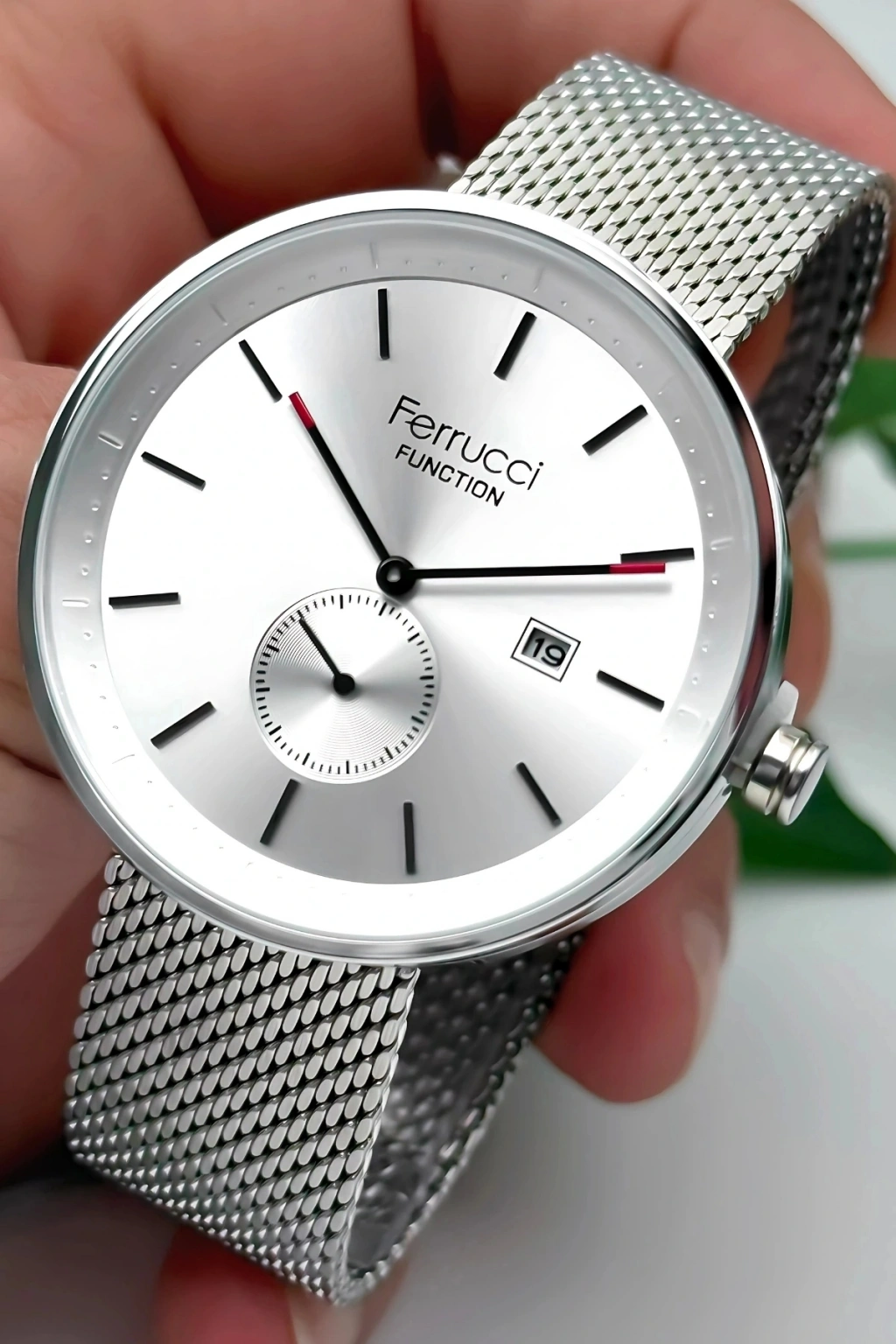 Ferrucci Takvimli 3atm Suya Dayanıklı Erkek Kol Saati, Çelik Kordon & Özel Tasarım, Gümüş Sdfer161