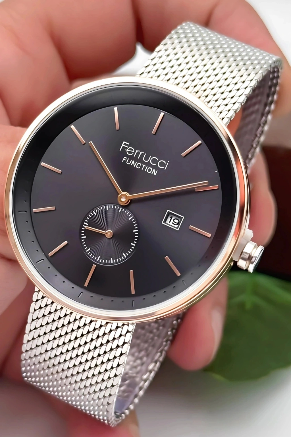 Ferrucci Takvimli 3atm Suya Dayanıklı Erkek Kol Saati, Çelik Kordon & Özel Tasarım, Gümüş-siyah Sdfer161