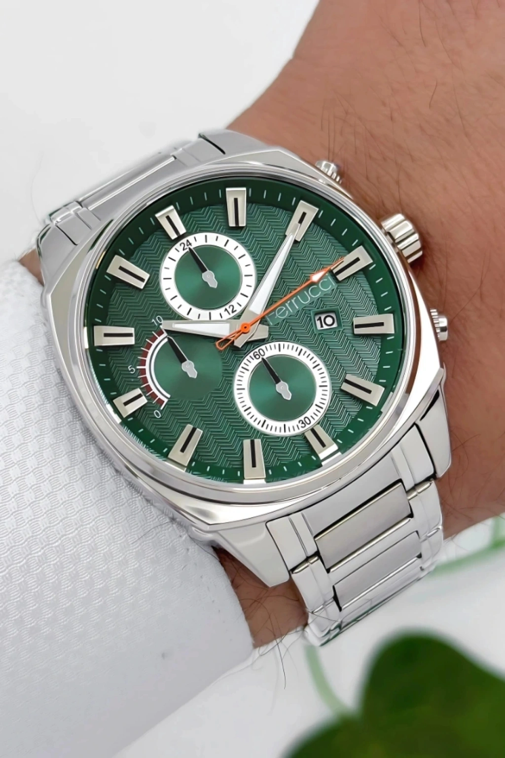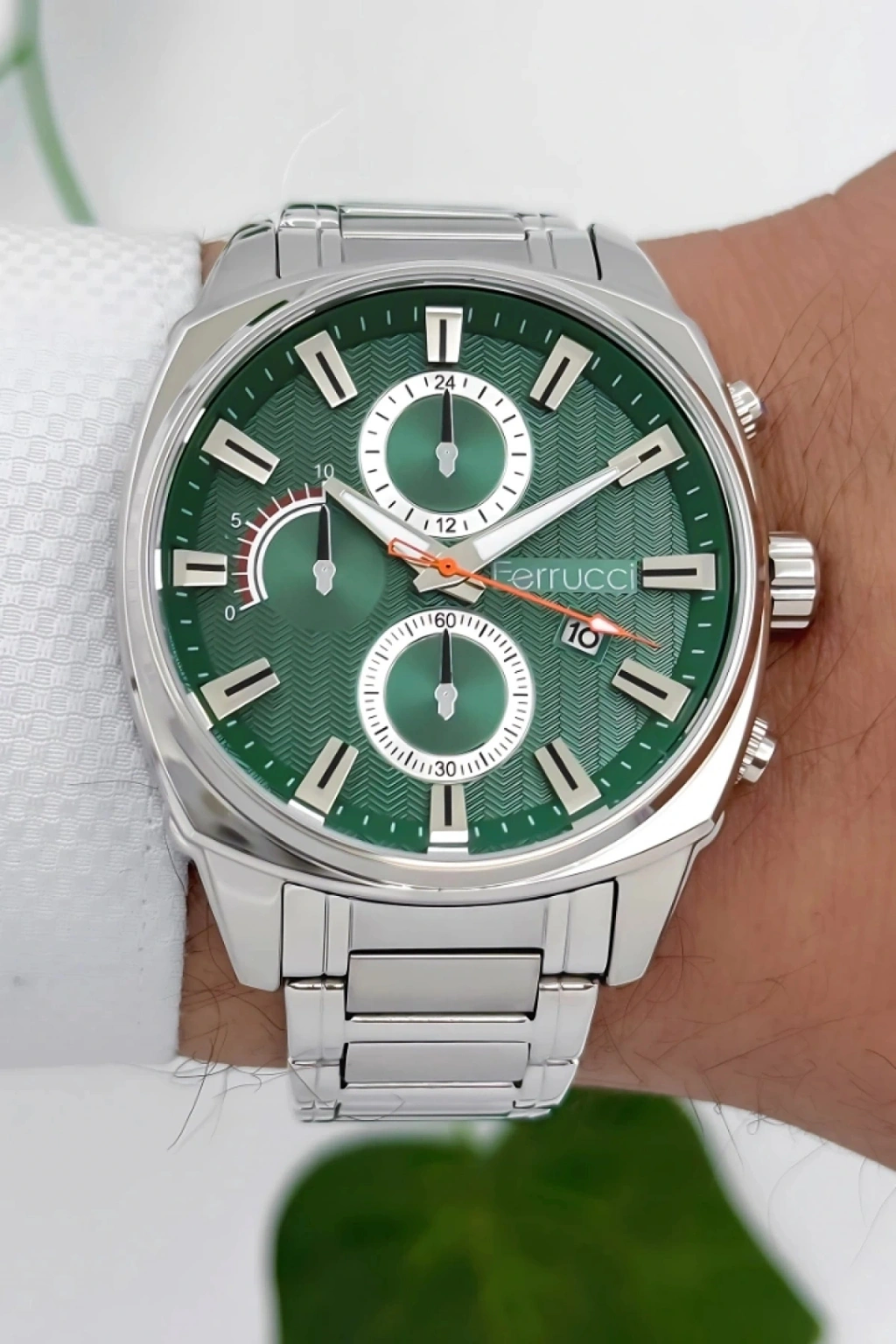 Ferrucci Takvimli3atm Suya Dayanıklı Erkek Kol Saati, Çelik Kordon & Özel Tasarım, Gümüş-yeşil Sdfer160