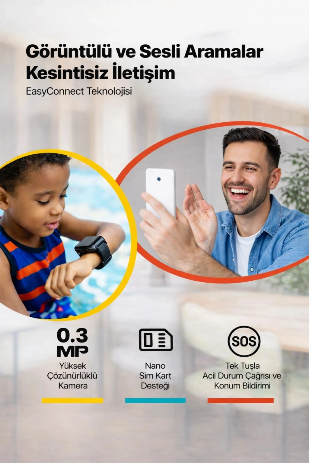 Saat üzerinde bulunan SOS acil durum butonu, çocuk tek tuşla önceden tanımlı acil durum numaralarını arayabilir. Gerçek bir güvenlik kalkanı sunar.