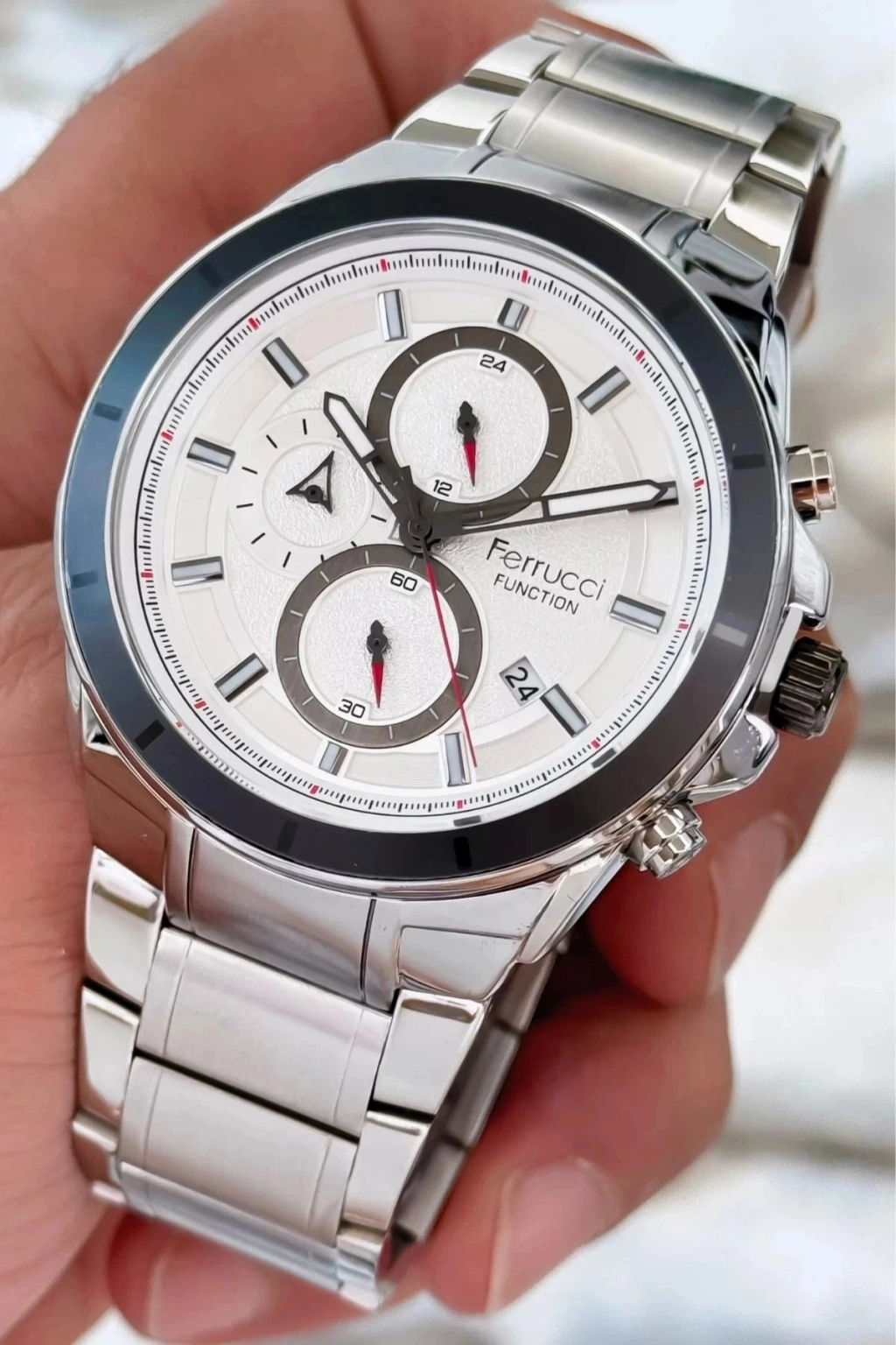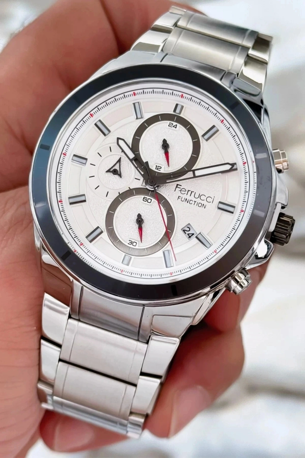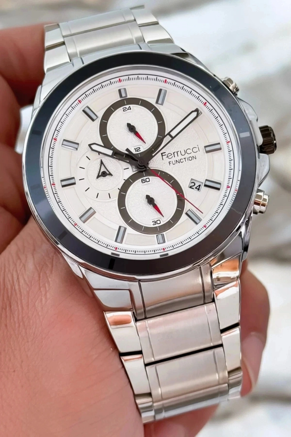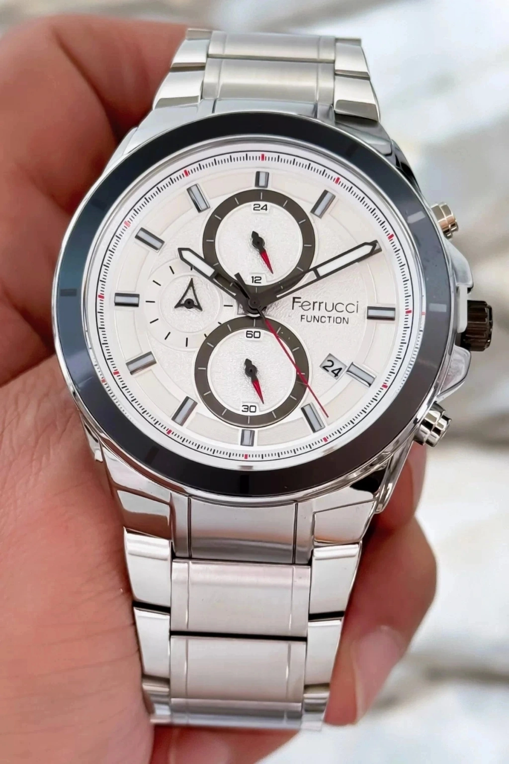 Ferrucci Marka Çelik Kordon Tüm Fonksiyonlar Aktif Erkek Kol Saati; Ferrucci marka çelik kordon tüm fonksiyonlar aktif erkek kol saati, şıklığı ve işlevselliği bir araya getiren birinci sınıf bir aksesuardır. Bu saat, kusursuz bir tasarıma sahip olan 44mm çelik kasası ve çelik kordonuyla öne çıkar. Dayanıklı yapısı ve çekici görünümüyle dikkatleri üzerinize çekmek için ideal bir seçenektir. Ayrıca, 3 atm suya dayanıklılık özelliğiyle, günlük aktivitelerinizde rahatlıkla kullanabilirsiniz.; Bu özel saat, sadece zamanı göstermekle kalmaz, aynı zamanda bir dizi fonksiyonu da aktif olarak sunar. Tarih göstergesi ile günlük takvim ihtiyaçlarınızı kolaylıkla karşılayabilirsiniz. sizi önemli randevularınız veya etkinlikleriniz hakkında bilgilendirirken, dünya saati özelliği de farklı zaman dilimlerindeki saatleri takip etmenize yardımcı olur. Bu şekilde, pratik ve işlevsel bir deneyim sunar.; Ferrucci marka çelik kordon tüm fonksiyonlar aktif erkek kol saati, yüksek kalite standartlarına uygun olarak üretilmiştir. Saat, dayanıklı çelik kasa ve çelik kordon ile uzun ömürlü bir kullanım sunar. Aynı zamanda, çelik malzeme kolayca temizlenir ve çizilmelere karşı dirençlidir. Bu sayede saat, uzun süre boyunca günlük kullanıma dayanıklıdır.; Ferrucci marka çelik kordon tüm fonksiyonlar aktif erkek kol saati, orijinal Ferrucci marka bir üründür ve 2 yıl garanti kapsamındadır. Bu garanti, ürününüzde herhangi bir imalat hatası veya işlevsellik sorunu olması durumunda size güvence sağlar.; Tarzınızı yansıtmak ve her anınızda şıklığı hissetmek için Ferrucci marka çelik kordon tüm fonksiyonlar aktif erkek kol saati mükemmel bir seçimdir. Güvenilirlik, işlevsellik ve şıklık beklentilerinizi karşılamak için tasarlanmıştır.;