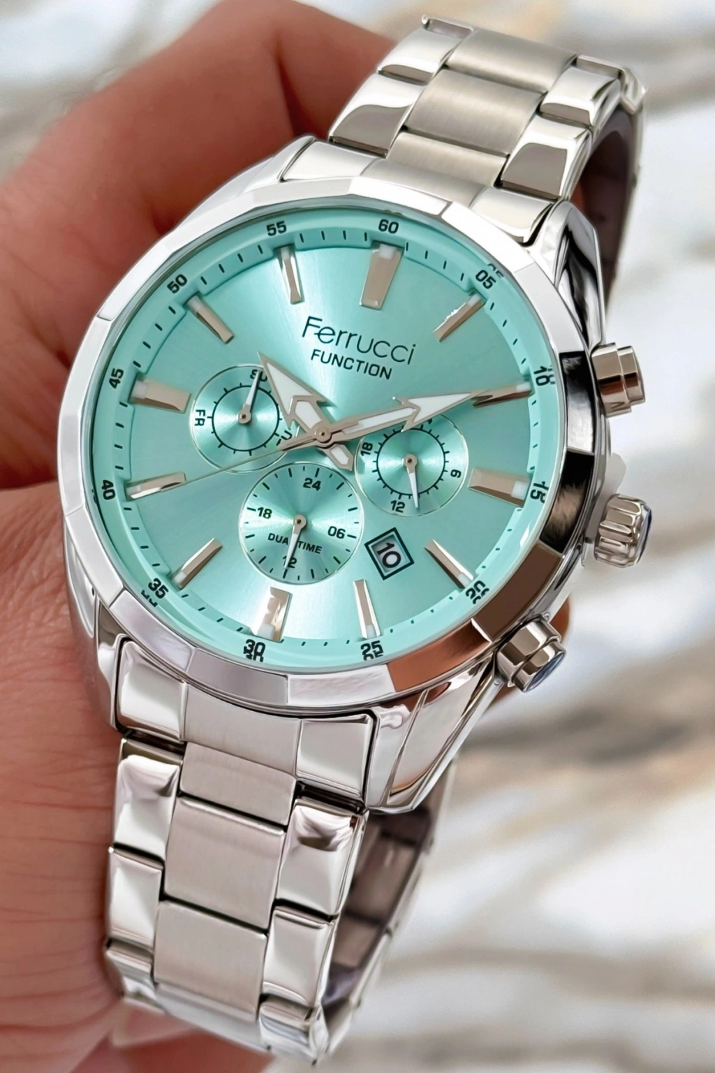 Ferrucci Marka Çelik Kordon Tüm Fonksiyonlar Aktif Erkek Kol Saati; Ferrucci marka çelik kordon tüm fonksiyonlar aktif erkek kol saati, şıklığı ve işlevselliği bir araya getiren birinci sınıf bir aksesuardır. Bu saat, kusursuz bir tasarıma sahip olan 44mm çelik kasası ve çelik kordonuyla öne çıkar. Dayanıklı yapısı ve çekici görünümüyle dikkatleri üzerinize çekmek için ideal bir seçenektir. Ayrıca, 3 atm suya dayanıklılık özelliğiyle, günlük aktivitelerinizde rahatlıkla kullanabilirsiniz.; Bu özel saat, sadece zamanı göstermekle kalmaz, aynı zamanda bir dizi fonksiyonu da aktif olarak sunar. Tarih göstergesi ile günlük takvim ihtiyaçlarınızı kolaylıkla karşılayabilirsiniz. sizi önemli randevularınız veya etkinlikleriniz hakkında bilgilendirirken, dünya saati özelliği de farklı zaman dilimlerindeki saatleri takip etmenize yardımcı olur. Bu şekilde, pratik ve işlevsel bir deneyim sunar.; Ferrucci marka çelik kordon tüm fonksiyonlar aktif erkek kol saati, yüksek kalite standartlarına uygun olarak üretilmiştir. Saat, dayanıklı çelik kasa ve çelik kordon ile uzun ömürlü bir kullanım sunar. Aynı zamanda, çelik malzeme kolayca temizlenir ve çizilmelere karşı dirençlidir. Bu sayede saat, uzun süre boyunca günlük kullanıma dayanıklıdır.; Ferrucci marka çelik kordon tüm fonksiyonlar aktif erkek kol saati, orijinal Ferrucci marka bir üründür ve 2 yıl garanti kapsamındadır. Bu garanti, ürününüzde herhangi bir imalat hatası veya işlevsellik sorunu olması durumunda size güvence sağlar.; Tarzınızı yansıtmak ve her anınızda şıklığı hissetmek için Ferrucci marka çelik kordon tüm fonksiyonlar aktif erkek kol saati mükemmel bir seçimdir. Güvenilirlik, işlevsellik ve şıklık beklentilerinizi karşılamak için tasarlanmıştır.;