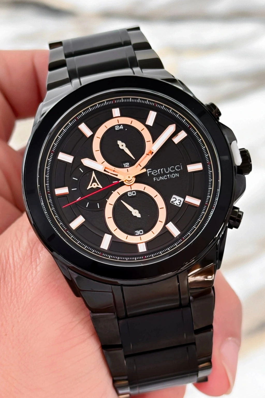 Ferrucci Marka Çelik Kordon Tüm Fonksiyonlar Aktif Erkek Kol Saati; Ferrucci marka çelik kordon tüm fonksiyonlar aktif erkek kol saati, şıklığı ve işlevselliği bir araya getiren birinci sınıf bir aksesuardır. Bu saat, kusursuz bir tasarıma sahip olan 44mm çelik kasası ve çelik kordonuyla öne çıkar. Dayanıklı yapısı ve çekici görünümüyle dikkatleri üzerinize çekmek için ideal bir seçenektir. Ayrıca, 3 atm suya dayanıklılık özelliğiyle, günlük aktivitelerinizde rahatlıkla kullanabilirsiniz.; Bu özel saat, sadece zamanı göstermekle kalmaz, aynı zamanda bir dizi fonksiyonu da aktif olarak sunar. Tarih göstergesi ile günlük takvim ihtiyaçlarınızı kolaylıkla karşılayabilirsiniz. sizi önemli randevularınız veya etkinlikleriniz hakkında bilgilendirirken, dünya saati özelliği de farklı zaman dilimlerindeki saatleri takip etmenize yardımcı olur. Bu şekilde, pratik ve işlevsel bir deneyim sunar.; Ferrucci marka çelik kordon tüm fonksiyonlar aktif erkek kol saati, yüksek kalite standartlarına uygun olarak üretilmiştir. Saat, dayanıklı çelik kasa ve çelik kordon ile uzun ömürlü bir kullanım sunar. Aynı zamanda, çelik malzeme kolayca temizlenir ve çizilmelere karşı dirençlidir. Bu sayede saat, uzun süre boyunca günlük kullanıma dayanıklıdır.; Ferrucci marka çelik kordon tüm fonksiyonlar aktif erkek kol saati, orijinal Ferrucci marka bir üründür ve 2 yıl garanti kapsamındadır. Bu garanti, ürününüzde herhangi bir imalat hatası veya işlevsellik sorunu olması durumunda size güvence sağlar.; Tarzınızı yansıtmak ve her anınızda şıklığı hissetmek için Ferrucci marka çelik kordon tüm fonksiyonlar aktif erkek kol saati mükemmel bir seçimdir. Güvenilirlik, işlevsellik ve şıklık beklentilerinizi karşılamak için tasarlanmıştır.;