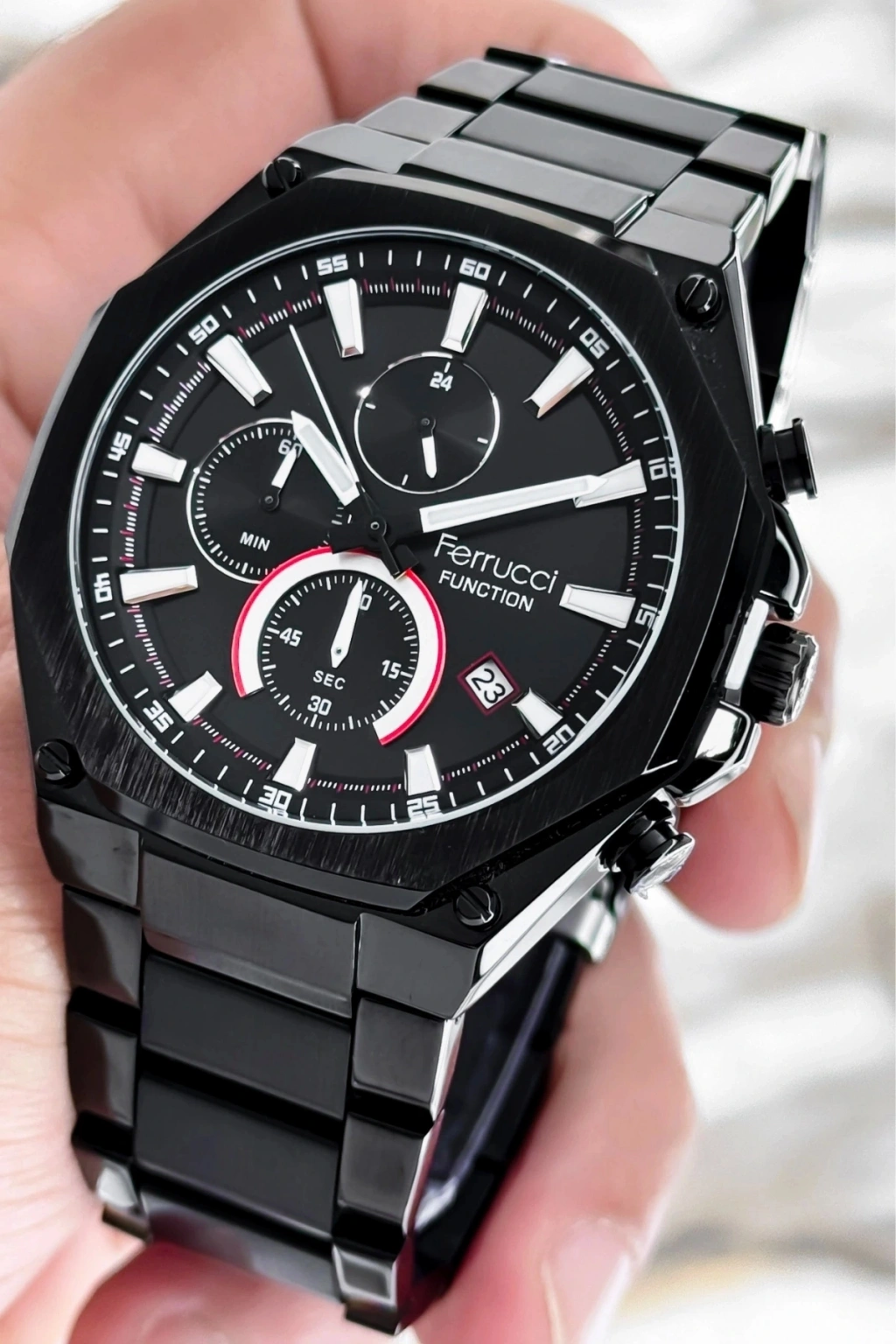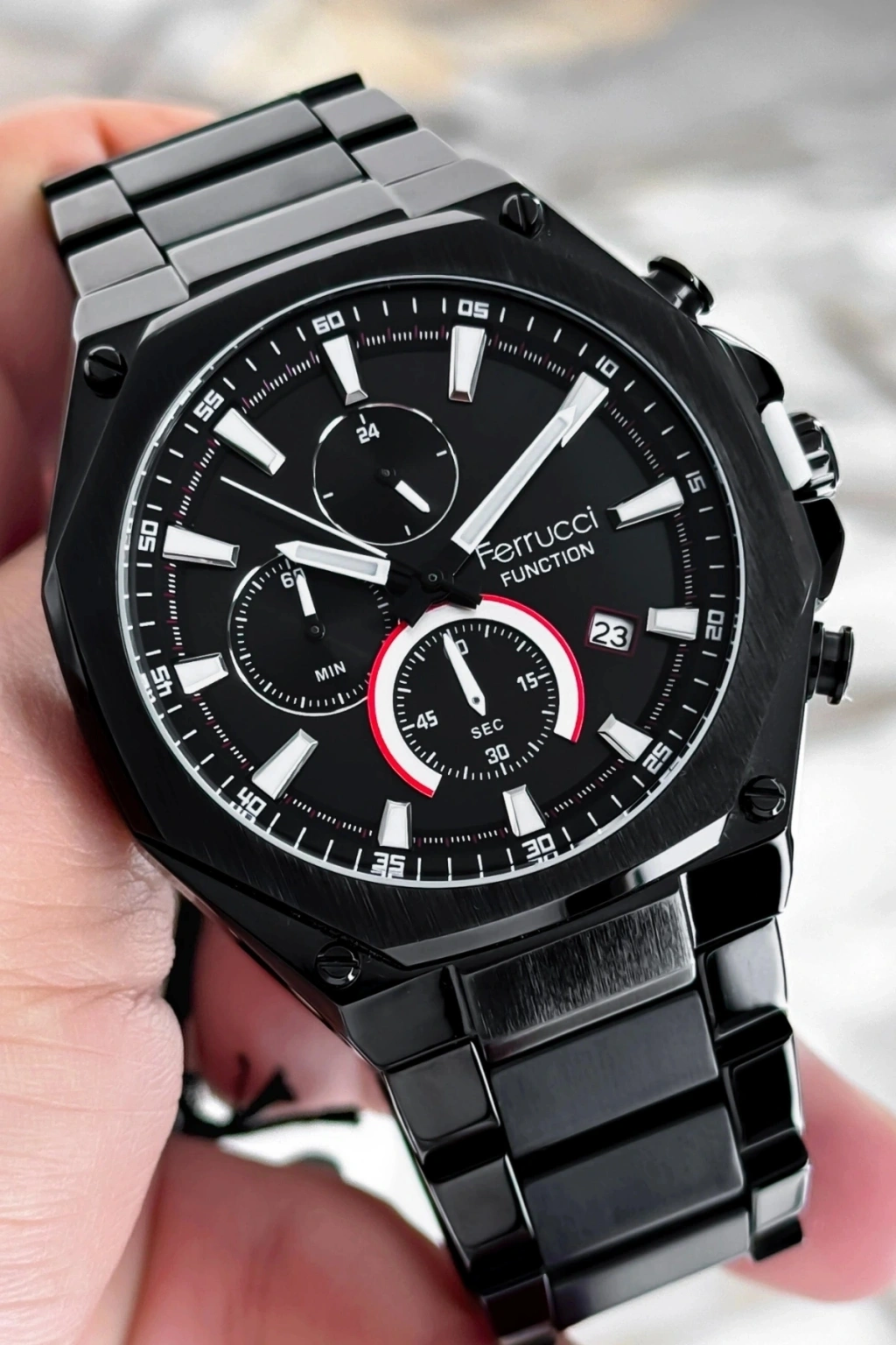 Ferrucci Marka Çelik Kordon Tüm Fonksiyonlar Aktif Erkek Kol Saati; Ferrucci marka çelik kordon tüm fonksiyonlar aktif erkek kol saati, şıklığı ve işlevselliği bir araya getiren birinci sınıf bir aksesuardır. Bu saat, kusursuz bir tasarıma sahip olan 44mm çelik kasası ve çelik kordonuyla öne çıkar. Dayanıklı yapısı ve çekici görünümüyle dikkatleri üzerinize çekmek için ideal bir seçenektir. Ayrıca, 3 atm suya dayanıklılık özelliğiyle, günlük aktivitelerinizde rahatlıkla kullanabilirsiniz.; Bu özel saat, sadece zamanı göstermekle kalmaz, aynı zamanda bir dizi fonksiyonu da aktif olarak sunar. Tarih göstergesi ile günlük takvim ihtiyaçlarınızı kolaylıkla karşılayabilirsiniz. sizi önemli randevularınız veya etkinlikleriniz hakkında bilgilendirirken, dünya saati özelliği de farklı zaman dilimlerindeki saatleri takip etmenize yardımcı olur. Bu şekilde, pratik ve işlevsel bir deneyim sunar.; Ferrucci marka çelik kordon tüm fonksiyonlar aktif erkek kol saati, yüksek kalite standartlarına uygun olarak üretilmiştir. Saat, dayanıklı çelik kasa ve çelik kordon ile uzun ömürlü bir kullanım sunar. Aynı zamanda, çelik malzeme kolayca temizlenir ve çizilmelere karşı dirençlidir. Bu sayede saat, uzun süre boyunca günlük kullanıma dayanıklıdır.; Ferrucci marka çelik kordon tüm fonksiyonlar aktif erkek kol saati, orijinal Ferrucci marka bir üründür ve 2 yıl garanti kapsamındadır. Bu garanti, ürününüzde herhangi bir imalat hatası veya işlevsellik sorunu olması durumunda size güvence sağlar.; Tarzınızı yansıtmak ve her anınızda şıklığı hissetmek için Ferrucci marka çelik kordon tüm fonksiyonlar aktif erkek kol saati mükemmel bir seçimdir. Güvenilirlik, işlevsellik ve şıklık beklentilerinizi karşılamak için tasarlanmıştır.;