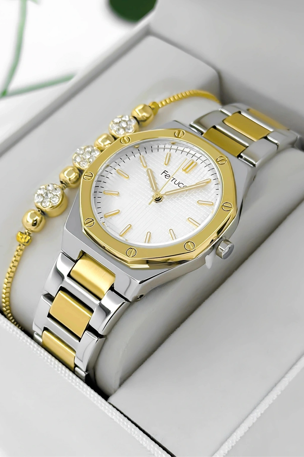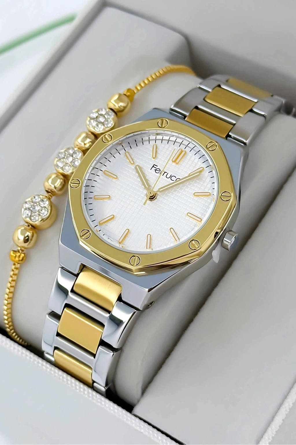 Ferrucci Kadın Kol Saati, zamansız tasarımı ve çelik dayanıklılığı ile her tarza uyum sağlayan bir aksesuar olarak öne çıkıyor. Beyaz kadranıyla minimal ve sofistike bir görünüm sunan bu model, çelik kasa ve kordonuyla hem dayanıklılığı hem de estetiği bir arada sunuyor. Modern bir tarza sahip olmak isteyen kadınlar için mükemmel bir seçimdir.