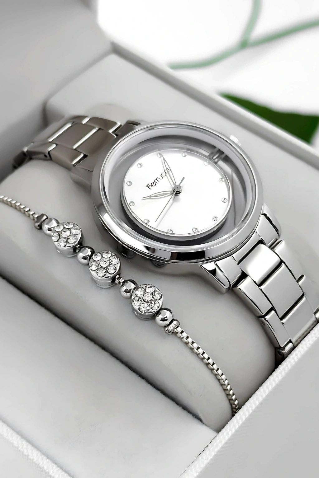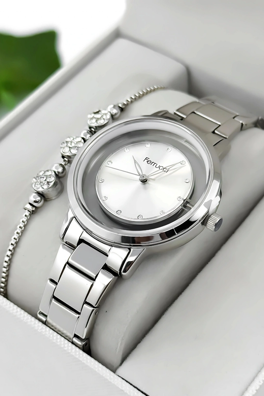 Ferrucci Çelik Kordon & Kasa Kadın Kol Saati, Şeffaf Arka Cam Kapak Gümüş Sdfer180