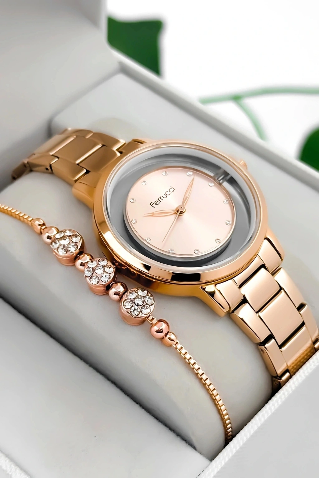 Çelik Kordon & Kasa Kadın Kol Saati, Şeffaf Arka Cam Kapak Rose Sdfer180