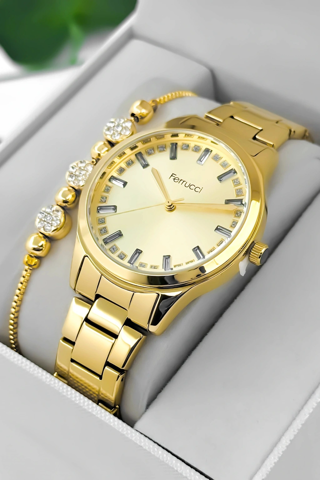 Ferrucci Çelik Kordon & Kasa Kadın Kol Saati, Taş Detaylı Kadran Gold Sdfer181
