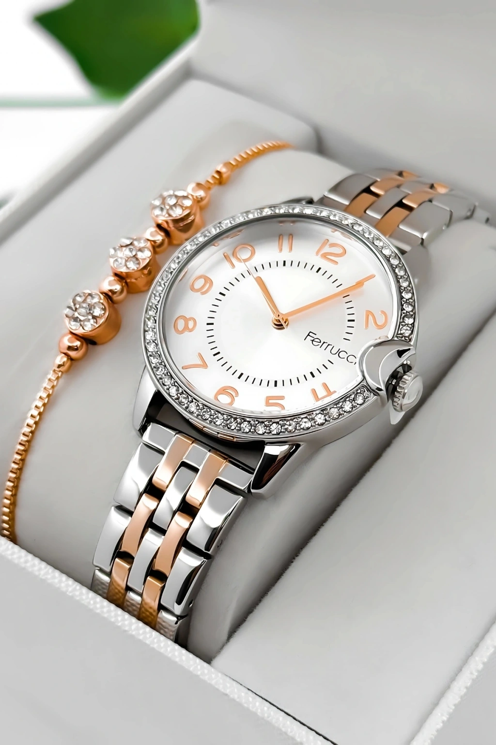 Ferrucci Çelik Kordon & Kasa Kadın Kol Saati, Taş Detaylı Kasa Gümüş-rose Sdfer182