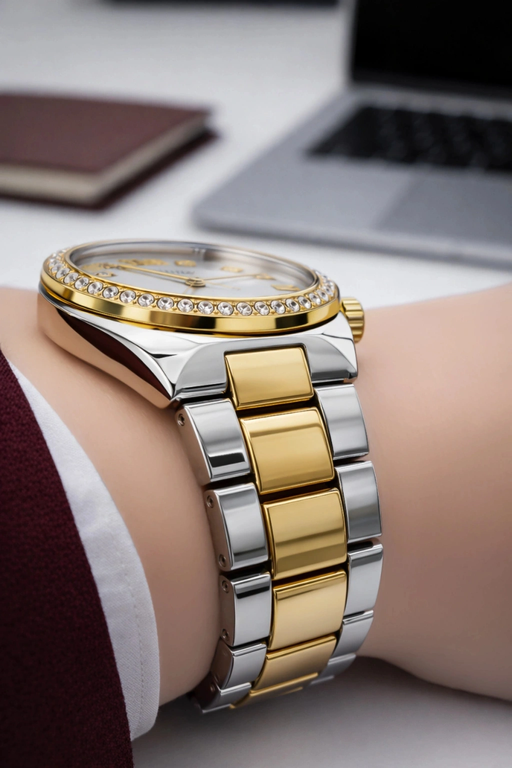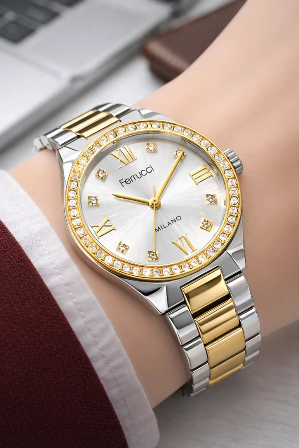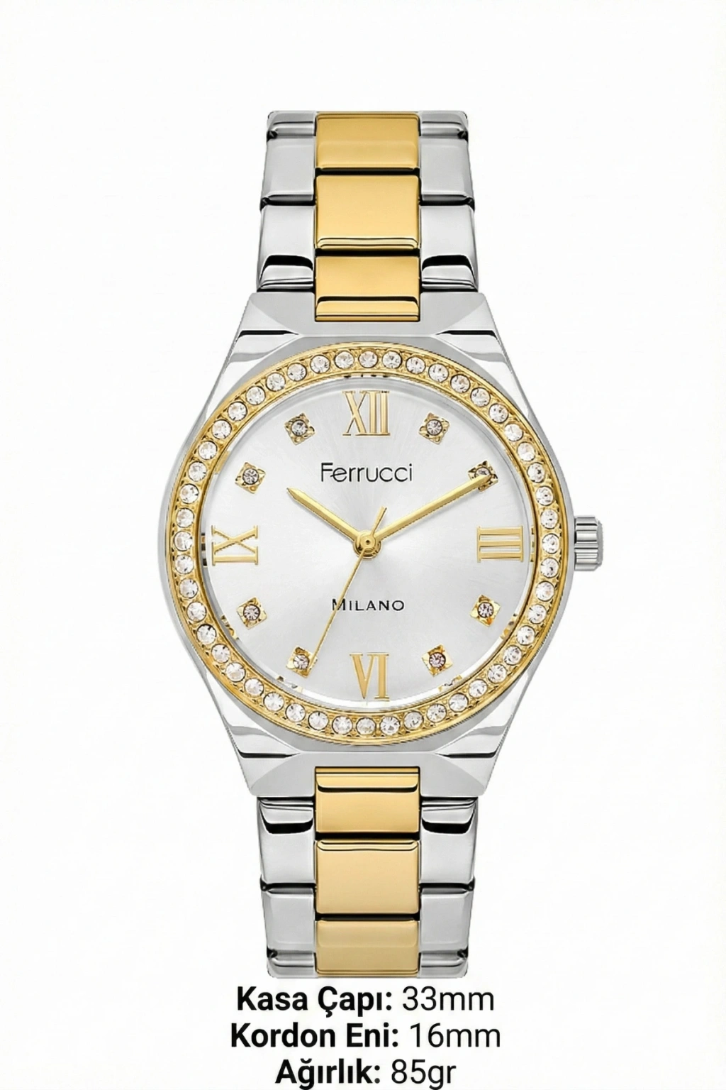 • Modelin en dikkat çekici unsurlarından biri, taşlarla çevrelenmiş bezel yapısıdır. Işığı kusursuz şekilde yansıtan bu taşlı bezel, saate mücevher etkisi kazandırarak klasik bir kol saatinden çok daha fazlasını sunar. Kadran üzerinde yer alan Roma rakamları ve taş detaylı saat indeksleri, Ferrucci Milano’nun sofistike tasarım çizgisini tamamlar. Kadran merkezinde konumlanan Ferrucci logosu ve Milano ibaresi, markanın prestijini net bir şekilde yansıtır.