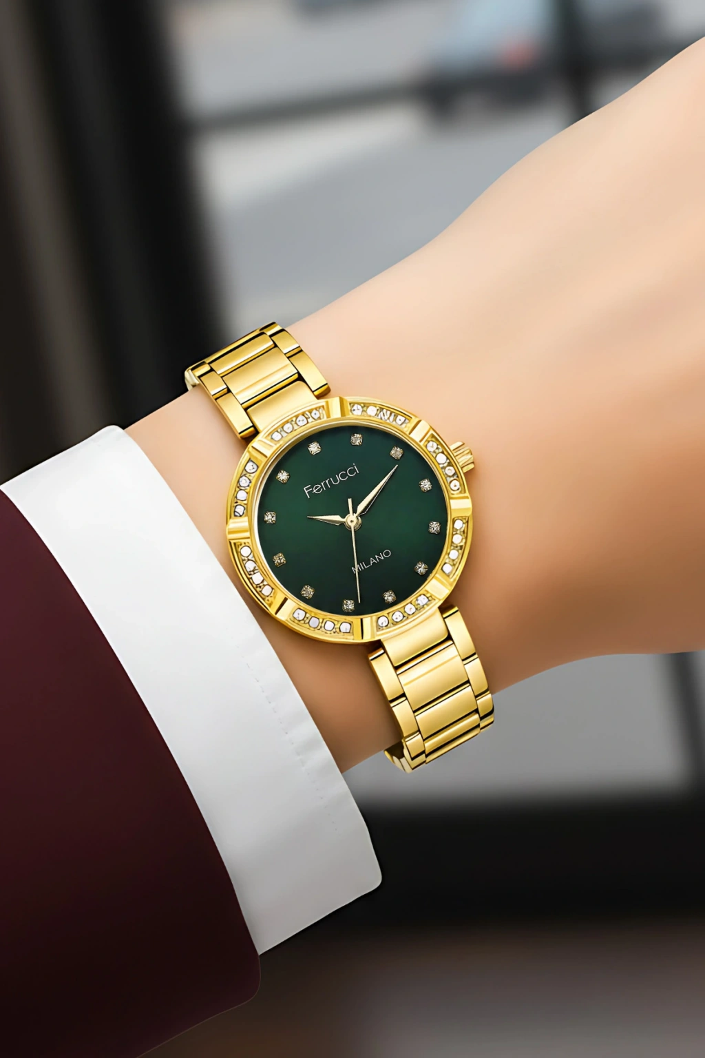 Ferrucci Çelik Kordon Taşlı Kasa Kadın Kol Saati Gold Yeşil sdfer183