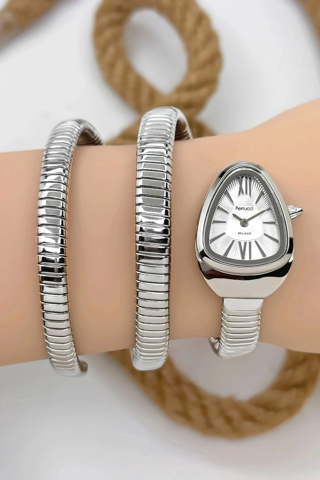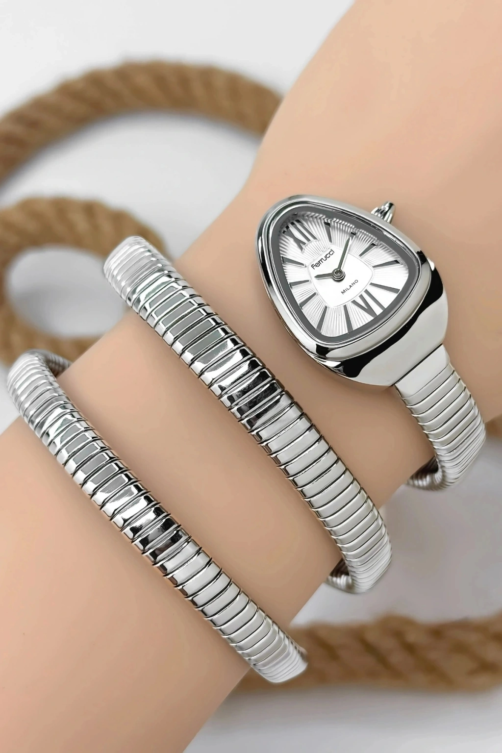 Ferrucci markasının zarif tasarım anlayışını yansıtan bu kadın kol saati, stil sahibi kadınların vazgeçilmezi olacak. Ürün, tamamen çelik kasa ve çelik kordonu ile dikkat çekerken, özgün yılan modeli bilezik tasarımı ile her türlü kıyafetle uyum sağlayarak günün her anında sizinle. Metalik parıltısı ve şık tasarımı, günlük kullanımdan özel davetlere kadar her ortamda göz kamaştırmanızı sağlar.