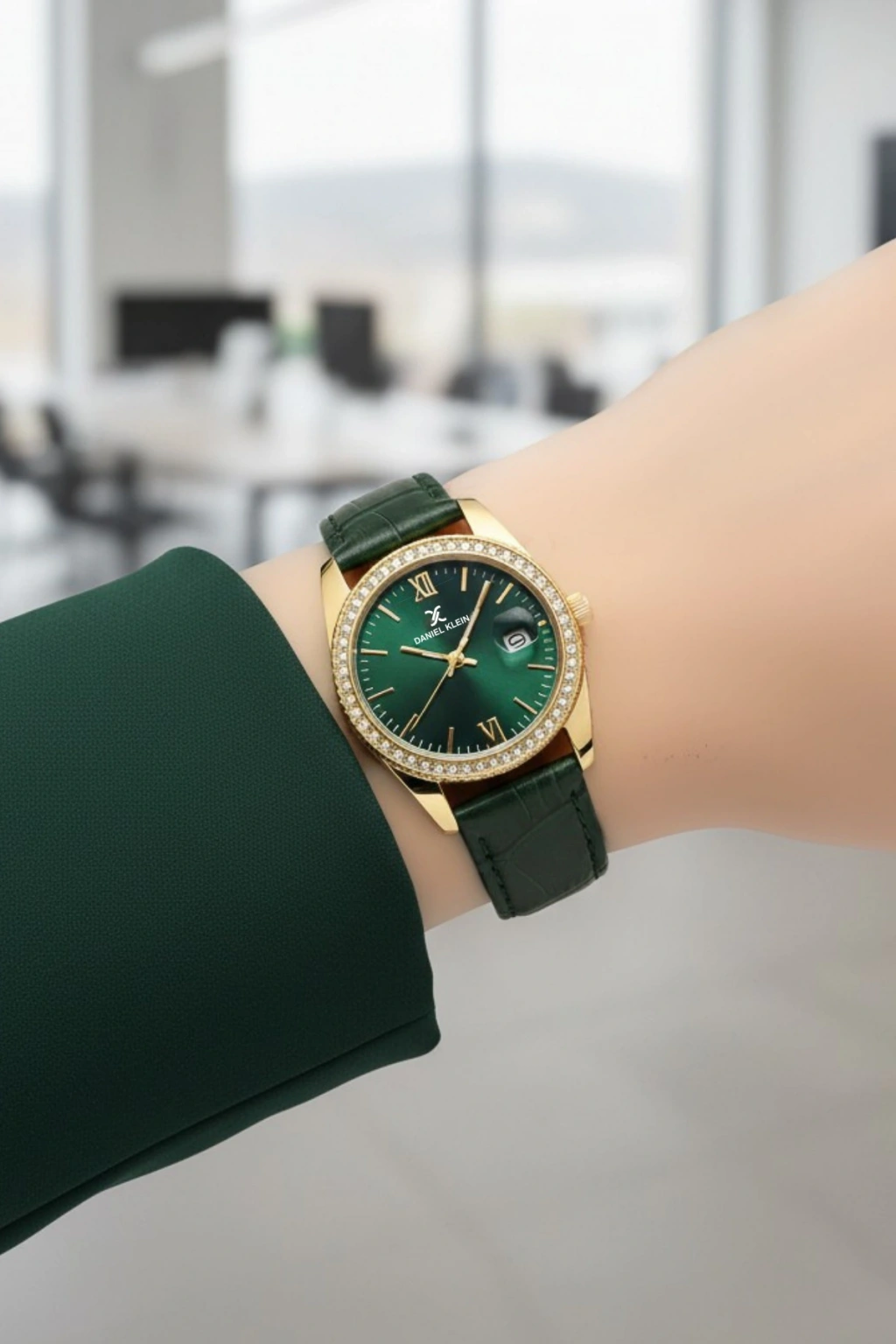 Deri Kordon Çelik Kasa Kadın Kol Saati+Bileklik Hediyeli Yeşil-Gold sddk107