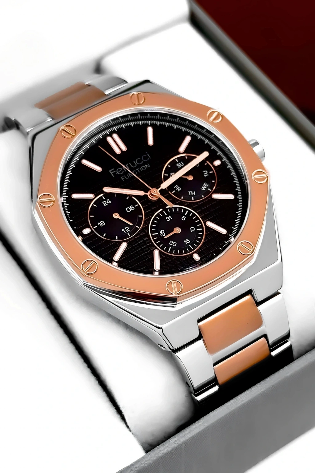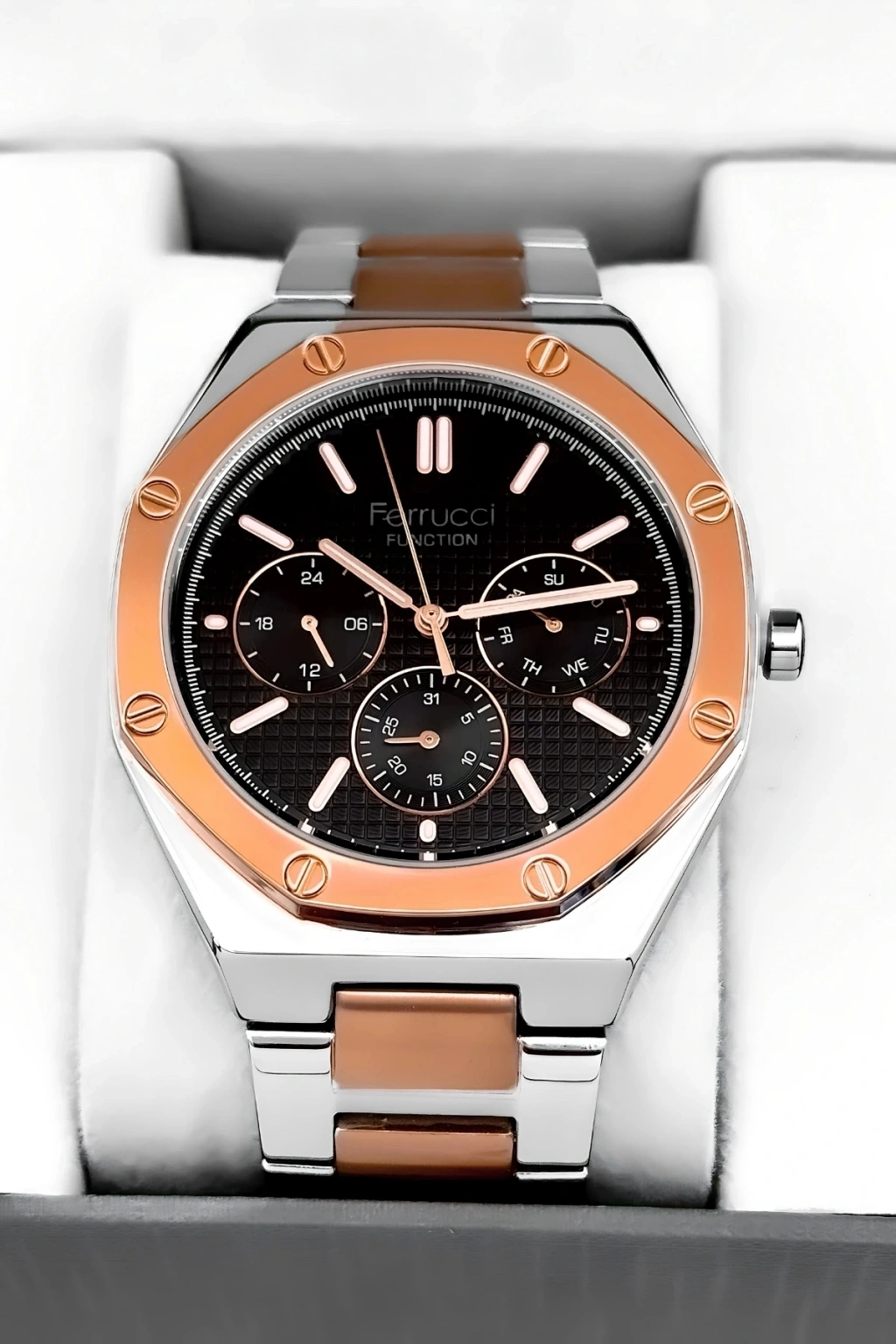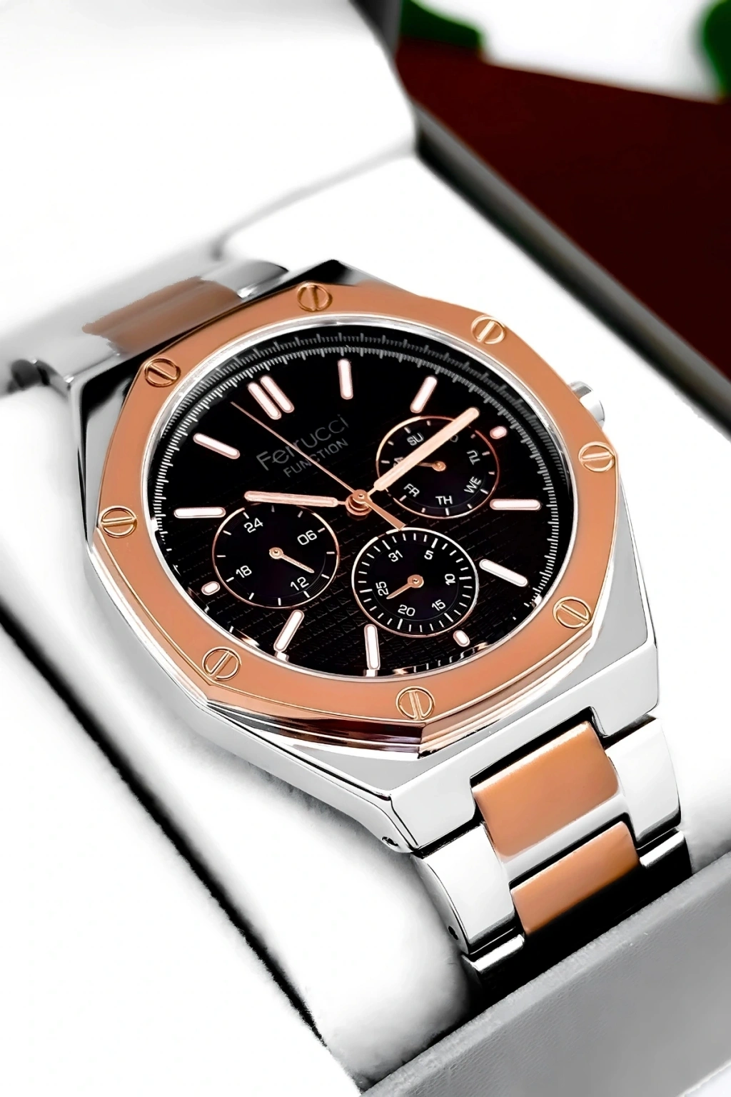 Ferrucci Marka Erkek Kol Saati, şıklığı ve işlevselliği bir araya getiren mükemmel bir aksesuardır.; Bu saat, dayanıklı çelik kordon ve çelik kasa ile üretilmiştir ve uzun ömürlü bir kullanım sağlar.; Saatin tüm fonksiyonları aktif olarak çalışır ve size zamanı takip etmekle kalmaz, aynı zamanda takvim, kronograf ve diğer özelliklerle de yardımcı olur.; Saatin su geçirmezlik özelliği, 3 atm'ye kadar dayanıklıdır, böylece günlük yaşamınızda hafif su temaslarına dayanabilir.; Ancak, havuz, deniz veya duş gibi su altı etkinlikleri için uygun değildir ve bu tür durumlarda kullanılmamalıdır.; Ferrucci Marka Erkek Kol Saati, ürün garantisiyle birlikte gelir ve tüm ürünlerimiz 2 yıl garantilidir.; Bu garanti, saatinizin herhangi bir üretim hatası veya arızası durumunda size tam koruma sağlar.; Ayrıca, ürün faturası da size sağlanır ve faturanızı e-posta adresinize göndeririz.; Bu sayede, faturayı saklayabilir ve garanti süresi boyunca herhangi bir sorun yaşarsanız kolayca iletişime geçebilirsiniz.; Ferrucci Marka Erkek Kol Saati, tüm siparişlerde özel hediye paketiyle gönderilir.; Böylece, saatinizin güvenli ve zarif bir şekilde size ulaşmasını sağlarız.; Ürünümüz, dikkatlice paketlenir ve taşınma sırasında herhangi bir hasara karşı korunaklı hale getirilir.; Bu da size mükemmel bir alışveriş deneyimi sunar.; Saat, şık ve modern tasarımıyla dikkat çeker ve herhangi bir kıyafete zarif bir tamamlayıcıdır.; Ferrucci Marka Erkek Kol Saati, günlük kullanım için idealdir ve aynı zamanda özel etkinliklerde de şıklığınızı tamamlar.; Saat, hassas bir şekilde işlenmiş detayları ve kaliteli malzemeleriyle dikkat çeker.; Çelik kordon, sağlamlığı ve şıklığı bir araya getirerek saate zarafet katarken, çelik kasa da saatin dayanıklılığını artırır.; Bu saat, size hem stil hem de sağlamlık sunar.; Ferrucci Marka Erkek Kol Saati, kullanımı kolay bir kadran düzenine sahiptir ve kolayca okunabilir bir şekilde zamanı gösterir.; Ayrıca, saatin takvim ve kronograf gibi ek fonksiyonları da mevcuttur.; Saat, güçlü bir pil mekanizmasıyla çalışır ve size uzun süreli kullanım sunar.; Ferrucci Marka Erkek Kol Saati, birinci sınıf kalite standartlarına uygun olarak üretilmiştir.; Üretim sürecinde titizlikle incelenen her detay, üstün bir saat deneyimi sunmak için tasarlanmıştır.; Bu saat, tarzınızı tamamlayacak bir aksesuar arayan erkekler için mükemmel bir seçimdir.; Ferrucci Marka Erkek Kol Saati, kendiniz veya sevdikleriniz için harika bir hediye seçeneğidir.; Özel kutusunda sunulan saat, hediye alıcısına özel bir his yaşatır ve beğenisini kazanır.; Saat, şıklığı ve işlevselliği bir araya getirerek mükemmel bir denge sağlar.; Ferrucci Marka Erkek Kol Saati, her anı tamamlayacak ve stilinizi yansıtacak mükemmel bir aksesuardır.; Siparişinizi hemen verin ve bu eşsiz saatin keyfini çıkarın!; Ferrucci Marka Erkek Kol Saati, en üstün kalite standartlarına sahip bir saat olup, size uzun yıllar boyunca güvenilir bir performans sunar.;