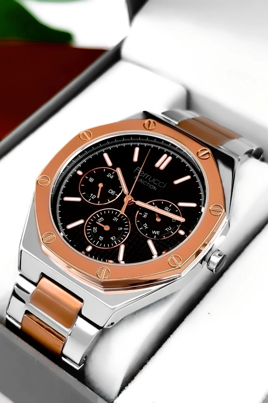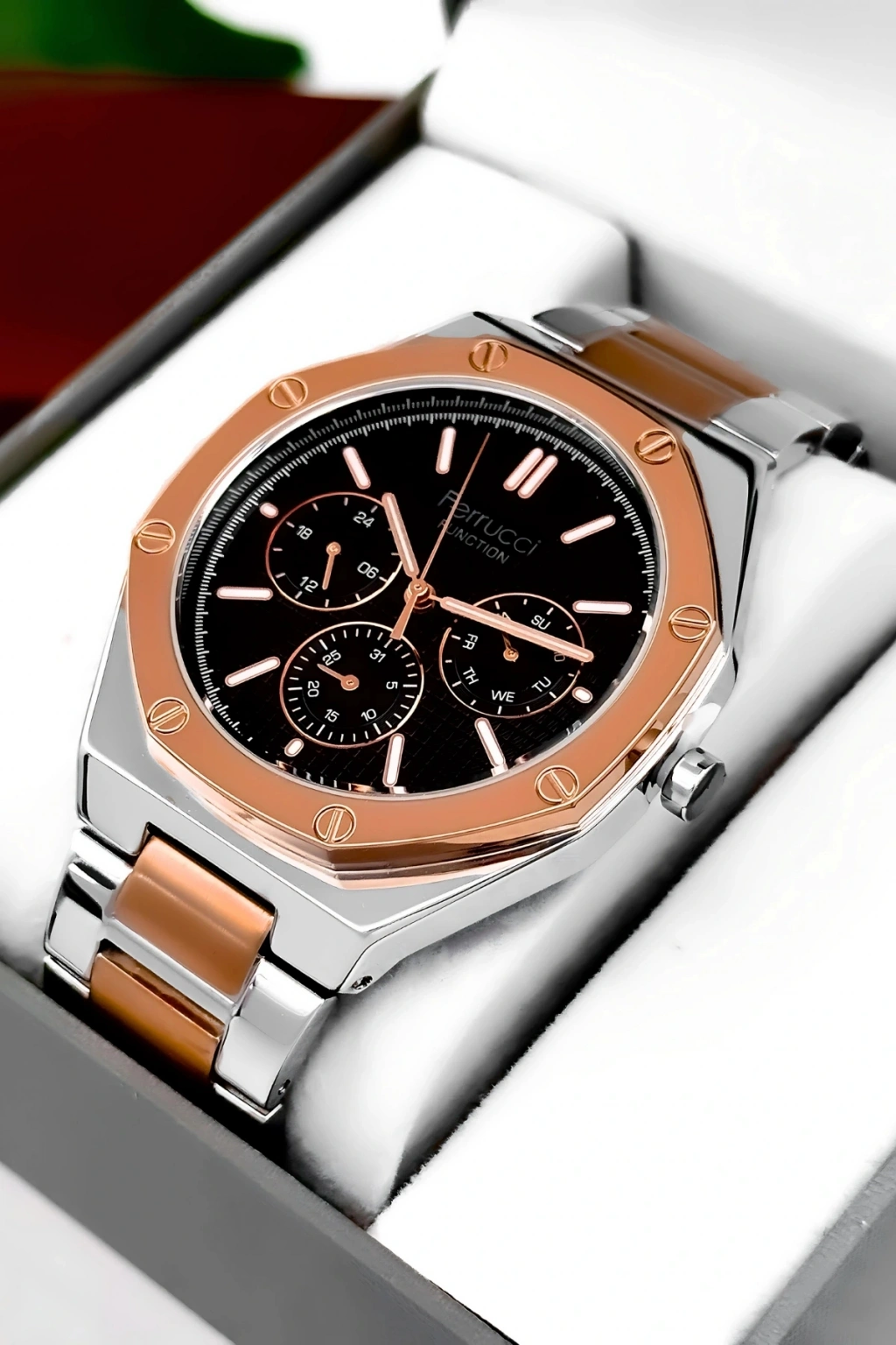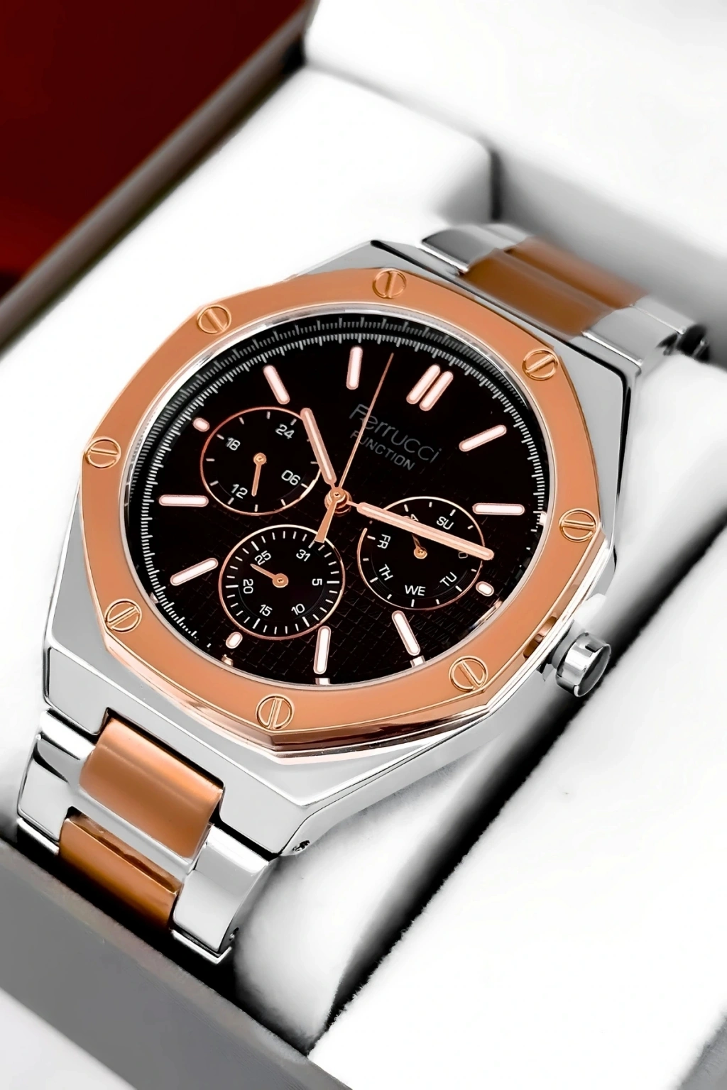 Ferrucci Marka Erkek Kol Saati, şıklığı ve işlevselliği bir araya getiren mükemmel bir aksesuardır.; Bu saat, dayanıklı çelik kordon ve çelik kasa ile üretilmiştir ve uzun ömürlü bir kullanım sağlar.; Saatin tüm fonksiyonları aktif olarak çalışır ve size zamanı takip etmekle kalmaz, aynı zamanda takvim, kronograf ve diğer özelliklerle de yardımcı olur.; Saatin su geçirmezlik özelliği, 3 atm'ye kadar dayanıklıdır, böylece günlük yaşamınızda hafif su temaslarına dayanabilir.; Ancak, havuz, deniz veya duş gibi su altı etkinlikleri için uygun değildir ve bu tür durumlarda kullanılmamalıdır.; Ferrucci Marka Erkek Kol Saati, ürün garantisiyle birlikte gelir ve tüm ürünlerimiz 2 yıl garantilidir.; Bu garanti, saatinizin herhangi bir üretim hatası veya arızası durumunda size tam koruma sağlar.; Ayrıca, ürün faturası da size sağlanır ve faturanızı e-posta adresinize göndeririz.; Bu sayede, faturayı saklayabilir ve garanti süresi boyunca herhangi bir sorun yaşarsanız kolayca iletişime geçebilirsiniz.; Ferrucci Marka Erkek Kol Saati, tüm siparişlerde özel hediye paketiyle gönderilir.; Böylece, saatinizin güvenli ve zarif bir şekilde size ulaşmasını sağlarız.; Ürünümüz, dikkatlice paketlenir ve taşınma sırasında herhangi bir hasara karşı korunaklı hale getirilir.; Bu da size mükemmel bir alışveriş deneyimi sunar.; Saat, şık ve modern tasarımıyla dikkat çeker ve herhangi bir kıyafete zarif bir tamamlayıcıdır.; Ferrucci Marka Erkek Kol Saati, günlük kullanım için idealdir ve aynı zamanda özel etkinliklerde de şıklığınızı tamamlar.; Saat, hassas bir şekilde işlenmiş detayları ve kaliteli malzemeleriyle dikkat çeker.; Çelik kordon, sağlamlığı ve şıklığı bir araya getirerek saate zarafet katarken, çelik kasa da saatin dayanıklılığını artırır.; Bu saat, size hem stil hem de sağlamlık sunar.; Ferrucci Marka Erkek Kol Saati, kullanımı kolay bir kadran düzenine sahiptir ve kolayca okunabilir bir şekilde zamanı gösterir.; Ayrıca, saatin takvim ve kronograf gibi ek fonksiyonları da mevcuttur.; Saat, güçlü bir pil mekanizmasıyla çalışır ve size uzun süreli kullanım sunar.; Ferrucci Marka Erkek Kol Saati, birinci sınıf kalite standartlarına uygun olarak üretilmiştir.; Üretim sürecinde titizlikle incelenen her detay, üstün bir saat deneyimi sunmak için tasarlanmıştır.; Bu saat, tarzınızı tamamlayacak bir aksesuar arayan erkekler için mükemmel bir seçimdir.; Ferrucci Marka Erkek Kol Saati, kendiniz veya sevdikleriniz için harika bir hediye seçeneğidir.; Özel kutusunda sunulan saat, hediye alıcısına özel bir his yaşatır ve beğenisini kazanır.; Saat, şıklığı ve işlevselliği bir araya getirerek mükemmel bir denge sağlar.; Ferrucci Marka Erkek Kol Saati, her anı tamamlayacak ve stilinizi yansıtacak mükemmel bir aksesuardır.; Siparişinizi hemen verin ve bu eşsiz saatin keyfini çıkarın!; Ferrucci Marka Erkek Kol Saati, en üstün kalite standartlarına sahip bir saat olup, size uzun yıllar boyunca güvenilir bir performans sunar.;
