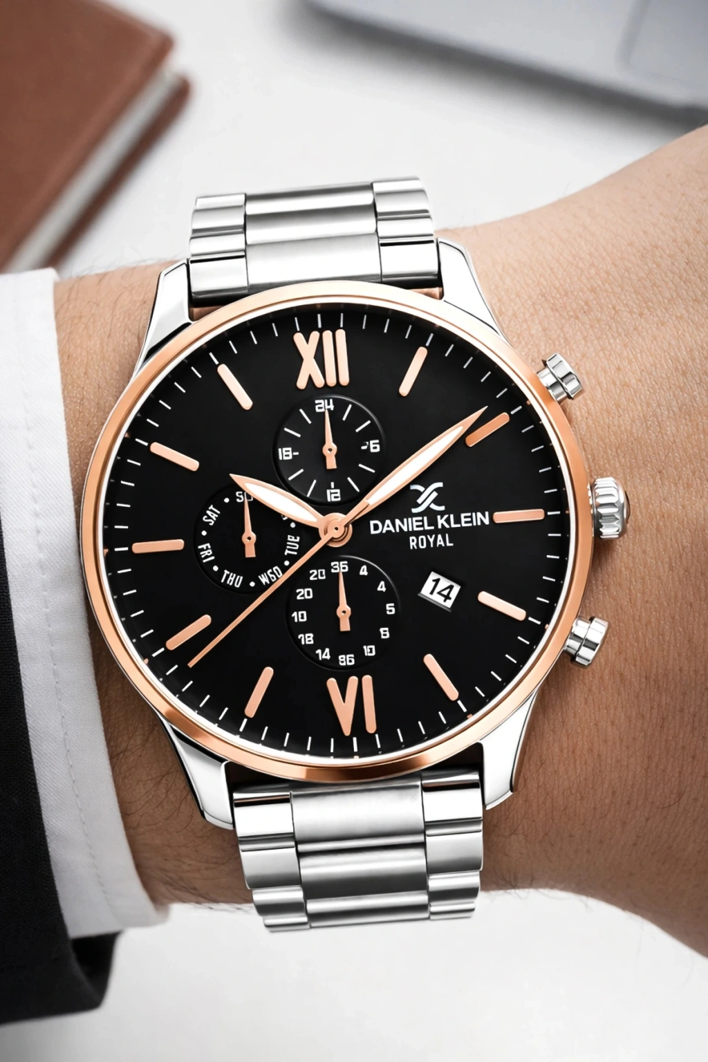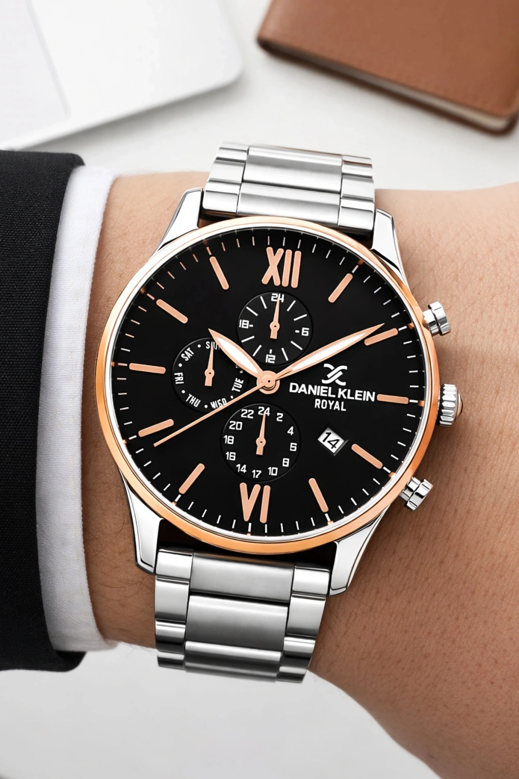 • Stil sahibi erkeklerin tercihi Daniel Klein Royal erkek kol saati, dikkat çekici siyah ve rose gold tonlarının mükemmel uyumuyla tasarlandı. Modern çizgilerle harmanlanan zarif detayları, hem klasik hem de sportif kombinlerde sofistike bir görünüm sunar.