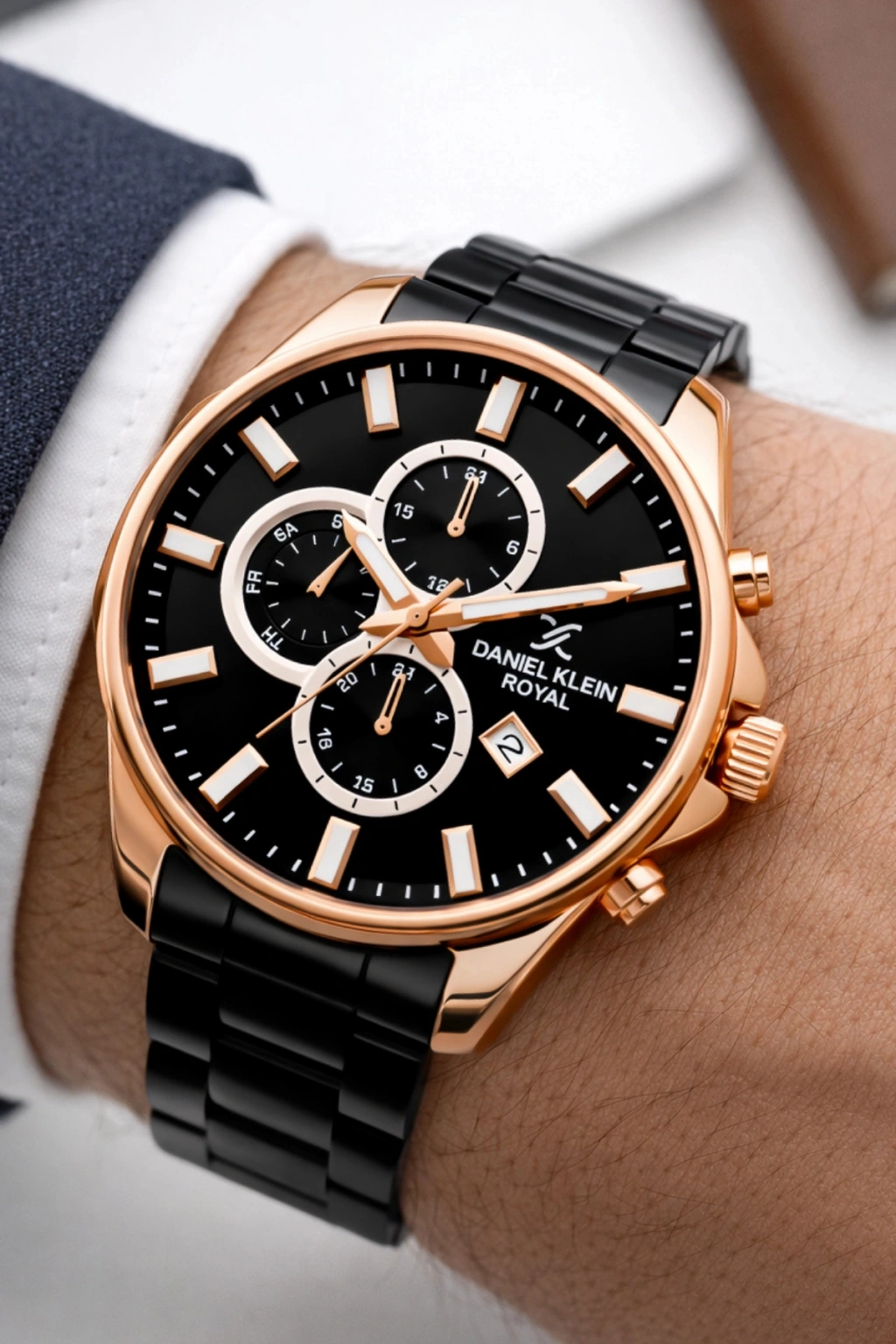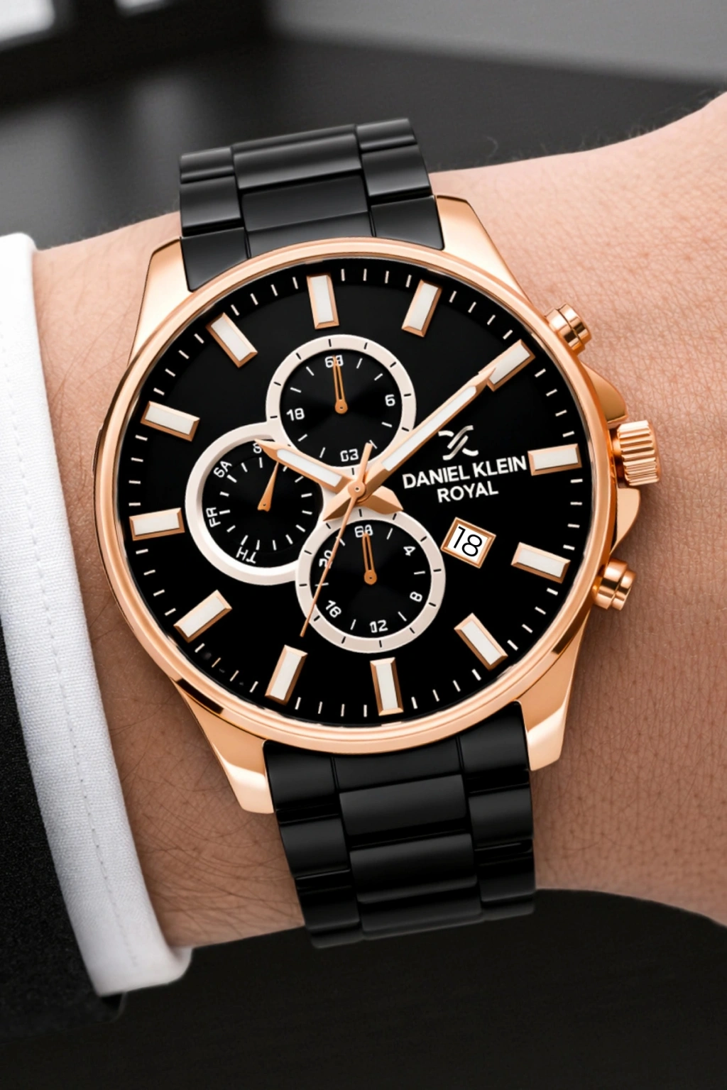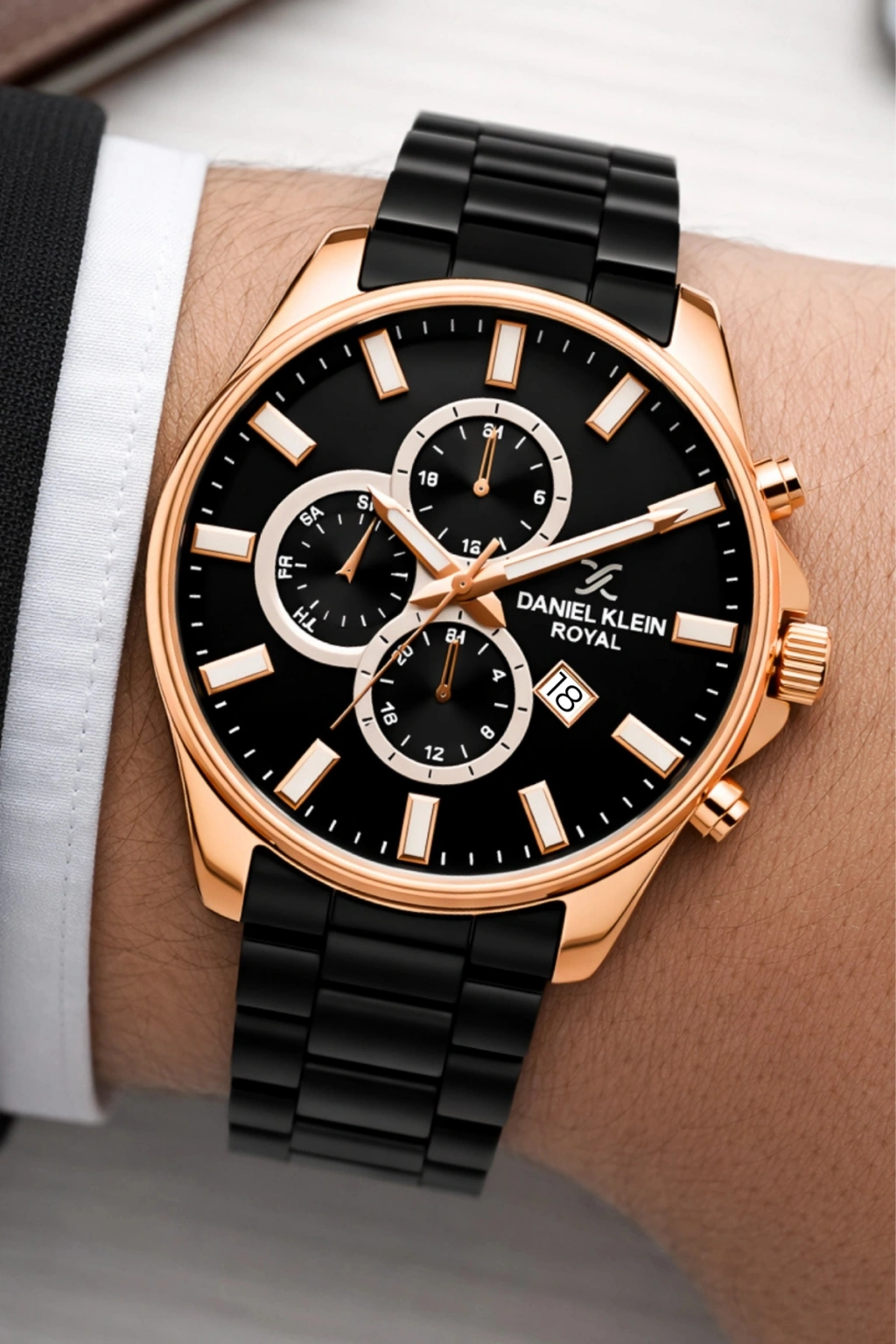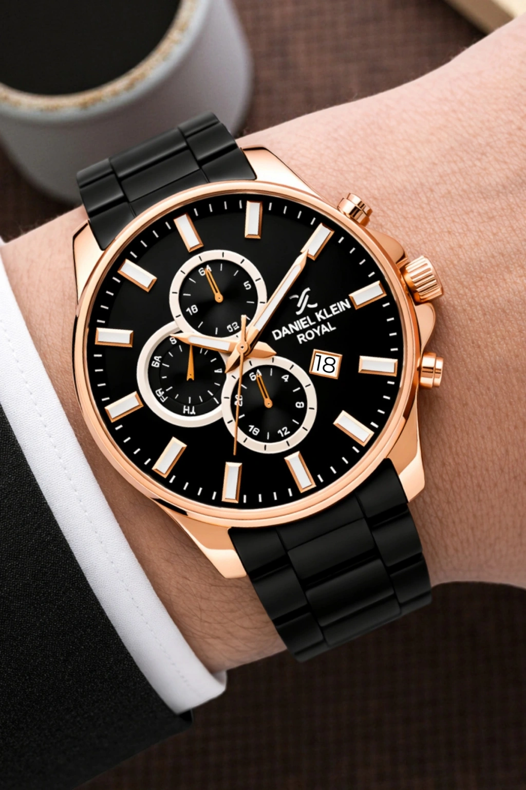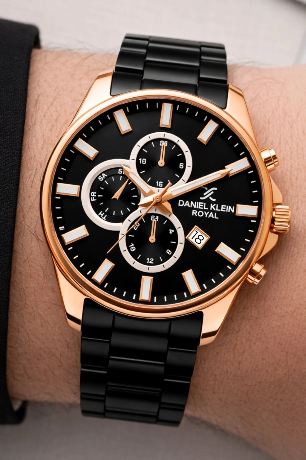 • Stil sahibi erkeklerin tercihi Daniel Klein Royal erkek kol saati, dikkat çekici siyah ve rose gold tonlarının mükemmel uyumuyla tasarlandı. Modern çizgilerle harmanlanan zarif detayları, hem klasik hem de sportif kombinlerde sofistike bir görünüm sunar.