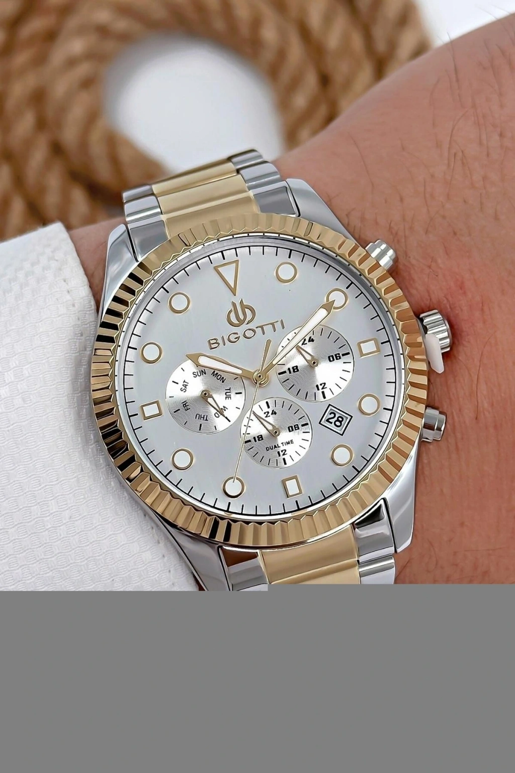 Bigotti Premium Çelik Kordon Erkek Kol Saati, şık ve modern bir tasarıma sahip.; Gümüş ve rose gold çift renk çelik kordonuyla göz alıcı bir görünüm sunuyor.; Saatin kasa rengi de rose gold, bu da saate zarif bir dokunuş katıyor.; Tüm fonksiyonları aktif şekilde kullanabilirsiniz, saatin tam performansını deneyimleyebilirsiniz.; Ürün, 3 ATM su geçirmezlik özelliğine sahiptir, günlük kullanımda suya karşı dayanıklıdır.; Ancak havuz, deniz ve duş gibi sualtı aktiviteleri için uygun değildir, bu konuda dikkatli olmanız gerekmektedir.; Bigotti Premium markası, kalite ve güvence sunan bir markadır.; Saat ve diğer ürünlerimiz garantilidir, böylece satın aldığınız ürünün sorunsuz olduğundan emin olabilirsiniz.; Ürünün orijinal olduğunu garanti ediyoruz, yani sahte bir ürün almazsınız.; Tüm siparişler hediye paketi içinde gönderilir, böylece sevdiklerinize hediye olarak da tercih edebilirsiniz.; Ürün faturaları, müşterinin sağladığı mail adresine gönderilir, bu sayede garanti ve fatura belgelerine kolayca erişebilirsiniz.; Kullanılmış ürünlerde iade seçeneği bulunmamaktadır, bu nedenle ürünü satın almadan önce dikkatlice düşünmenizi öneririz.; İade oluşturulan ürünlerde, ürün ile birlikte gönderilen tüm aksesuarlar eksiksiz şekilde geri gönderilmelidir. Bu aksesuarlar arasında kutu, çanta, koruma ambalajı gibi unsurlar yer almaktadır.; Bu şık erkek kol saati, tarzınıza ve kişisel zevkinize uygun bir seçenek olabilir.; Yüksek kaliteli malzemeler kullanılarak üretilmiştir, dayanıklı ve uzun ömürlüdür.; Saat, hem gündelik kullanım hem de özel etkinlikler için uygun bir seçimdir.; Kolay takılabilen klips sistemi sayesinde rahat bir kullanım sunar.; Saatin hassas mekanizması, doğru ve kesintisiz zaman tutma sağlar.; Bigotti Premium markası, müşteri memnuniyetine önem veren bir markadır ve ürün kalitesine güvenmektedir.; Bu özel erkek kol saati, tarzınıza şıklık ve zarafet katacak;