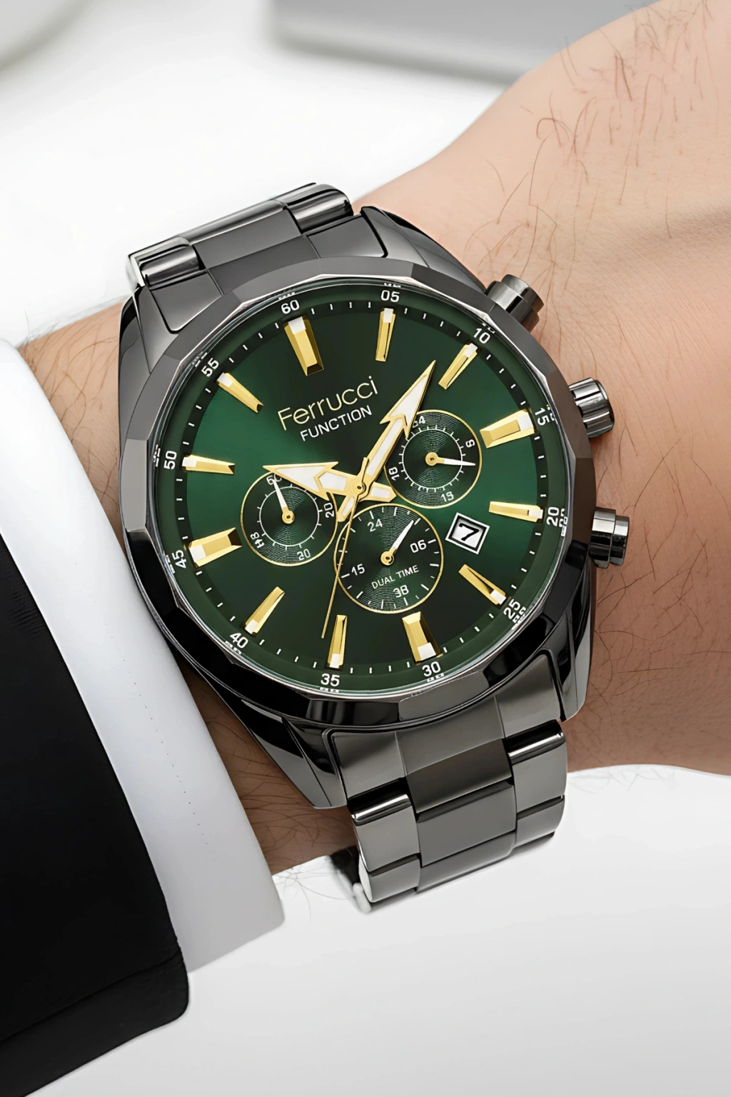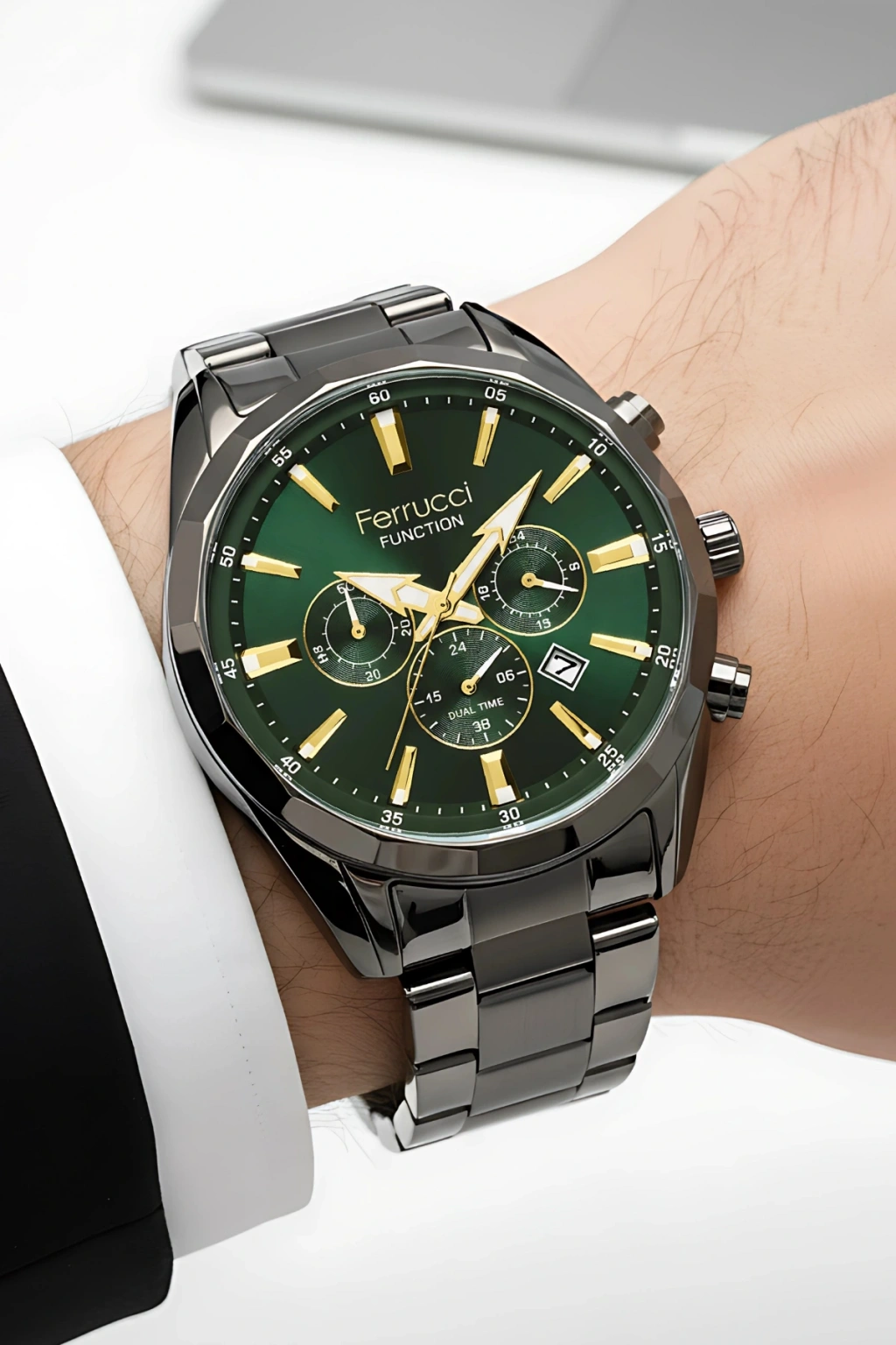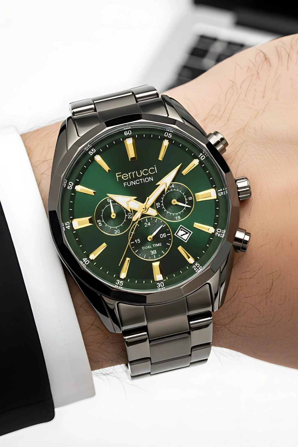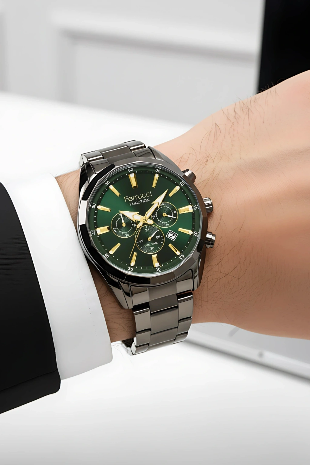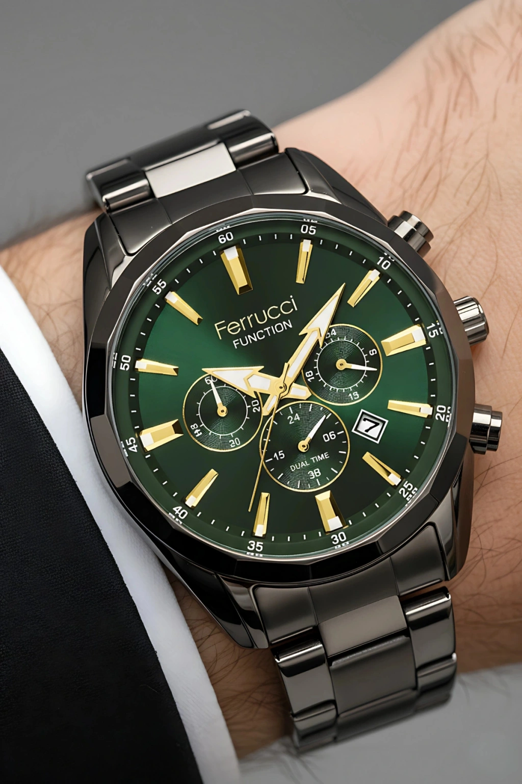 Ferrucci marka erkek kol saati, en üst düzeyde fonksiyonellik sunan bir saat modelidir.; Saatin tüm fonksiyonları aktiftir ve kullanıcılara geniş bir işlev yelpazesi sunar.; Saatin kasası ve kordonu yüksek kaliteli çelik malzemeden üretilmiştir.; Bu özel malzeme seçimi, saatin dayanıklılığını artırır ve uzun ömürlü kullanım sağlar.; Ferrucci markası tarafından sunulan bu ürün orijinaldir ve 2 yıl garanti kapsamındadır.; Saat, suya dayanıklılık konusunda 3 ATM'ye kadar koruma sunar.; Bu özelliği sayesinde saati hafif su temasına karşı koruyabilirsiniz, ancak yüzme veya dalış gibi derin su aktiviteleri için uygun değildir.; Saat, kullanıcılara hassas zaman ölçümü sağlayan güvenilir bir mekanizmaya sahiptir.; Çelik kasa, saate sağlam bir yapı ve zarif bir görünüm kazandırır.; Aynı şekilde, çelik kordon da kullanıcıya konforlu bir kullanım deneyimi sunar.; Saatin kadranı, kolay okunabilirlik için özenle tasarlanmıştır.; Büyük ve net rakamlar, saat okuma sürecini kolaylaştırır.; Kadran üzerinde bulunan işaretleyiciler, saat okuma hassasiyetini artırır.; Tarih göstergesi, günlük takvim ihtiyaçlarınızı karşılamanıza yardımcı olur.; Saatin üzerinde yer alan cam malzeme, çizilmelere karşı dayanıklıdır ve uzun süreli kullanımda netliğini korur.; Ferrucci marka erkek kol saati, işlevsellik ve kullanım kolaylığı açısından yüksek bir standarta sahiptir.; Saat, şık ve modern bir tarza sahip olmasıyla dikkat çeker.; Çelik kasa ve kordon, saatin günlük kullanıma uygunluğunu artırır.; Saat, zarif ve sofistike bir görünüm sağlayarak her türlü kıyafetle uyum sağlar.; Ferrucci markası, müşterilerine kaliteli saatler sunan güvenilir bir markadır.; Saatin mekanizması, hassas ve doğru zaman ölçümü sağlar.; Saat, günlük yaşamınızda size zamanı takip etme ve planlama konusunda yardımcı olur.; Ferrucci marka erkek kol saati, kullanıcıların stil ve şıklık konusunda bir adım öne çıkmasını sağlar.; Saatin dayanıklı yapısı, uzun süreli kullanımlarda bile performansını korur.; 2 yıl garanti, kullanıcılara ürünün kalitesine olan güveni yansıtır.; Saatin suya dayanıklılık özelliği, günlük hayatta karşılaşılan su temaslarına karşı koruma sağlar.; Kadran üzerindeki net işaretleyiciler, saatin kolaylıkla okunabilmesini sağlar.; Saatin tarih göstergesi, tarih ve gün bilgisine kolay erişim sağlar.; Ferrucci marka erkek kol saati, kullanıcılara tarzlarını ifade etme ve kişisel stilini tamamlama imkanı sunar.; Bu saat modeli, işlevsellik, dayanıklılık ve şık tasarımıyla öne çıkan bir seçenektir.;