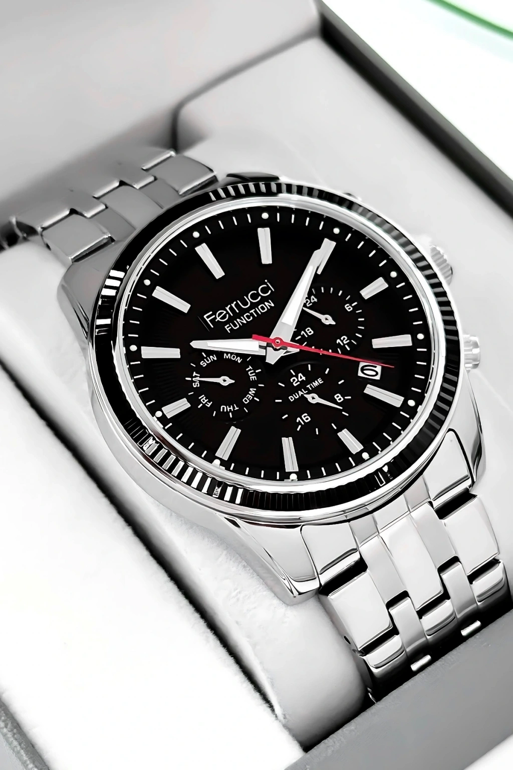 Ferrucci Takvimli Erkek Kol Saati Çelik jübile Kordon Gümüş-Siyah Bileklik Hediyeli 3atm Sdfer194