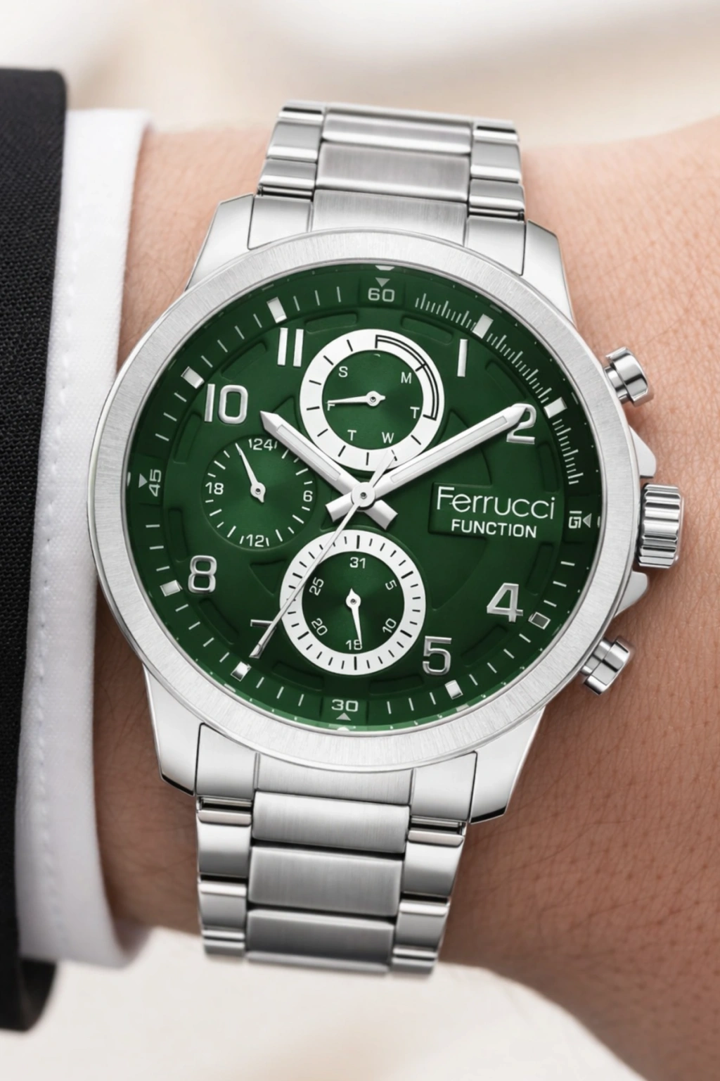 Ferrucci marka erkek kol saati, en üst düzeyde fonksiyonellik sunan bir saat modelidir.; Saatin tüm fonksiyonları aktiftir ve kullanıcılara geniş bir işlev yelpazesi sunar.; Saatin kasası ve kordonu yüksek kaliteli çelik malzemeden üretilmiştir.; Bu özel malzeme seçimi, saatin dayanıklılığını artırır ve uzun ömürlü kullanım sağlar.; Ferrucci markası tarafından sunulan bu ürün orijinaldir ve 2 yıl garanti kapsamındadır.; Saat, suya dayanıklılık konusunda 3 ATM'ye kadar koruma sunar.; Bu özelliği sayesinde saati hafif su temasına karşı koruyabilirsiniz, ancak yüzme veya dalış gibi derin su aktiviteleri için uygun değildir.; Saat, kullanıcılara hassas zaman ölçümü sağlayan güvenilir bir mekanizmaya sahiptir.; Çelik kasa, saate sağlam bir yapı ve zarif bir görünüm kazandırır.; Aynı şekilde, çelik kordon da kullanıcıya konforlu bir kullanım deneyimi sunar.; Saatin kadranı, kolay okunabilirlik için özenle tasarlanmıştır.; Büyük ve net rakamlar, saat okuma sürecini kolaylaştırır.; Kadran üzerinde bulunan işaretleyiciler, saat okuma hassasiyetini artırır.; Tarih göstergesi, günlük takvim ihtiyaçlarınızı karşılamanıza yardımcı olur.; Saatin üzerinde yer alan cam malzeme, çizilmelere karşı dayanıklıdır ve uzun süreli kullanımda netliğini korur.; Ferrucci marka erkek kol saati, işlevsellik ve kullanım kolaylığı açısından yüksek bir standarta sahiptir.; Saat, şık ve modern bir tarza sahip olmasıyla dikkat çeker.; Çelik kasa ve kordon, saatin günlük kullanıma uygunluğunu artırır.; Saat, zarif ve sofistike bir görünüm sağlayarak her türlü kıyafetle uyum sağlar.; Ferrucci markası, müşterilerine kaliteli saatler sunan güvenilir bir markadır.; Saatin mekanizması, hassas ve doğru zaman ölçümü sağlar.; Saat, günlük yaşamınızda size zamanı takip etme ve planlama konusunda yardımcı olur.; Ferrucci marka erkek kol saati, kullanıcıların stil ve şıklık konusunda bir adım öne çıkmasını sağlar.; Saatin dayanıklı yapısı, uzun süreli kullanımlarda bile performansını korur.; 2 yıl garanti, kullanıcılara ürünün kalitesine olan güveni yansıtır.; Saatin suya dayanıklılık özelliği, günlük hayatta karşılaşılan su temaslarına karşı koruma sağlar.; Kadran üzerindeki net işaretleyiciler, saatin kolaylıkla okunabilmesini sağlar.; Saatin tarih göstergesi, tarih ve gün bilgisine kolay erişim sağlar.; Ferrucci marka erkek kol saati, kullanıcılara tarzlarını ifade etme ve kişisel stilini tamamlama imkanı sunar.; Bu saat modeli, işlevsellik, dayanıklılık ve şık tasarımıyla öne çıkan bir seçenektir.;