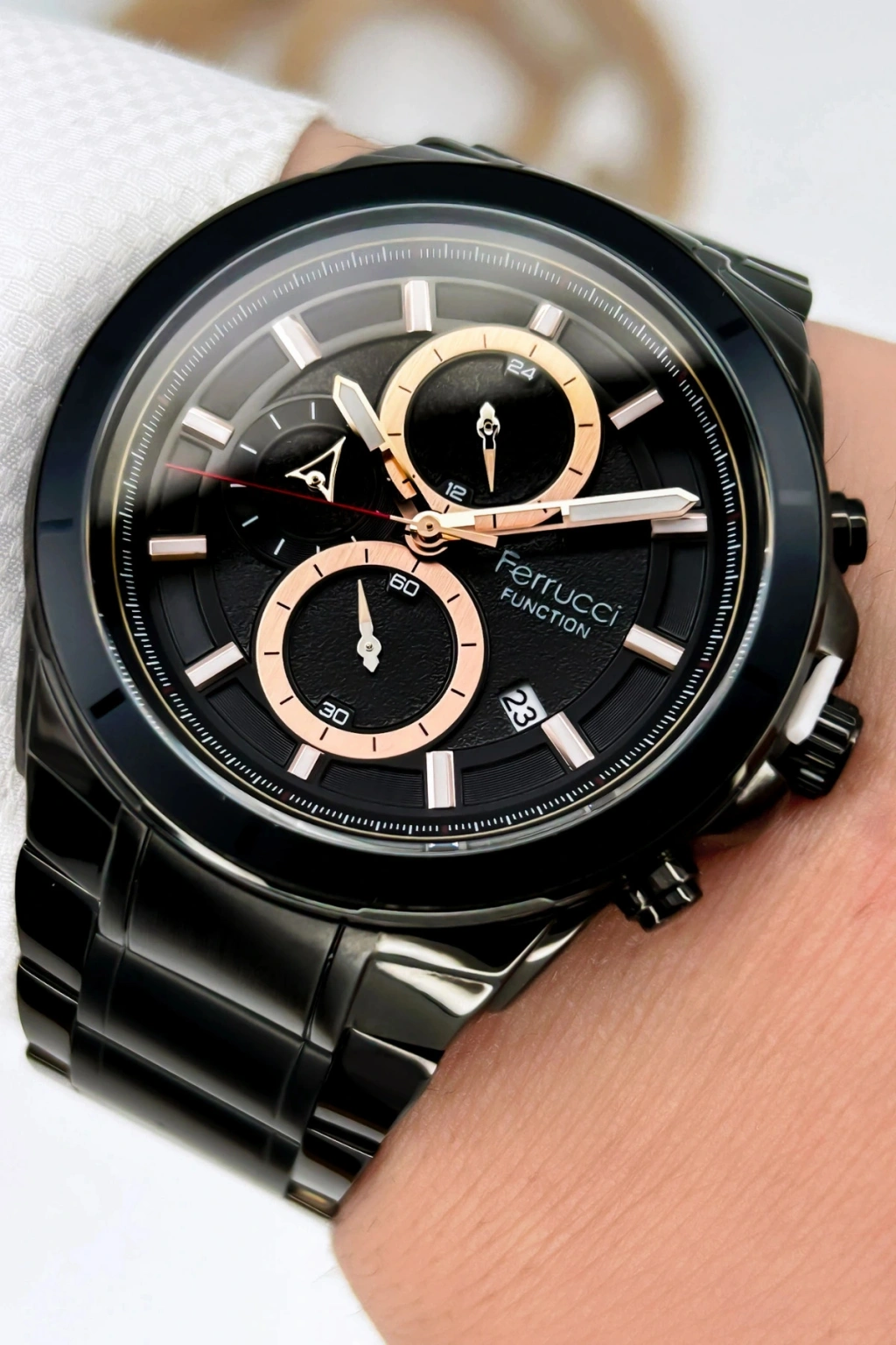 Ferrucci marka erkek kol saati, en üst düzeyde fonksiyonellik sunan bir saat modelidir.; Saatin tüm fonksiyonları aktiftir ve kullanıcılara geniş bir işlev yelpazesi sunar.; Saatin kasası ve kordonu yüksek kaliteli çelik malzemeden üretilmiştir.; Bu özel malzeme seçimi, saatin dayanıklılığını artırır ve uzun ömürlü kullanım sağlar.; Ferrucci markası tarafından sunulan bu ürün orijinaldir ve 2 yıl garanti kapsamındadır.; Saat, suya dayanıklılık konusunda 3 ATM'ye kadar koruma sunar.; Bu özelliği sayesinde saati hafif su temasına karşı koruyabilirsiniz, ancak yüzme veya dalış gibi derin su aktiviteleri için uygun değildir.; Saat, kullanıcılara hassas zaman ölçümü sağlayan güvenilir bir mekanizmaya sahiptir.; Çelik kasa, saate sağlam bir yapı ve zarif bir görünüm kazandırır.; Aynı şekilde, çelik kordon da kullanıcıya konforlu bir kullanım deneyimi sunar.; Saatin kadranı, kolay okunabilirlik için özenle tasarlanmıştır.; Büyük ve net rakamlar, saat okuma sürecini kolaylaştırır.; Kadran üzerinde bulunan işaretleyiciler, saat okuma hassasiyetini artırır.; Tarih göstergesi, günlük takvim ihtiyaçlarınızı karşılamanıza yardımcı olur.; Saatin üzerinde yer alan cam malzeme, çizilmelere karşı dayanıklıdır ve uzun süreli kullanımda netliğini korur.; Ferrucci marka erkek kol saati, işlevsellik ve kullanım kolaylığı açısından yüksek bir standarta sahiptir.; Saat, şık ve modern bir tarza sahip olmasıyla dikkat çeker.; Çelik kasa ve kordon, saatin günlük kullanıma uygunluğunu artırır.; Saat, zarif ve sofistike bir görünüm sağlayarak her türlü kıyafetle uyum sağlar.; Ferrucci markası, müşterilerine kaliteli saatler sunan güvenilir bir markadır.; Saatin mekanizması, hassas ve doğru zaman ölçümü sağlar.; Saat, günlük yaşamınızda size zamanı takip etme ve planlama konusunda yardımcı olur.; Ferrucci marka erkek kol saati, kullanıcıların stil ve şıklık konusunda bir adım öne çıkmasını sağlar.; Saatin dayanıklı yapısı, uzun süreli kullanımlarda bile performansını korur.; 2 yıl garanti, kullanıcılara ürünün kalitesine olan güveni yansıtır.; Saatin suya dayanıklılık özelliği, günlük hayatta karşılaşılan su temaslarına karşı koruma sağlar.; Kadran üzerindeki net işaretleyiciler, saatin kolaylıkla okunabilmesini sağlar.; Saatin tarih göstergesi, tarih ve gün bilgisine kolay erişim sağlar.; Ferrucci marka erkek kol saati, kullanıcılara tarzlarını ifade etme ve kişisel stilini tamamlama imkanı sunar.; Bu saat modeli, işlevsellik, dayanıklılık ve şık tasarımıyla öne çıkan bir seçenektir.;