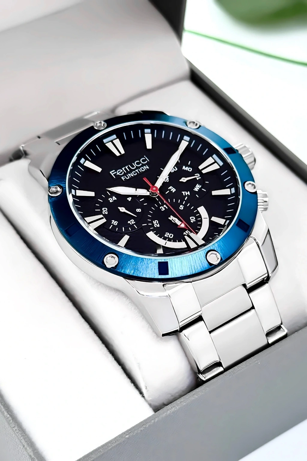 Ferrucci Marka Çelik Kordon Tüm Fonksiyonlar Aktif Erkek Kol Saati; Ferrucci marka çelik kordon tüm fonksiyonlar aktif erkek kol saati, şıklığı ve işlevselliği bir araya getiren birinci sınıf bir aksesuardır. Bu saat, kusursuz bir tasarıma sahip olan 44mm çelik kasası ve çelik kordonuyla öne çıkar. Dayanıklı yapısı ve çekici görünümüyle dikkatleri üzerinize çekmek için ideal bir seçenektir. Ayrıca, 3 atm suya dayanıklılık özelliğiyle, günlük aktivitelerinizde rahatlıkla kullanabilirsiniz.; Bu özel saat, sadece zamanı göstermekle kalmaz, aynı zamanda bir dizi fonksiyonu da aktif olarak sunar. Tarih göstergesi ile günlük takvim ihtiyaçlarınızı kolaylıkla karşılayabilirsiniz. sizi önemli randevularınız veya etkinlikleriniz hakkında bilgilendirirken, dünya saati özelliği de farklı zaman dilimlerindeki saatleri takip etmenize yardımcı olur. Bu şekilde, pratik ve işlevsel bir deneyim sunar.; Ferrucci marka çelik kordon tüm fonksiyonlar aktif erkek kol saati, yüksek kalite standartlarına uygun olarak üretilmiştir. Saat, dayanıklı çelik kasa ve çelik kordon ile uzun ömürlü bir kullanım sunar. Aynı zamanda, çelik malzeme kolayca temizlenir ve çizilmelere karşı dirençlidir. Bu sayede saat, uzun süre boyunca günlük kullanıma dayanıklıdır.; Ferrucci marka çelik kordon tüm fonksiyonlar aktif erkek kol saati, orijinal Ferrucci marka bir üründür ve 2 yıl garanti kapsamındadır. Bu garanti, ürününüzde herhangi bir imalat hatası veya işlevsellik sorunu olması durumunda size güvence sağlar.; Tarzınızı yansıtmak ve her anınızda şıklığı hissetmek için Ferrucci marka çelik kordon tüm fonksiyonlar aktif erkek kol saati mükemmel bir seçimdir. Güvenilirlik, işlevsellik ve şıklık beklentilerinizi karşılamak için tasarlanmıştır.;