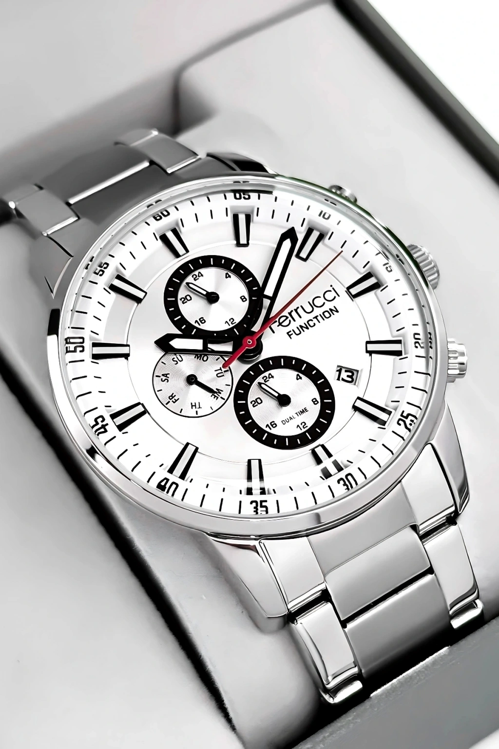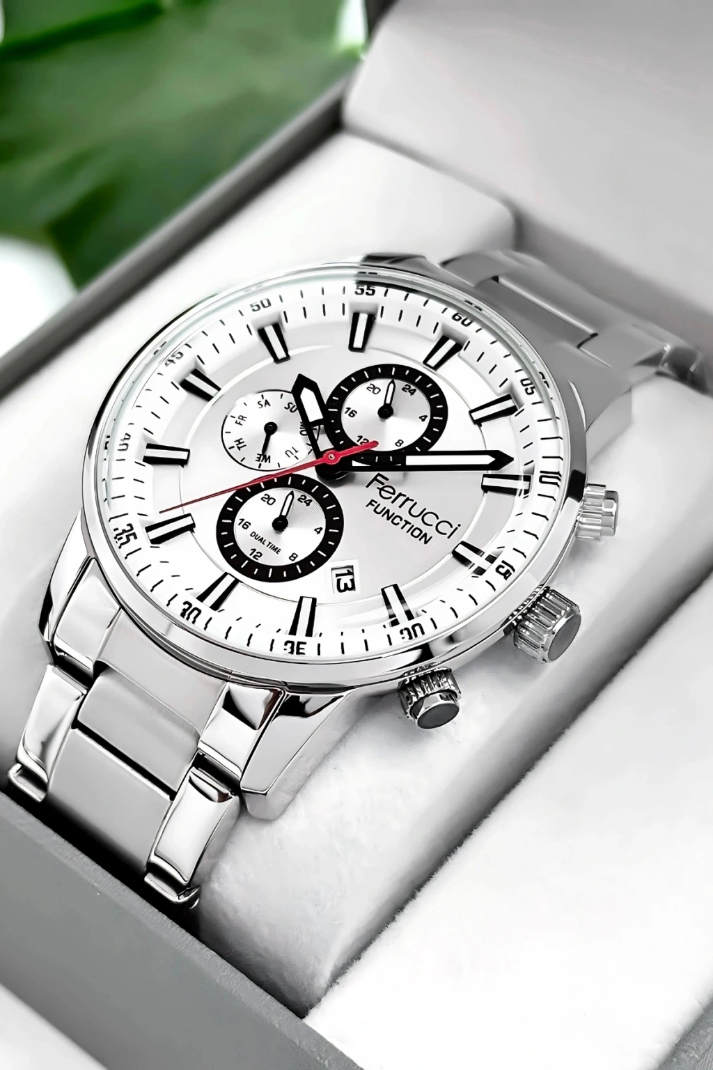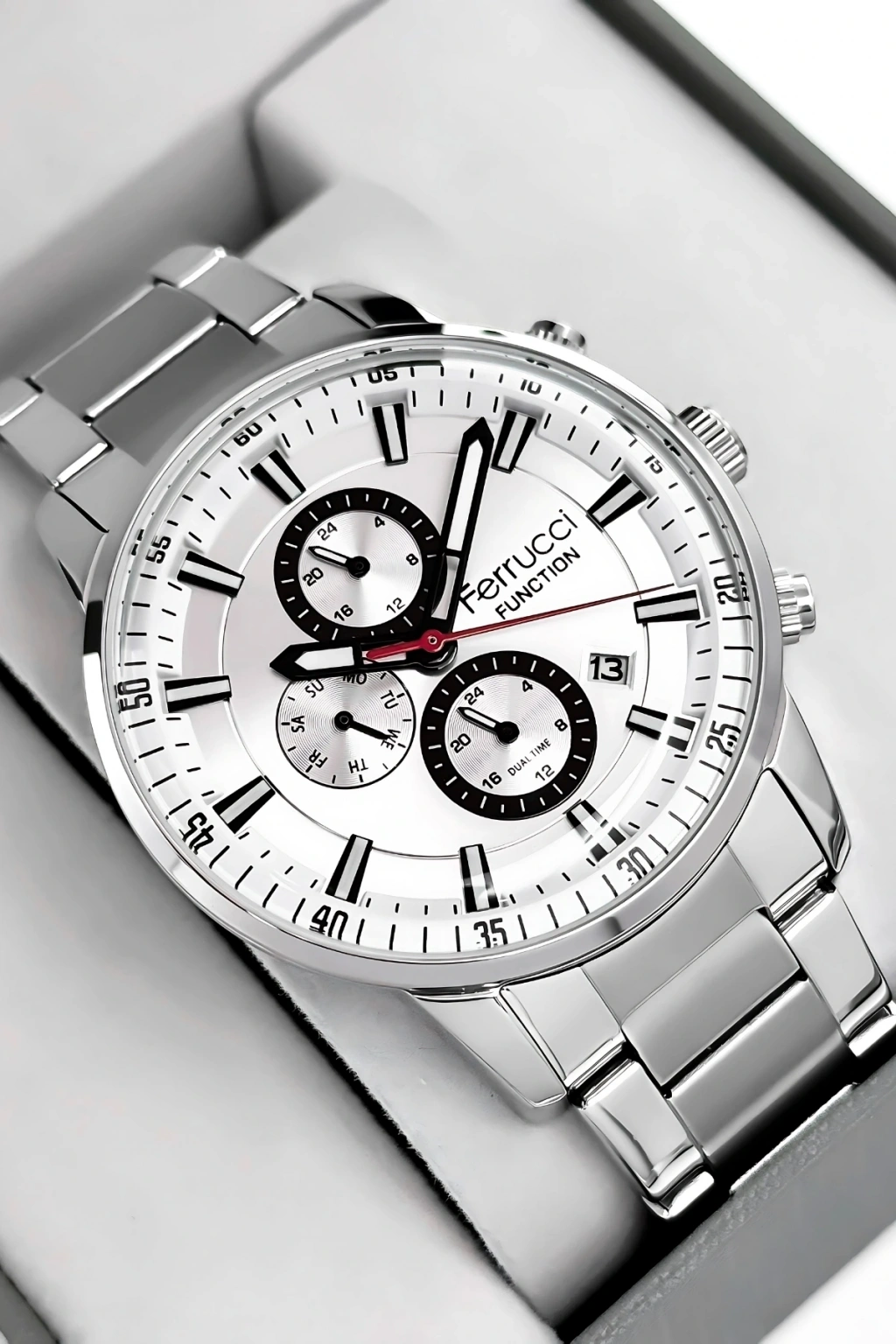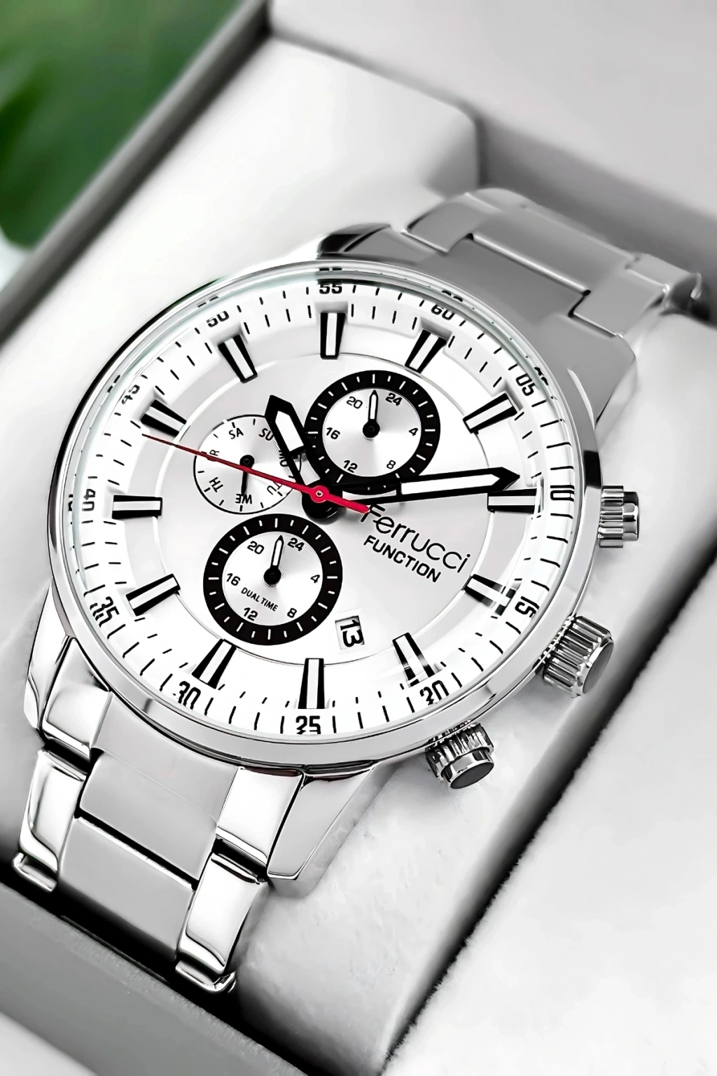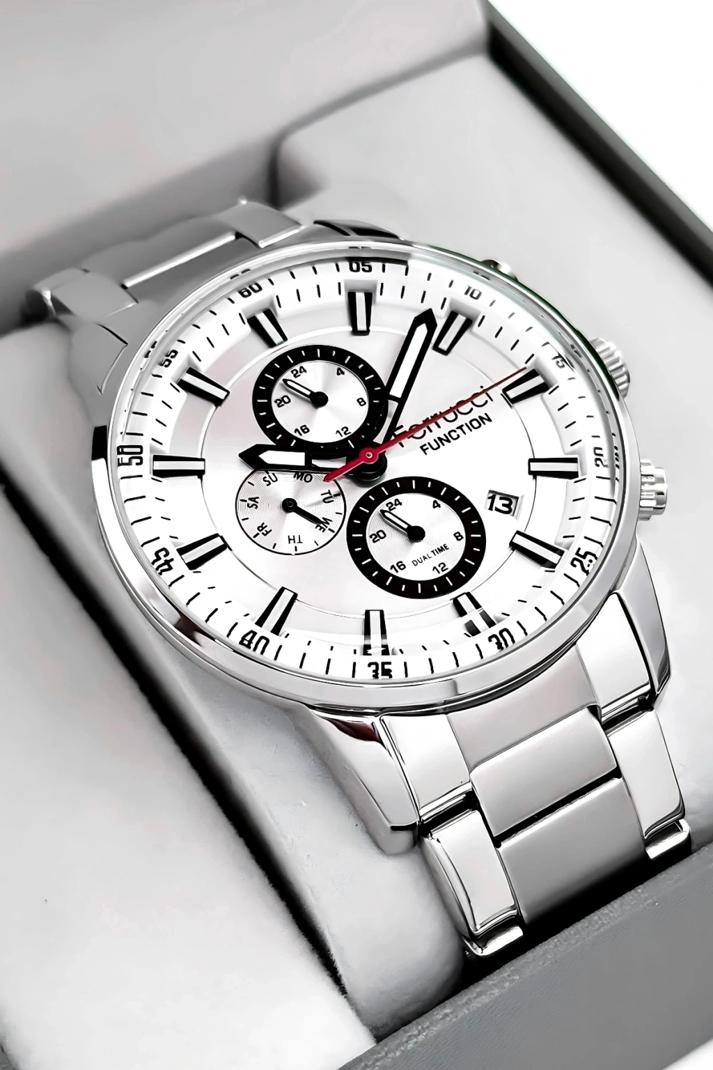 Ferrucci Marka Erkek Kol Saati, şıklığı ve işlevselliği bir araya getiren mükemmel bir aksesuardır.; Bu saat, dayanıklı çelik kordon ve çelik kasa ile üretilmiştir, böylece uzun süreli kullanım sağlar.; Saatin tüm fonksiyonları aktif olarak çalışır ve size zamanı takip etmekle kalmaz, aynı zamanda takvim, kronograf ve diğer özelliklerle de yardımcı olur.; Saatin su geçirmezlik özelliği, 3 atm'ye kadar dayanıklıdır, bu da günlük yaşamınızda hafif su temaslarına dayanabilir anlamına gelir.; Ancak, havuz, deniz veya duş gibi su altı etkinlikleri için uygun değildir ve bu tür durumlarda kullanılmamalıdır.; Ferrucci Marka Erkek Kol Saati, quartz mekanizmasıyla çalışır ve yüksek hassasiyetle zamanı gösterir.; Bu mekanizma, saatteki hareketi sağlamak için kristal osilatörün titreşimlerini kullanır.; Ürünümüz 2 yıl garantilidir, böylece satın aldığınız saatle ilgili herhangi bir üretim hatası veya arıza durumunda tam koruma sağlarız.; Ayrıca, ürün faturası size gönderilir ve mail adresinize ulaştırılır.; Bu sayede, faturayı saklayabilir ve garanti süresi boyunca herhangi bir sorun yaşarsanız kolayca iletişime geçebilirsiniz.; Ferrucci Marka Erkek Kol Saati, tüm siparişlerde özel hediye paketiyle birlikte gönderilir.; Böylece, saatiniz zarif bir şekilde paketlenmiş olarak size ulaşır ve hediye vermek için ideal bir seçenek olur.; Saat, özenle paketlenir ve taşınma sırasında herhangi bir hasara karşı korunaklı hale getirilir.; Bu da size güvenli ve sorunsuz bir alışveriş deneyimi sunar.; Ferrucci Marka Erkek Kol Saati, modern ve şık tasarımıyla dikkat çeker.; Saatin çelik kordonu, sağlamlığı ve şıklığı bir araya getirerek size zarif bir görünüm sunar.; Aynı şekilde, çelik kasa da saatin dayanıklılığını artırır ve uzun süreli kullanım için mükemmel bir seçim yapmanızı sağlar.; Bu saat, günlük kullanım için idealdir ve aynı zamanda özel etkinliklerde de şıklığınızı tamamlar.; Ferrucci Marka Erkek Kol Saati, detaylarına verilen özenle dikkat çeker.; Saatin kadranı, kolay okunabilir bir düzenle tasarlanmıştır, böylece zamanı hızlı ve kolay bir şekilde görebilirsiniz.; Ayrıca, takvim ve kronograf gibi ek fonksiyonlar da mevcuttur, bu da saatin daha fazla işlevselliğe sahip olmasını sağlar.; Saat, güçlü bir quartz mekanizmasıyla çalışır ve size uzun süreli ve doğru bir saat deneyimi sunar.; Ferrucci Marka Erkek Kol Saati, kaliteli malzemeler ve özenli işçilikle üretilmiştir.; Her ayrıntı titizlikle incelenmiş ve üstün bir saat deneyimi sağlamak amacıyla tasarlanmıştır.; Bu saat, tarzınızı tamamlayacak ve kendinizi özel hissetmenizi sağlayacak mükemmel bir aksesuardır.; Ayrıca, sevdikleriniz için harika bir hediye seçeneği de sunar.; Ferrucci Marka Erkek Kol Saati, özel kutusunda sunulur ve hediye alıcısına özel bir his yaşatır.; Saatiniz özenle paketlenmiş olarak size ulaşır ve hediye verme deneyiminizi daha da özel hale getirir.; Ferrucci Marka Erkek Kol Saati, hem şık hem de işlevsel olmasıyla dikkat çeker.; Siparişinizi hemen verin ve bu eşsiz saatin keyfini çıkarın!;