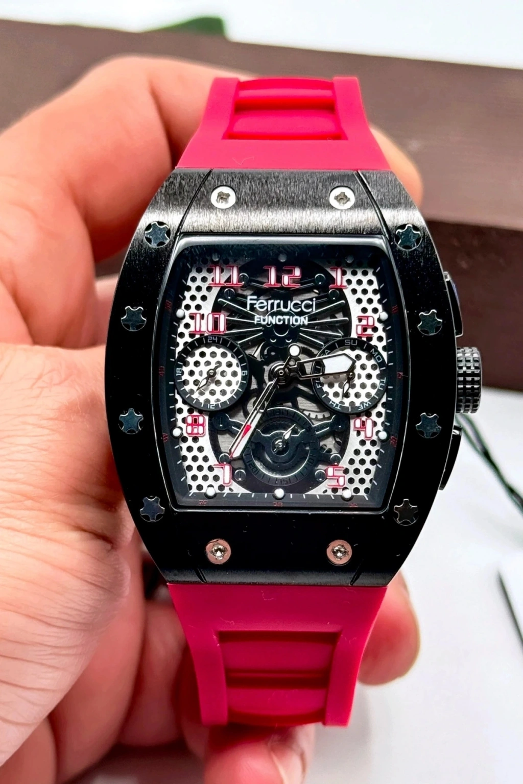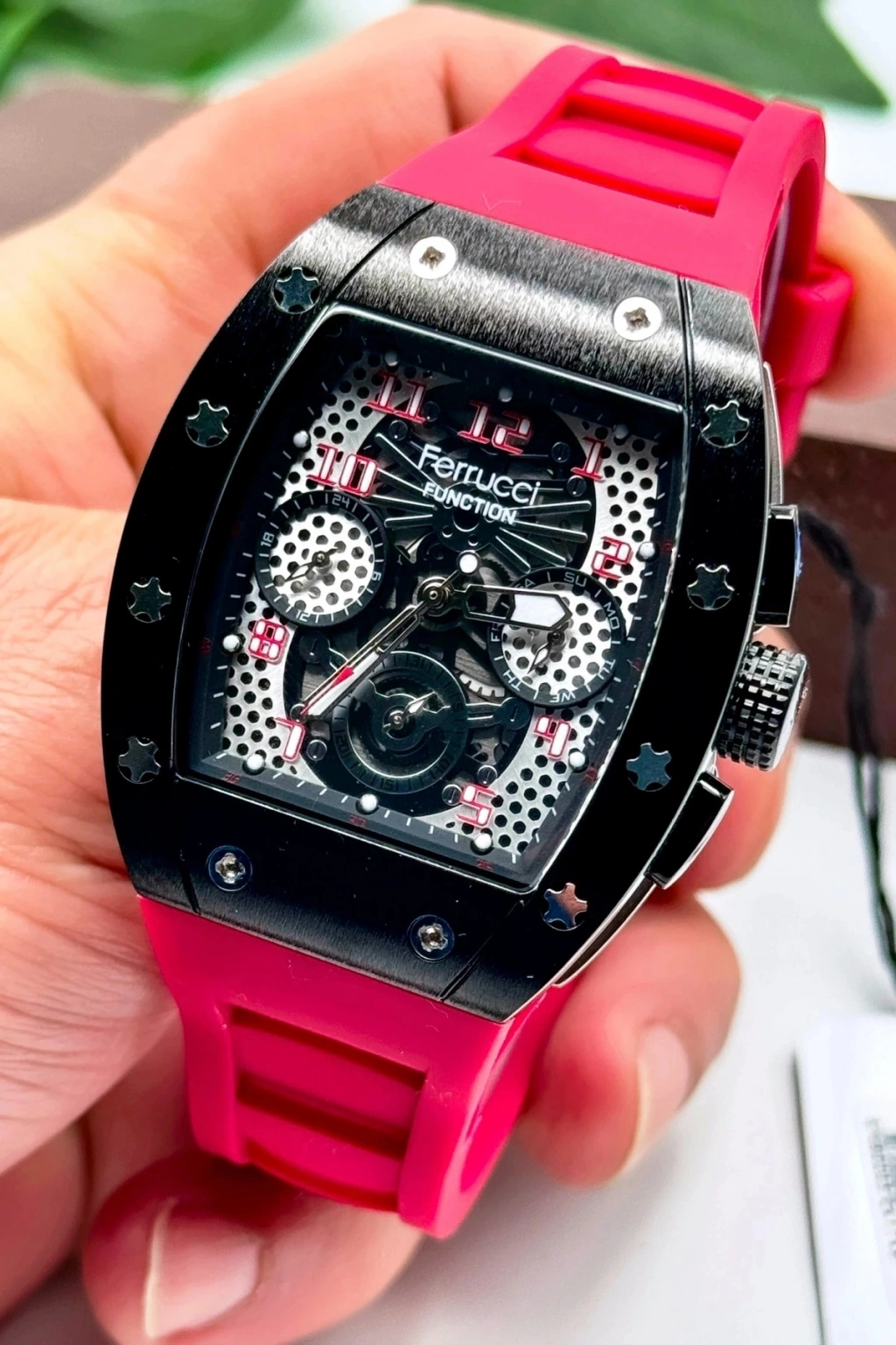 Ferrucci Erkek Kol Saati - Tüm Fonksiyonlar Aktif, Silikon Kordon, Çelik Kasa, Mineral Cam, 3 ATM Suya Dayanıklı; ; Ferrucci erkek kol saati, mükemmel bir kombinasyon olan şıklık ve işlevsellik sunan özel bir üründür. Bu orijinal saat, modern tasarımı ve üstün özellikleriyle erkeklerin tarzını yansıtmak için ideal bir seçimdir. Hem günlük kullanıma hem de özel durumlara uygun olan bu saat, herhangi bir kıyafete sofistike bir dokunuş katacak.; ; Bu saat, tüm fonksiyonlarının aktif olmasıyla öne çıkar. Tarih, gün, kronograf ve diğer işlevler, kolay erişilebilir düğmeleri sayesinde kullanımı son derece kolaydır. Zamanı takip etmek, ölçmek ve ihtiyaç duyduğunuz her şeyi yapmak için gereken her şeye sahip olacaksınız.; ; Ferrucci erkek kol saati, dayanıklılık ve konfor sağlamak için silikon kordon ve çelik kasa ile tasarlanmıştır. Silikon kordon, yumuşak ve esnek yapısıyla bileği rahat bir şekilde sarar ve uzun süreli kullanımlarda bile konfor sunar. Çelik kasa ise saate sağlamlık ve dayanıklılık katarken, şık bir görünüm sunar.; ; Bu saatte kullanılan mineral cam, çizilmelere karşı dayanıklılık sağlar ve uzun süreli kullanımda net bir görüntü sunar. Ayrıca, 3 ATM suya dayanıklılık özelliğiyle günlük yaşamınızdaki su temasına karşı korunmanızı sağlar. Ancak, yüzme veya dalış gibi su sporları sırasında kullanılmaması önerilir.; ; Orijinal Ferrucci marka ürün olarak, kalite ve güvenilirlik sunar. Bu saat, şık ve zarif tasarımıyla herhangi bir kıyafeti tamamlayacak ve tarzınızı öne çıkaracak şekilde üretilmiştir.; ; Ürün Açıklaması:; Marka: Ferrucci; Cinsiyet: Erkek; Fonksiyonlar: Tarih, gün, kronograf ve diğer işlevler; Kasa Malzemesi: Çelik; Kordon Malzemesi: Silikon; Kadran Rengi: Siyah; Kasa Çapı: 44 mm; Kasa Kalınlığı: 10 mm; Kapatma Türü: Toka; Cam: Mineral cam; Su Geçirmezlik: 3 ATM ; Pil: SR626SW; Garanti: 2 yıl;