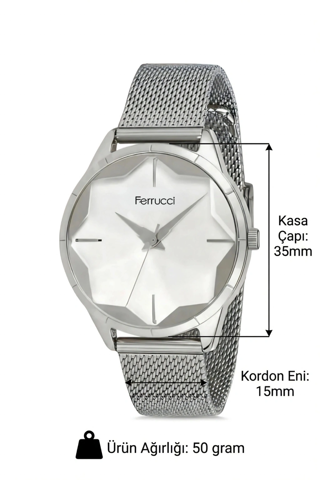 "Bu zarif ve şık Ferrucci kadın kol saati, modern tasarımı ve dayanıklı yapısıyla göz kamaştırıyor. ; Saatin çelik kasa yapısı, hem estetik bir görünüm sunuyor hem de uzun süreli kullanım için ideal bir dayanıklılık sağlıyor. ; Kolayca kombine edilebilen ve her türlü kıyafetle uyum sağlayan bu saat, günlük kullanımınızda vazgeçilmeziniz olacak. ; Saatin çelik kordonu, hem şık hem de konforlu bir kullanım sunuyor. ; Kordon, ciltle temas ettiğinde rahatsızlık vermeyen bir yapıya sahip olup, aynı zamanda kolayca ayarlanabilir özelliğiyle her bilek ölçüsüne uyarlanabilir. ; Kordonun paslanmaz çelik malzemesi, uzun süreli kullanımda dahi ilk günkü gibi parlak ve yeni kalmasını sağlar. ; Saatin çizilmeye dayanıklı mineral camı, günlük kullanımda karşılaşabileceğiniz darbelere ve çizilmelere karşı üstün koruma sunar. ; Bu sayede saat, zorlu koşullarda bile zarif görünümünü koruyabilir. ; Mineral cam, aynı zamanda net ve kolay okunabilir bir kadran görüntüsü sağlar. ; Ferrucci kadın kol saati, 3 ATM suya dayanıklılık özelliğiyle yağmur, el yıkama gibi günlük su temaslarına karşı koruma sağlıyor. ; Ancak, yüzme veya dalış gibi yoğun su etkinlikleri için uygun değildir. ; Ürün, orijinal 2 yıl garanti ile sunuluyor. ; Bu garanti, saat mekanizması ve üretim hatalarına karşı tam bir güvence sağlar. ; Ferrucci'nin kalite ve güvenilirliğini temsil eden bu garanti, müşteri memnuniyetini ön planda tutan bir yaklaşımın göstergesidir. ; Sonuç olarak, bu Ferrucci kadın kol saati, dayanıklılık, stil ve fonksiyonelliği bir arada sunan, günlük kullanım için ideal bir aksesuardır. ; Her zaman şık ve zarif bir görünüm kazandıracak bu saat, modern kadının vazgeçilmez bir parçası olmaya adaydır.";