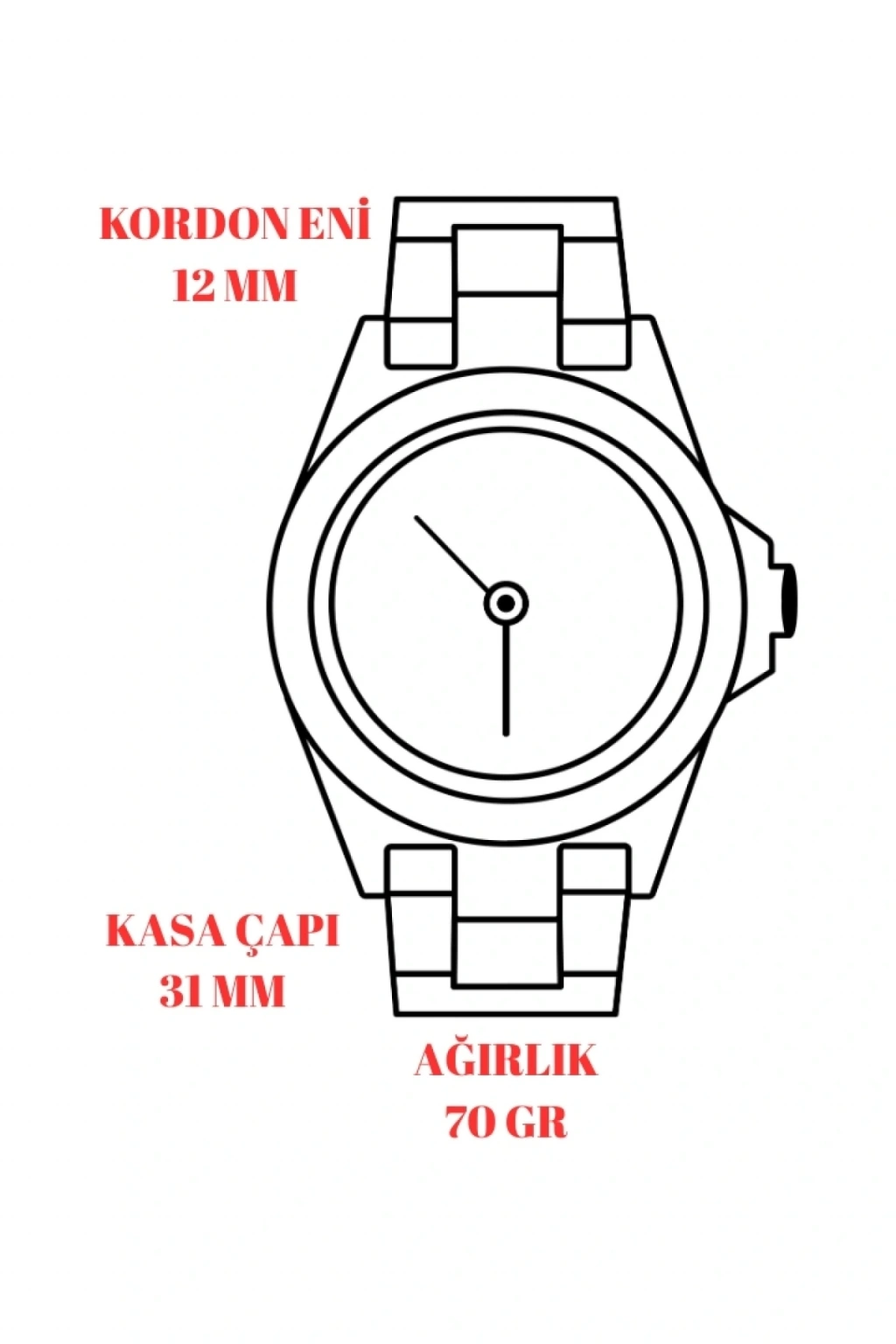 Kadran üzerinde yer alan büyük beyaz rakam indeksler ve kontrast oluşturan siyah zemin, zamanı okuma kolaylığı sağlarken aynı zamanda sade ama çarpıcı bir görünüm sunar. Kasa çapı 31 mm olan bu model, bilekte zarif dururken; 12 mm genişliğindeki çelik kordonu ise hem dayanıklı hem de hafif yapısıyla günlük kullanımda maksimum konfor sağlar. Saatin toplam ağırlığı sadece 70 gramdır ve bilekte varlığı hissedilmeyecek kadar rahattır.