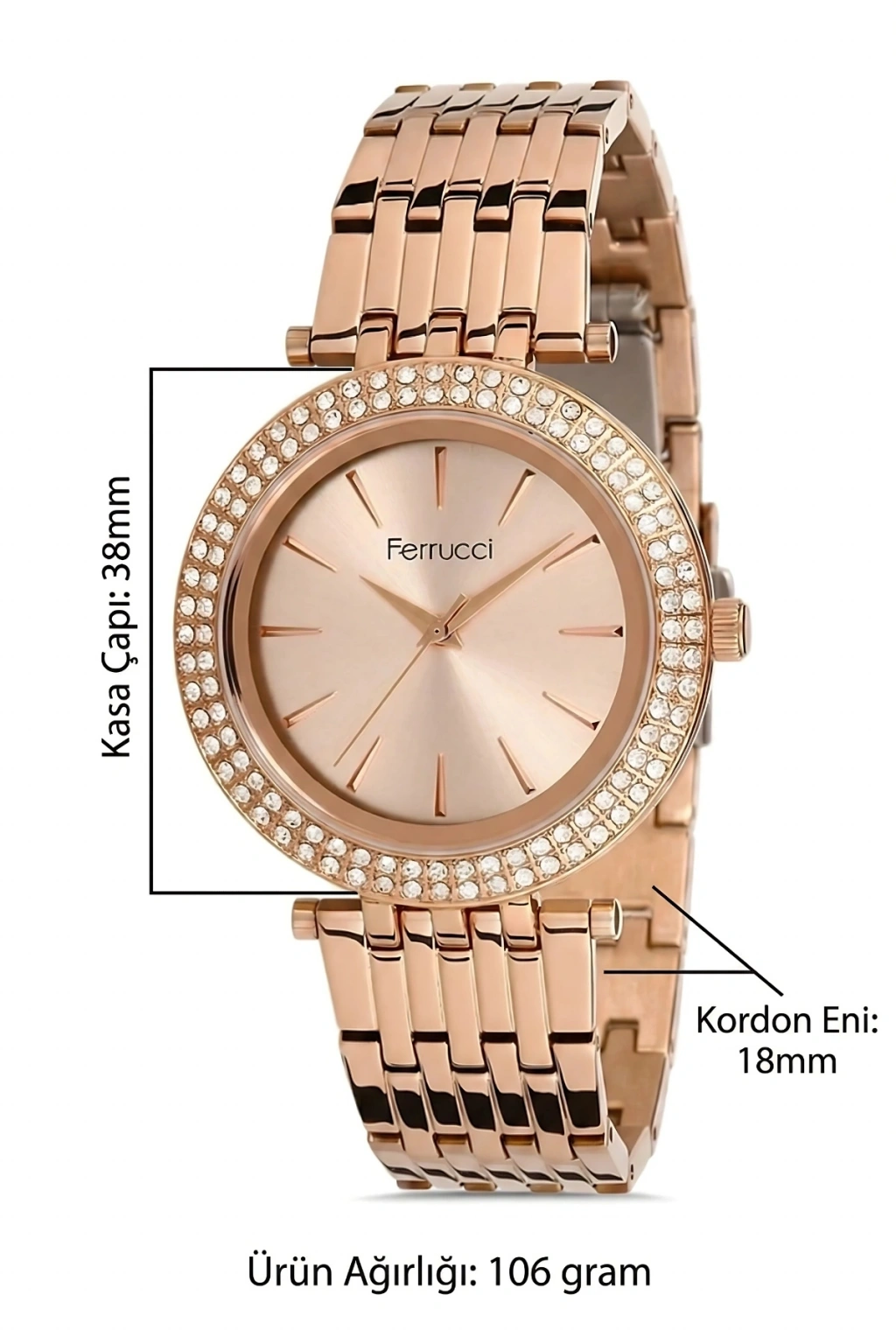 Zamana meydan okuyan tasarımı ve üstün kalitesiyle Ferrucci çelik kordon taşlı kasa kadın kol saati, vazgeçilmez aksesuarınız olmaya aday. Orijinal Ferrucci saat ile stilinizi ve zarafetinizi ortaya koyun.