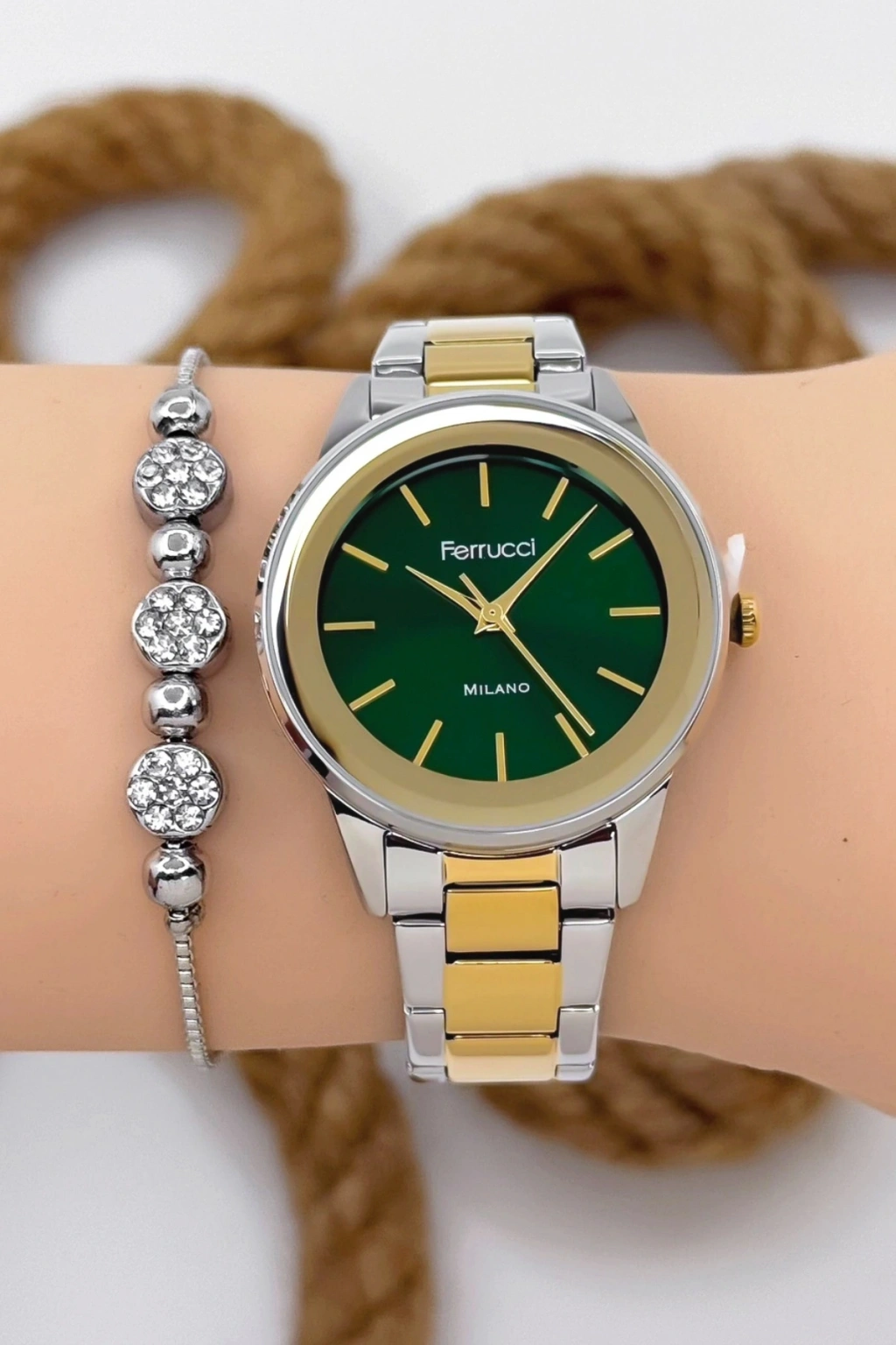 Ferrucci Kadın Kol Saati - Şık Çelik Kordon ve Kasa, Orijinal ve Garantili Gümüş-Gold-Yeşil sdfer147