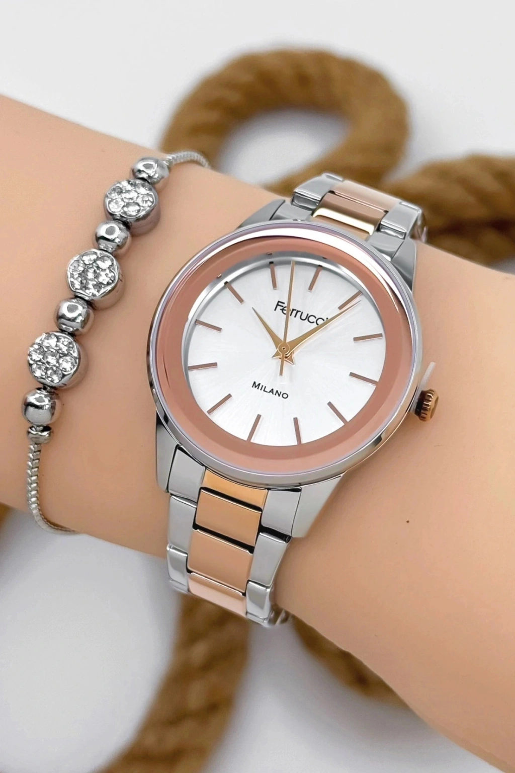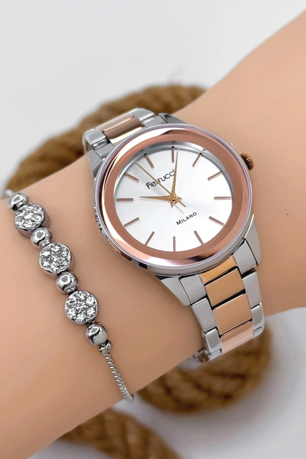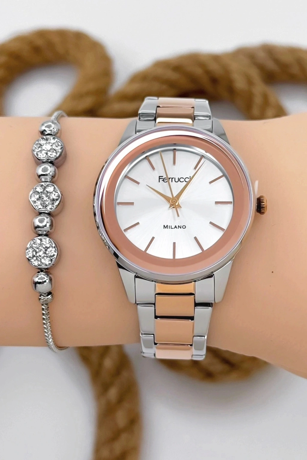 Ferrucci Kadın Kol Saati, zarif tasarımı ve yüksek kaliteli işçiliğiyle her anınıza şıklık katar. Rose gold ve çelik renklerin uyumu, bu saati benzersiz bir moda ikonu haline getiriyor. Hem günlük kullanımda hem de özel günlerde tercih edebileceğiniz bu saat, işlevselliği ve estetiği bir araya getiriyor.