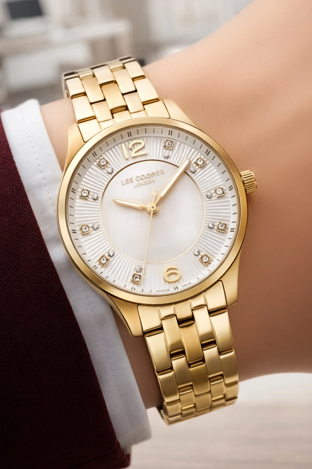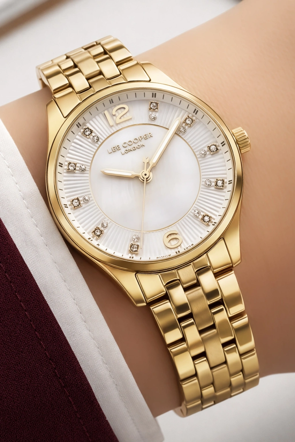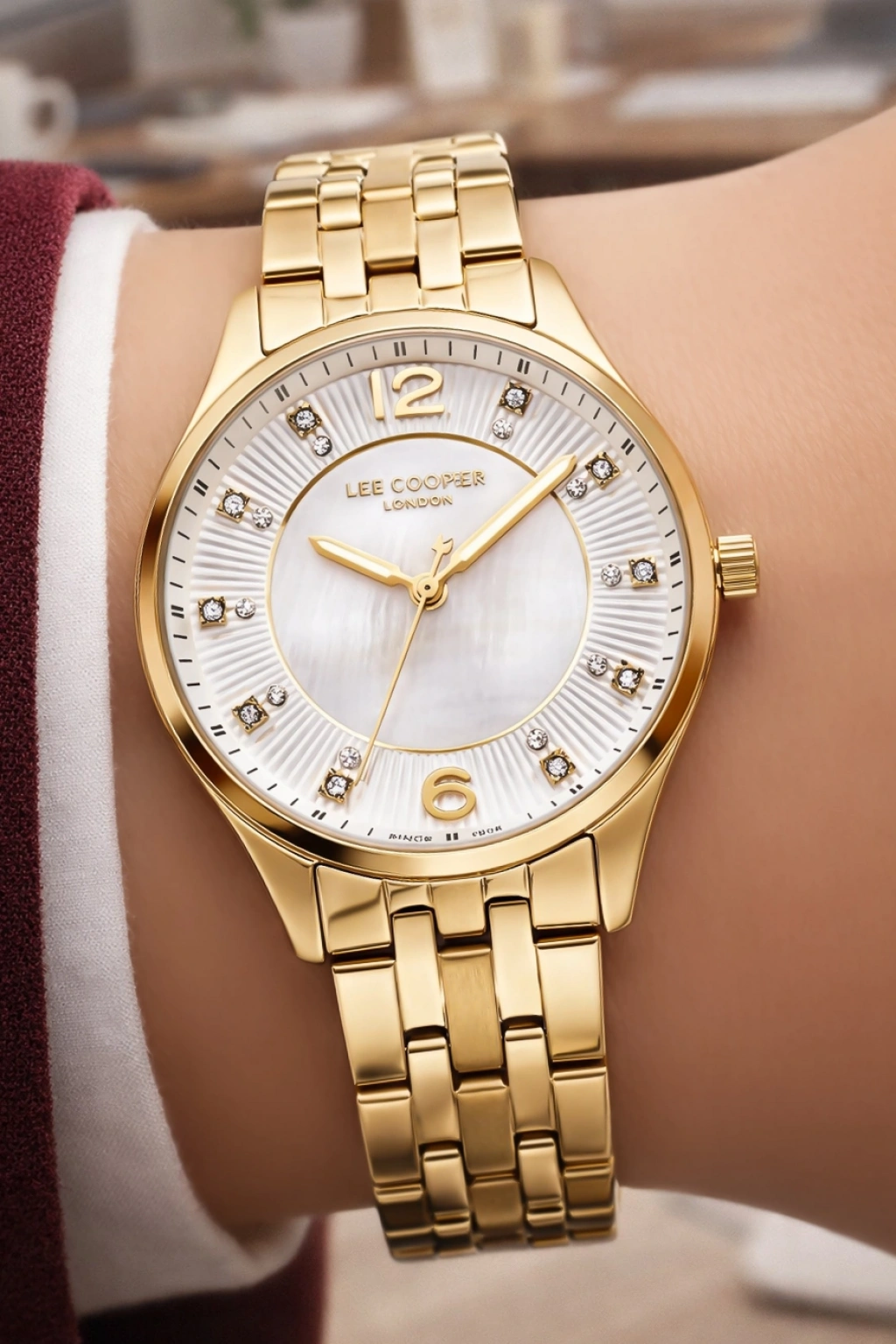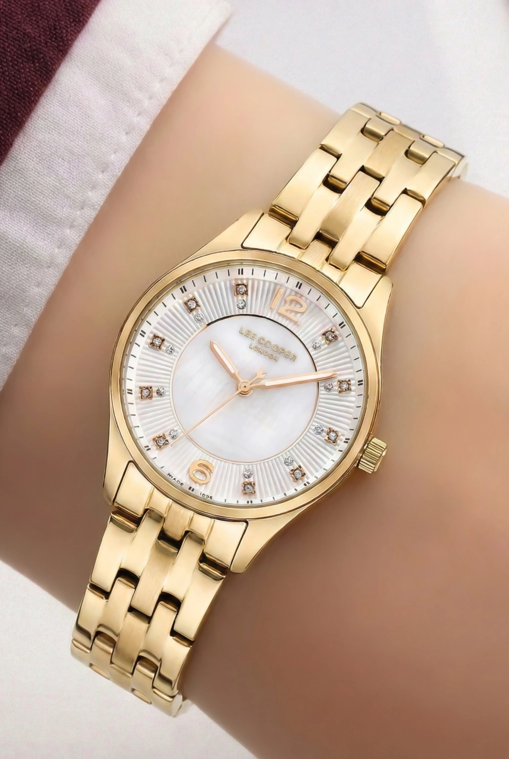 Saatin sedef görünümlü açık renk kadranı, ışığa göre değişen zarif yansımalar sunarak premium bir görünüm oluşturur. Kadran üzerinde yer alan altın tonlu ibreler ve indeksler, saatin okunabilirliğini artırırken şık bir kontrast oluşturur. 12 yönünde bulunan Lee Cooper London marka logosu, ürünün özgün tasarım kimliğini vurgular.