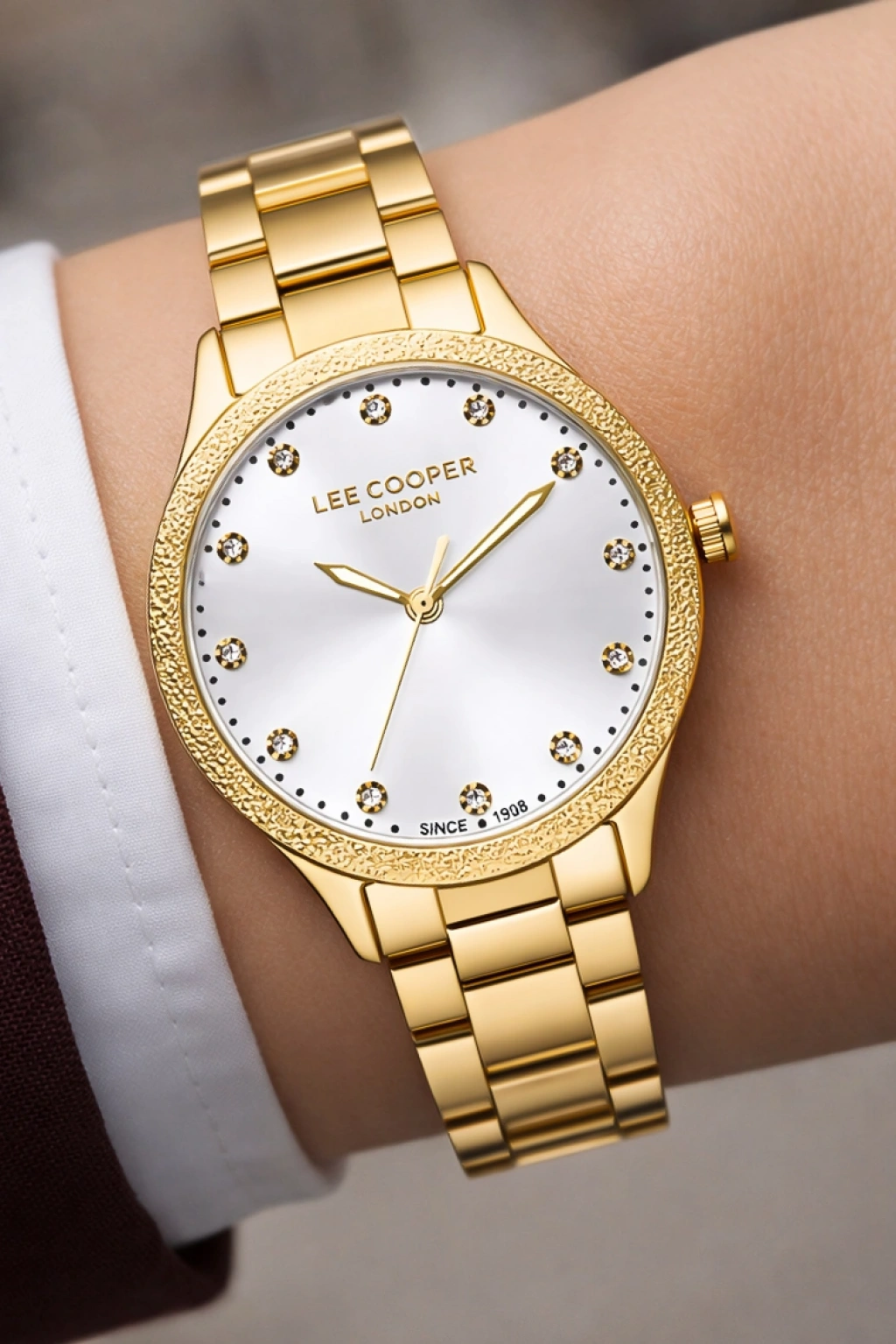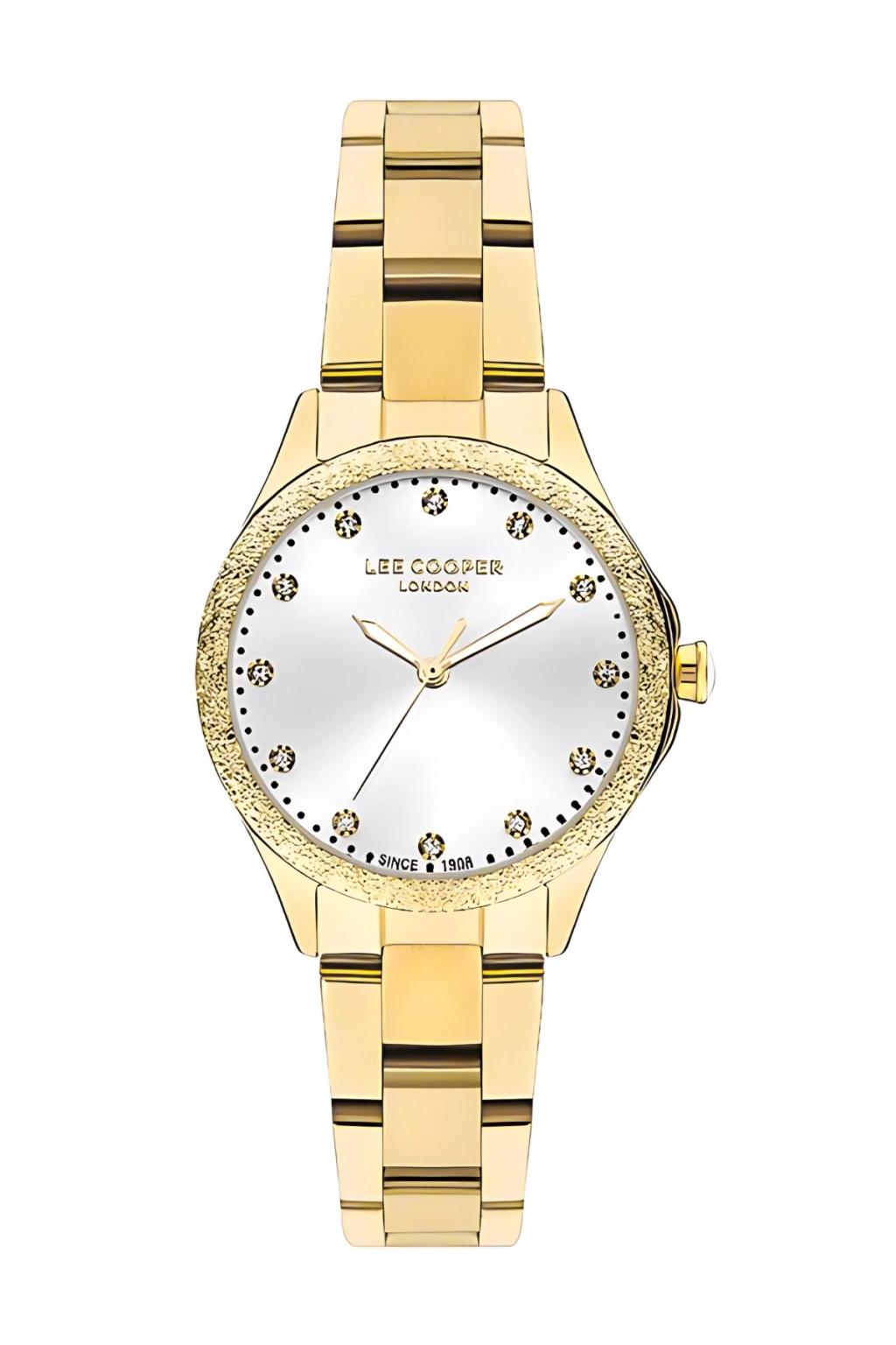 Saatin sedef görünümlü açık renk kadranı, ışığa göre değişen zarif yansımalar sunarak premium bir görünüm oluşturur. Kadran üzerinde yer alan altın tonlu ibreler ve indeksler, saatin okunabilirliğini artırırken şık bir kontrast oluşturur. 12 yönünde bulunan Lee Cooper London marka logosu, ürünün özgün tasarım kimliğini vurgular.