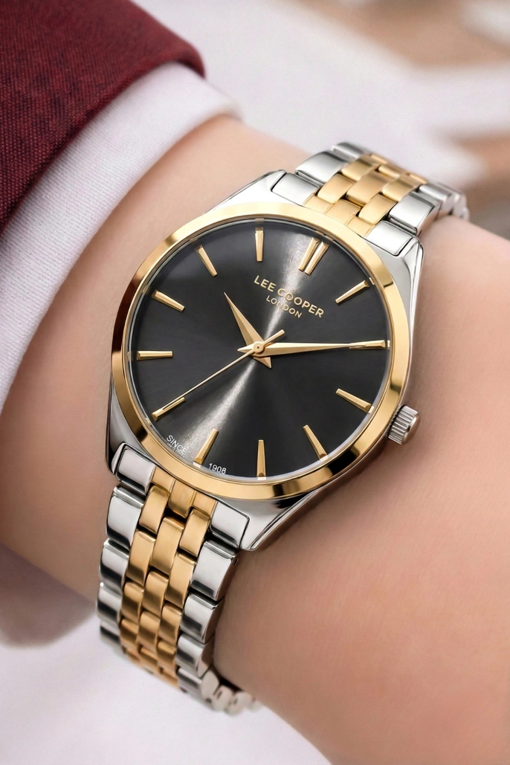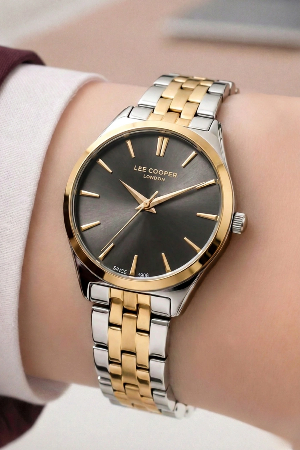 Saatin sedef görünümlü açık renk kadranı, ışığa göre değişen zarif yansımalar sunarak premium bir görünüm oluşturur. Kadran üzerinde yer alan altın tonlu ibreler ve indeksler, saatin okunabilirliğini artırırken şık bir kontrast oluşturur. 12 yönünde bulunan Lee Cooper London marka logosu, ürünün özgün tasarım kimliğini vurgular.
