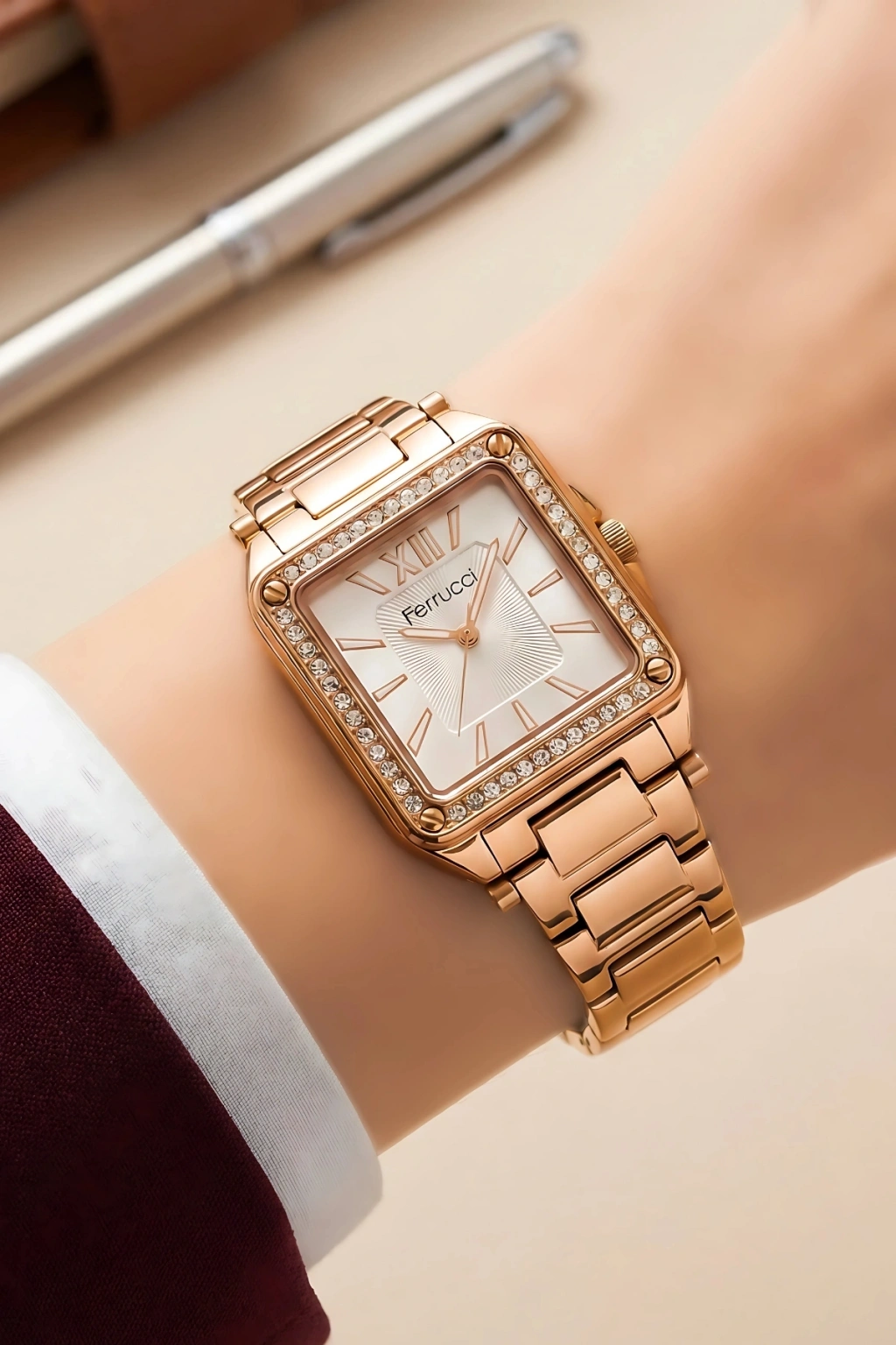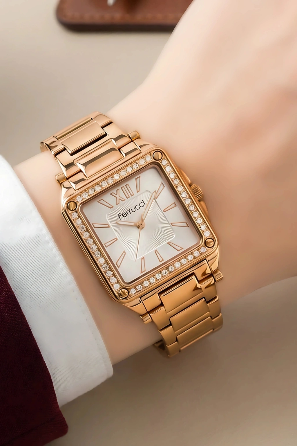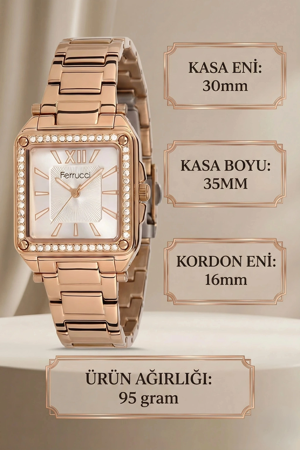 "Bu zarif ve şık Ferrucci kadın kol saati, modern tasarımı ve dayanıklı yapısıyla göz kamaştırıyor. ; Saatin çelik kasa yapısı, hem estetik bir görünüm sunuyor hem de uzun süreli kullanım için ideal bir dayanıklılık sağlıyor. ; Kolayca kombine edilebilen ve her türlü kıyafetle uyum sağlayan bu saat, günlük kullanımınızda vazgeçilmeziniz olacak. ; Saatin çelik kordonu, hem şık hem de konforlu bir kullanım sunuyor. ; Kordon, ciltle temas ettiğinde rahatsızlık vermeyen bir yapıya sahip olup, aynı zamanda kolayca ayarlanabilir özelliğiyle her bilek ölçüsüne uyarlanabilir. ; Kordonun paslanmaz çelik malzemesi, uzun süreli kullanımda dahi ilk günkü gibi parlak ve yeni kalmasını sağlar. ; Saatin çizilmeye dayanıklı mineral camı, günlük kullanımda karşılaşabileceğiniz darbelere ve çizilmelere karşı üstün koruma sunar. ; Bu sayede saat, zorlu koşullarda bile zarif görünümünü koruyabilir. ; Mineral cam, aynı zamanda net ve kolay okunabilir bir kadran görüntüsü sağlar. ; Ferrucci kadın kol saati, 3 ATM suya dayanıklılık özelliğiyle yağmur, el yıkama gibi günlük su temaslarına karşı koruma sağlıyor. ; Ancak, yüzme veya dalış gibi yoğun su etkinlikleri için uygun değildir. ; Ürün, orijinal 2 yıl garanti ile sunuluyor. ; Bu garanti, saat mekanizması ve üretim hatalarına karşı tam bir güvence sağlar. ; Ferrucci'nin kalite ve güvenilirliğini temsil eden bu garanti, müşteri memnuniyetini ön planda tutan bir yaklaşımın göstergesidir. ; Sonuç olarak, bu Ferrucci kadın kol saati, dayanıklılık, stil ve fonksiyonelliği bir arada sunan, günlük kullanım için ideal bir aksesuardır. ; Her zaman şık ve zarif bir görünüm kazandıracak bu saat, modern kadının vazgeçilmez bir parçası olmaya adaydır.";