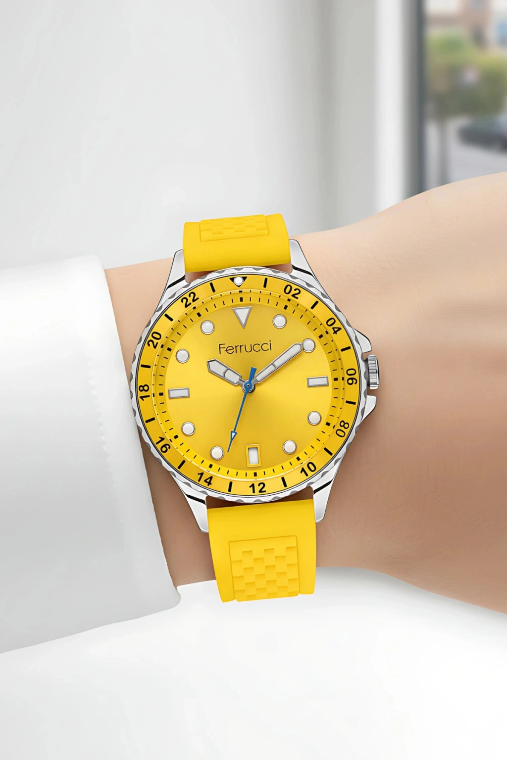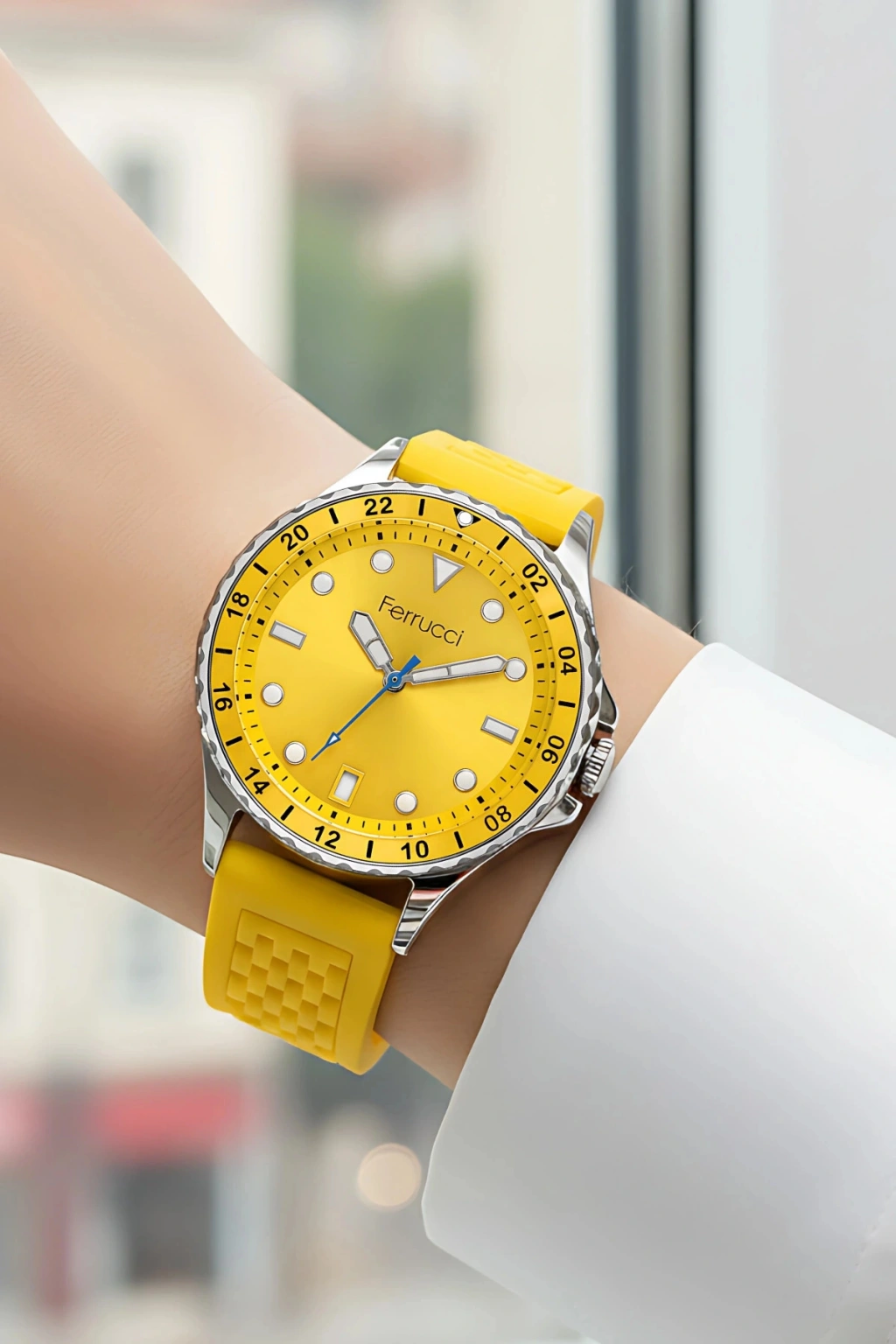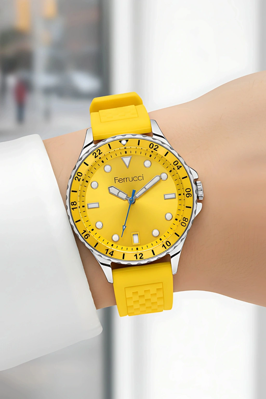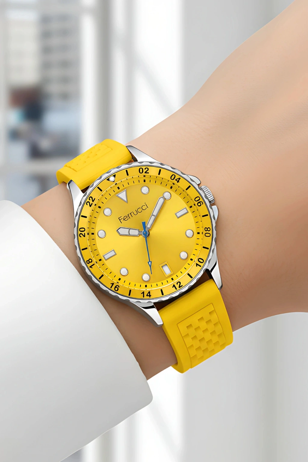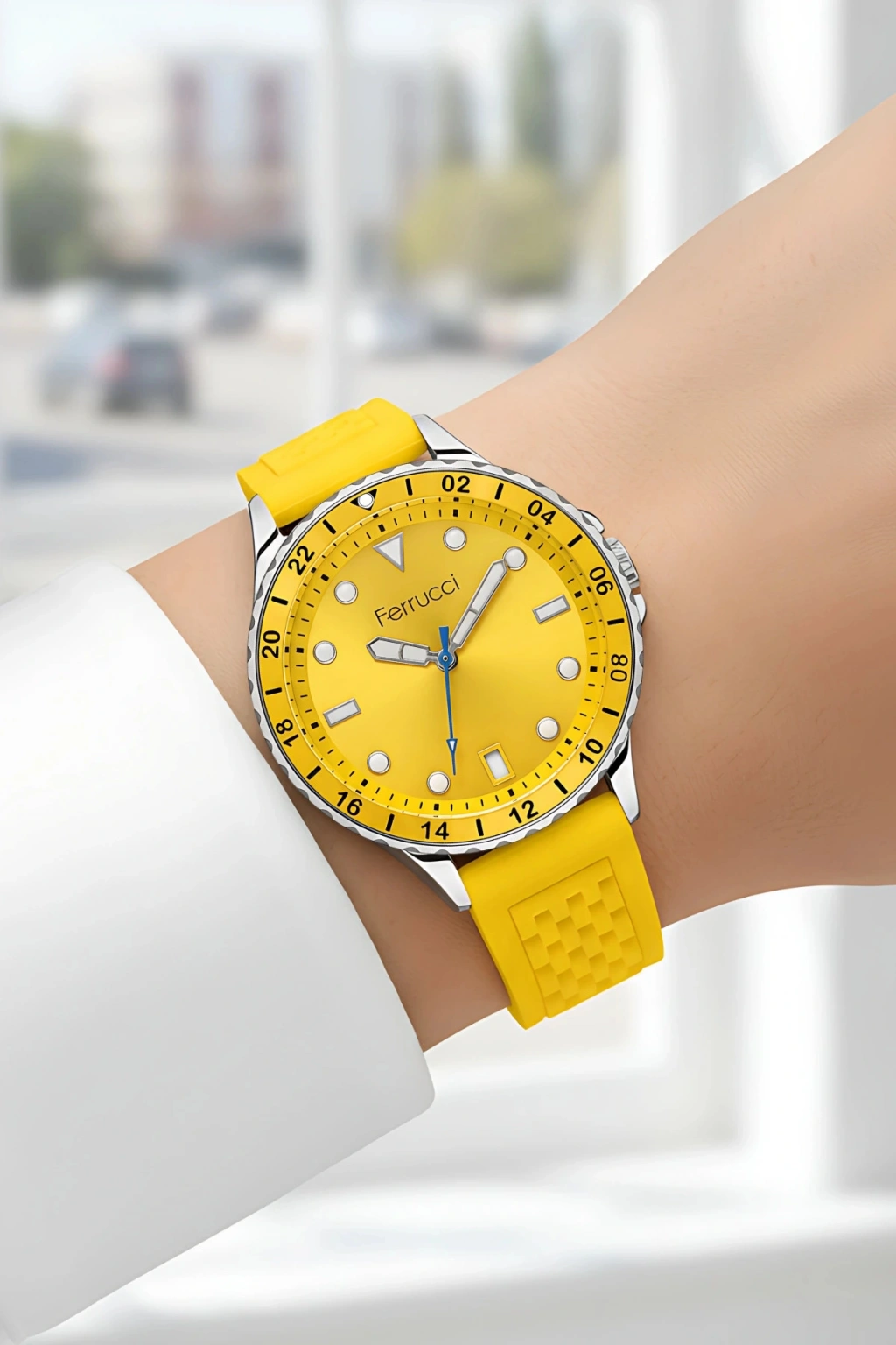 Ferrucci'nin zarif ve modern tasarıma sahip bu kadın kol saati, şıklığı ve dayanıklılığı bir arada sunuyor. Yüksek kaliteli silikon kordon, hem rahat bir kullanım hem de uzun ömürlü bir deneyim sağlarken, çelik kasa saatın şık görünümünü tamamlıyor. Özellikle, çizilmeye karşı son derece dayanıklı mineral cam, saatın yüzeyinin her zaman pürüzsüz ve net kalmasını sağlıyor. Bu özel saat, orijinal 2 yıl garantisi ile geleneksellik ve modernliği birleştiren bir tasarıma sahip. 3 ATM suya dayanıklılık özelliği, günlük yaşamda karşılaşabileceğiniz su sıçramalarına ve yağmura karşı koruma sunar. Ferrucci'nin bu kadın kol saati, hem günlük kullanım hem de özel günler için ideal bir aksesuardır. Saatin zarif tasarımı, her türlü kıyafetle kolaylıkla uyum sağlar ve tarzınıza modern bir dokunuş ekler. Bu Ferrucci kadın kol saatinin özelliklerini özetlemek gerekirse: Yüksek kaliteli silikon kordon: Rahat kullanım ve uzun ömür.; Dayanıklı çelik kasa: Saatin şık ve dayanıklı yapısını sağlar.; Çizilmeye dayanıklı mineral cam: Saat yüzeyinin her zaman net ve pürüzsüz kalmasını garantiler.; Orijinal 2 yıl garantili: Kalite ve güvenceyi temsil eder.; 3 ATM suya dayanıklılık: Günlük su sıçramalarına ve yağmura karşı koruma sunar.; Bu saat, modern ve şık tasarımıyla her ortamda dikkat çekerken, dayanıklılık ve işlevsellik açısından da yüksek standartları karşılamaktadır. Ferrucci'nin bu kadın kol saati, zamanın ötesinde bir aksesuar olarak, her kadının aksesuar koleksiyonunda yer almayı hak ediyor."