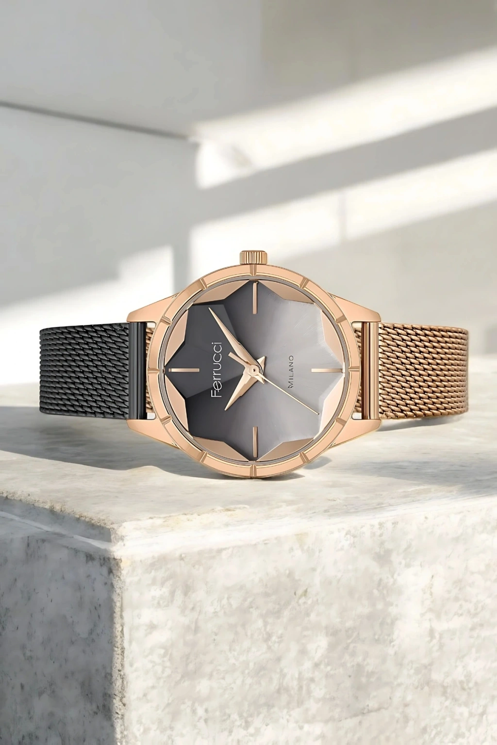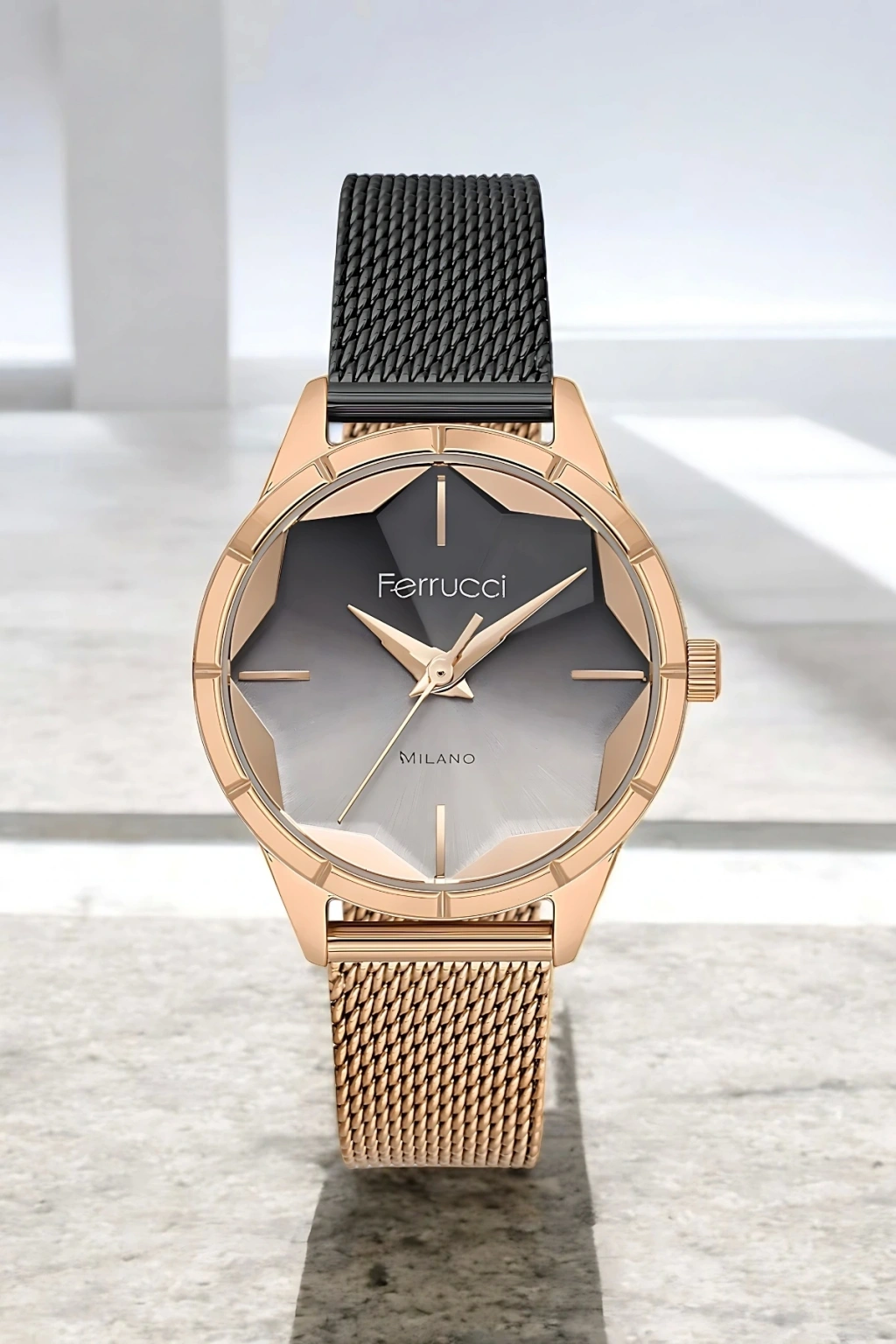 Ferrucci’nin rose gold çelik kasası, ışıl ışıl parlayan zarif yapısıyla her detayında kaliteyi ve estetiği yansıtır. Çelik hasır kordonu bilekte hafif ve rahat bir kullanım sağlarken, minimalist detayları ile modern kadının stilini mükemmel şekilde tamamlar. Her anınıza eşlik edecek bu özel saat, günlük kullanımın yanı sıra özel davetlerde de tercih edebileceğiniz bir aksesuardır.