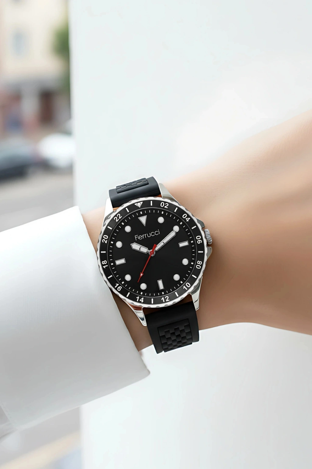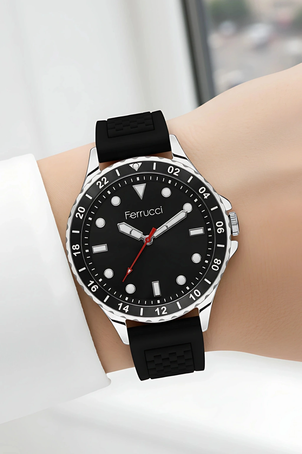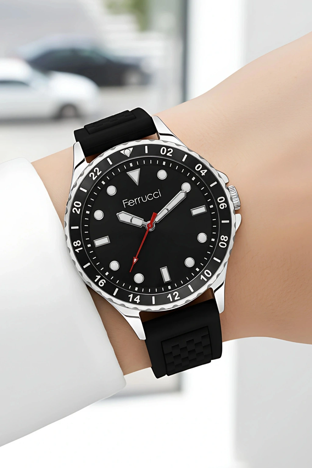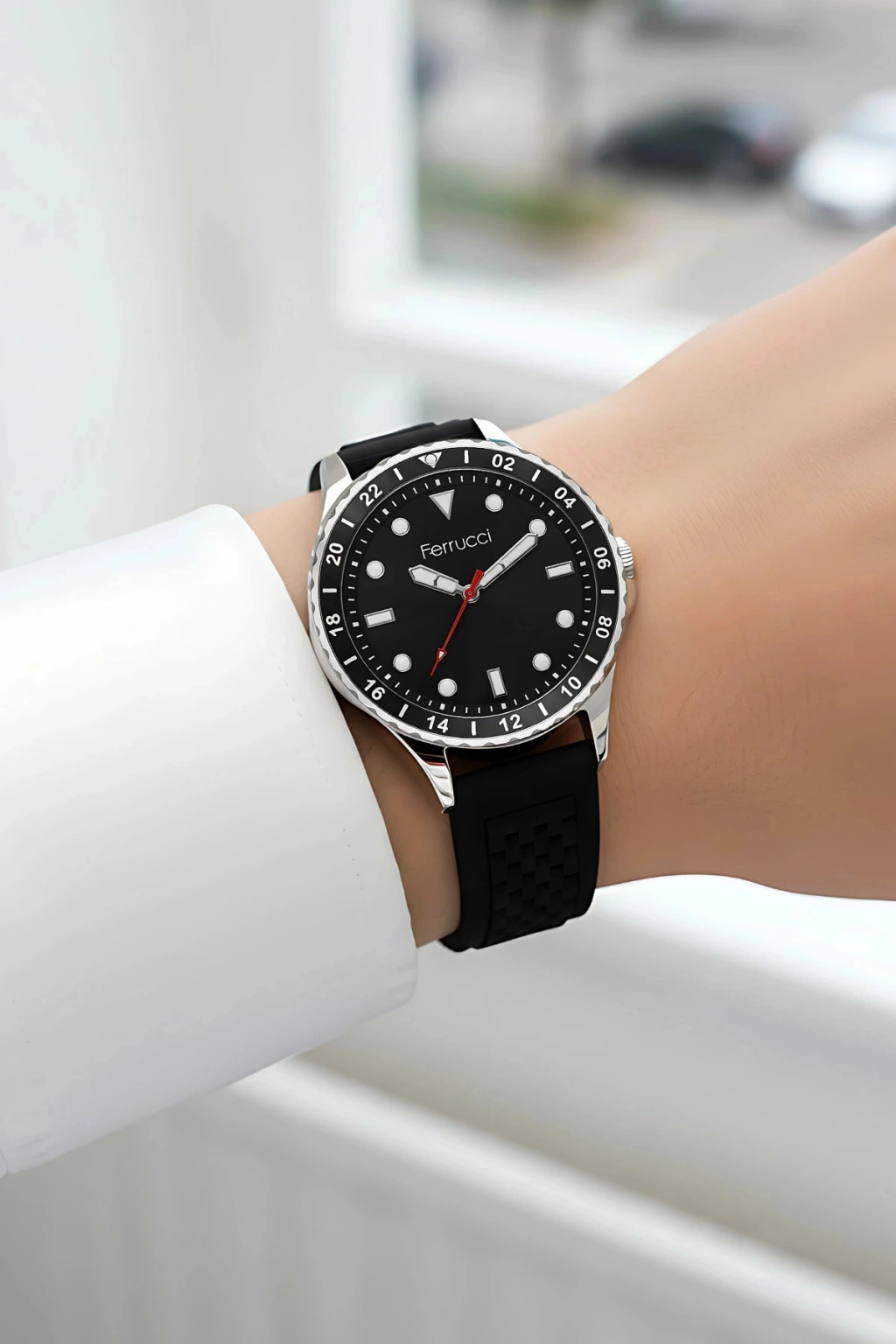 Ferrucci'nin zarif ve modern tasarıma sahip bu kadın kol saati, şıklığı ve dayanıklılığı bir arada sunuyor. Yüksek kaliteli silikon kordon, hem rahat bir kullanım hem de uzun ömürlü bir deneyim sağlarken, çelik kasa saatın şık görünümünü tamamlıyor. Özellikle, çizilmeye karşı son derece dayanıklı mineral cam, saatın yüzeyinin her zaman pürüzsüz ve net kalmasını sağlıyor. Bu özel saat, orijinal 2 yıl garantisi ile geleneksellik ve modernliği birleştiren bir tasarıma sahip. 3 ATM suya dayanıklılık özelliği, günlük yaşamda karşılaşabileceğiniz su sıçramalarına ve yağmura karşı koruma sunar. Ferrucci'nin bu kadın kol saati, hem günlük kullanım hem de özel günler için ideal bir aksesuardır. Saatin zarif tasarımı, her türlü kıyafetle kolaylıkla uyum sağlar ve tarzınıza modern bir dokunuş ekler. Bu Ferrucci kadın kol saatinin özelliklerini özetlemek gerekirse: Yüksek kaliteli silikon kordon: Rahat kullanım ve uzun ömür.; Dayanıklı çelik kasa: Saatin şık ve dayanıklı yapısını sağlar.; Çizilmeye dayanıklı mineral cam: Saat yüzeyinin her zaman net ve pürüzsüz kalmasını garantiler.; Orijinal 2 yıl garantili: Kalite ve güvenceyi temsil eder.; 3 ATM suya dayanıklılık: Günlük su sıçramalarına ve yağmura karşı koruma sunar.; Bu saat, modern ve şık tasarımıyla her ortamda dikkat çekerken, dayanıklılık ve işlevsellik açısından da yüksek standartları karşılamaktadır. Ferrucci'nin bu kadın kol saati, zamanın ötesinde bir aksesuar olarak, her kadının aksesuar koleksiyonunda yer almayı hak ediyor."