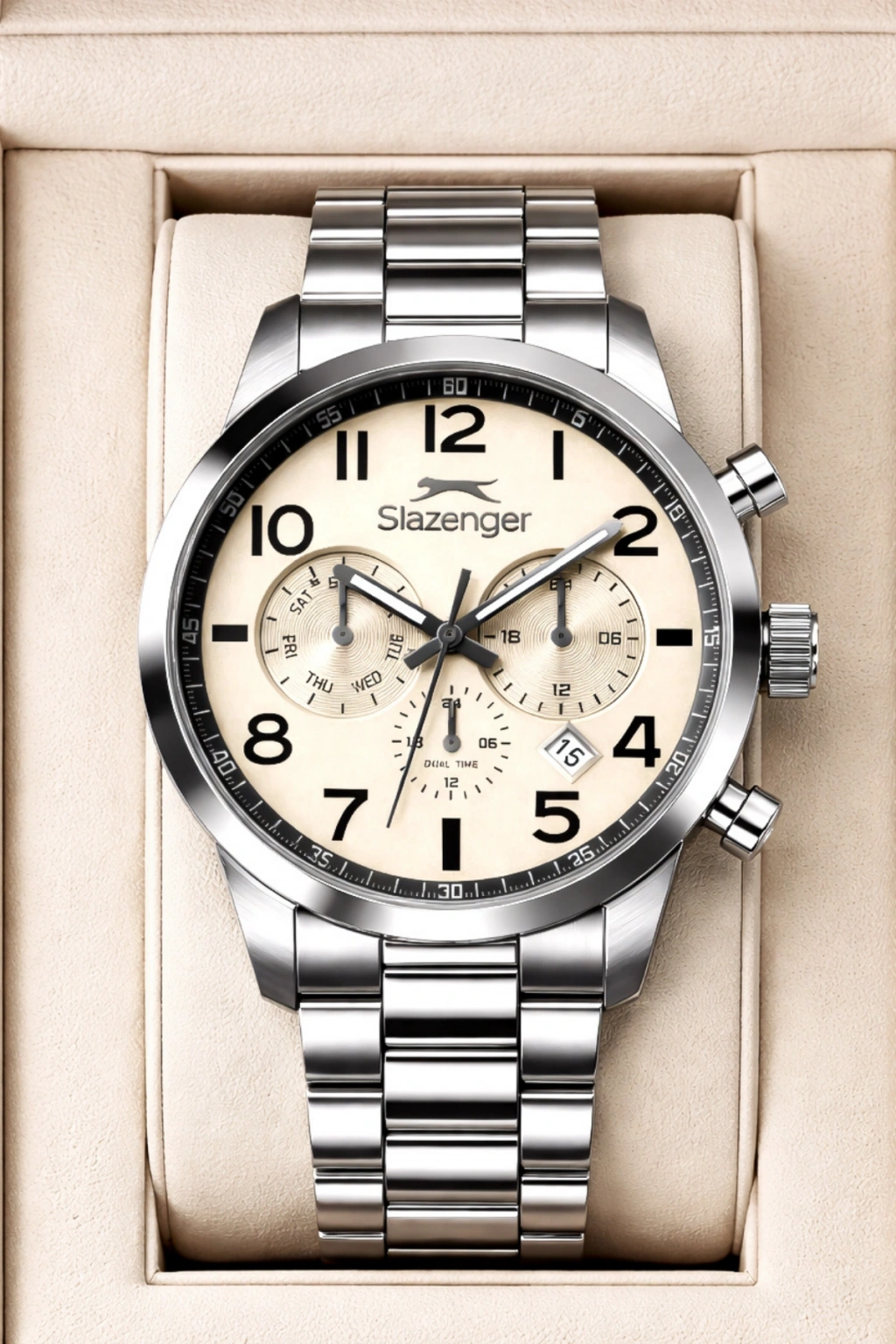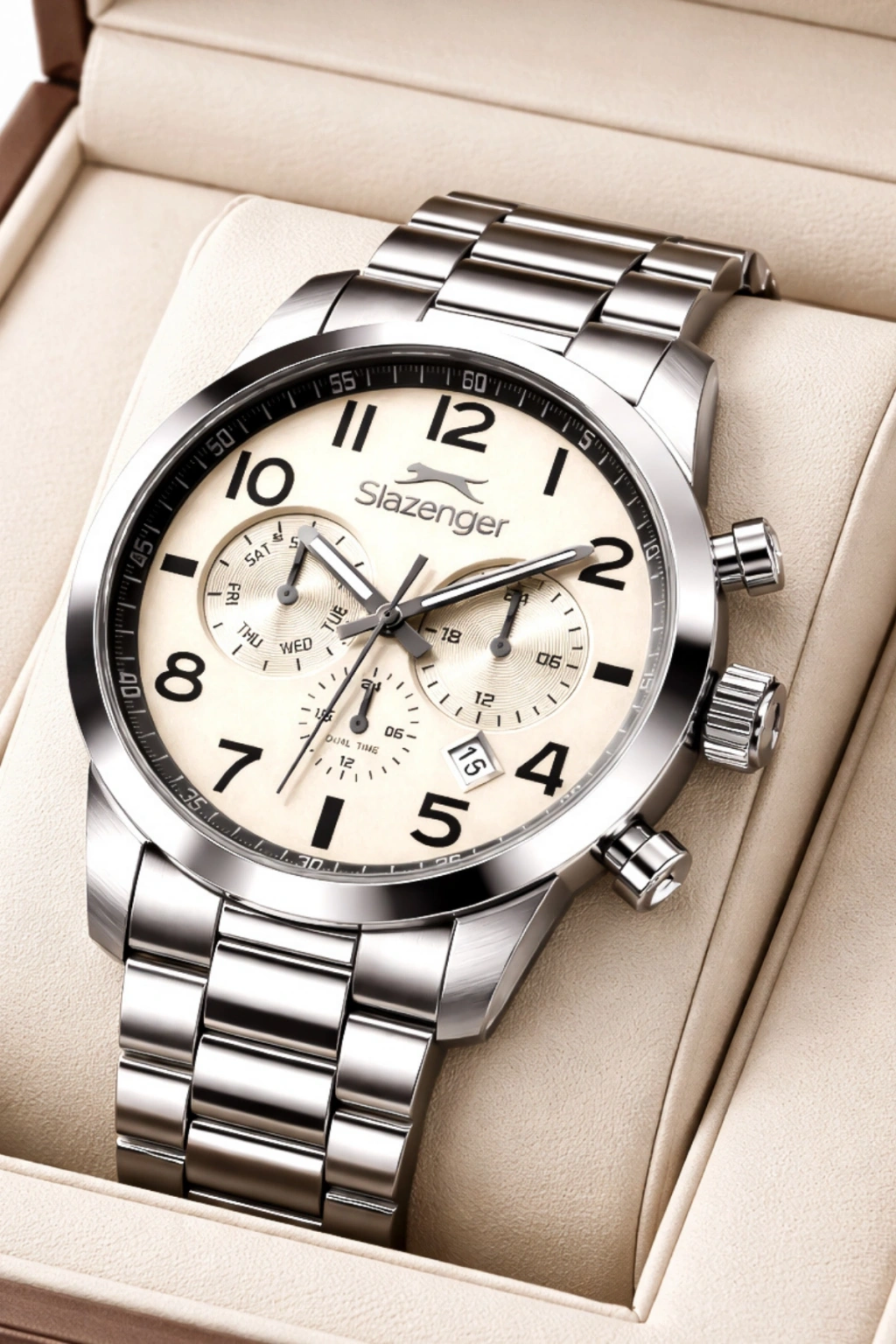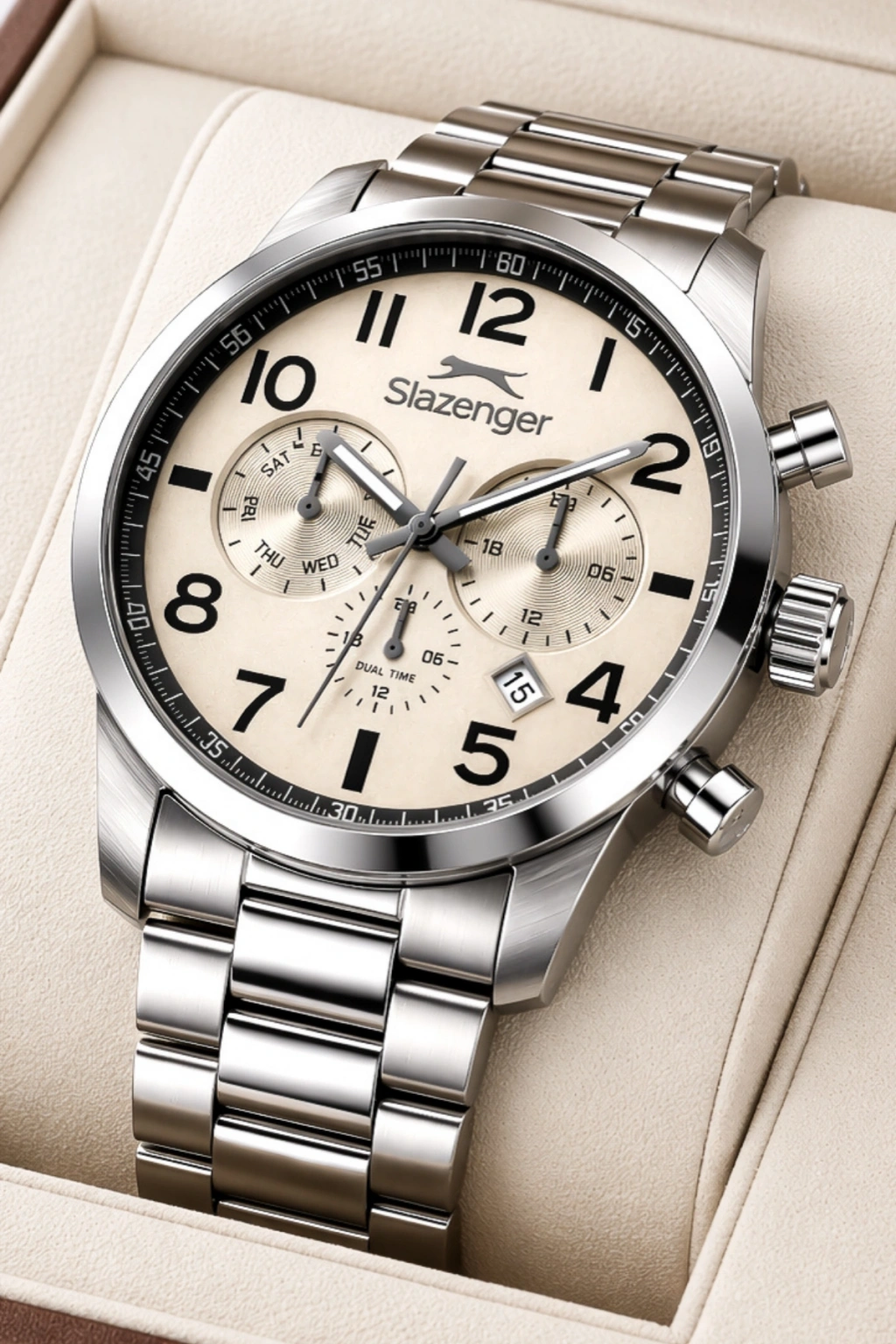 Slazenger Fonksiyonlu Çelik Kordon, Çelik Kasa Erkek Kol Saati Bileklik Hediyeli Gümüş-Beyaz sdslz015