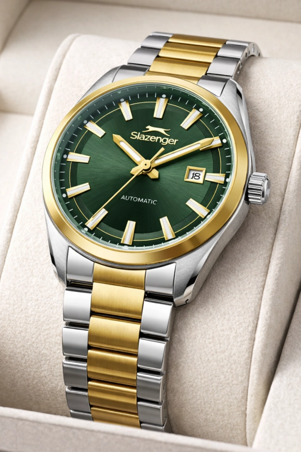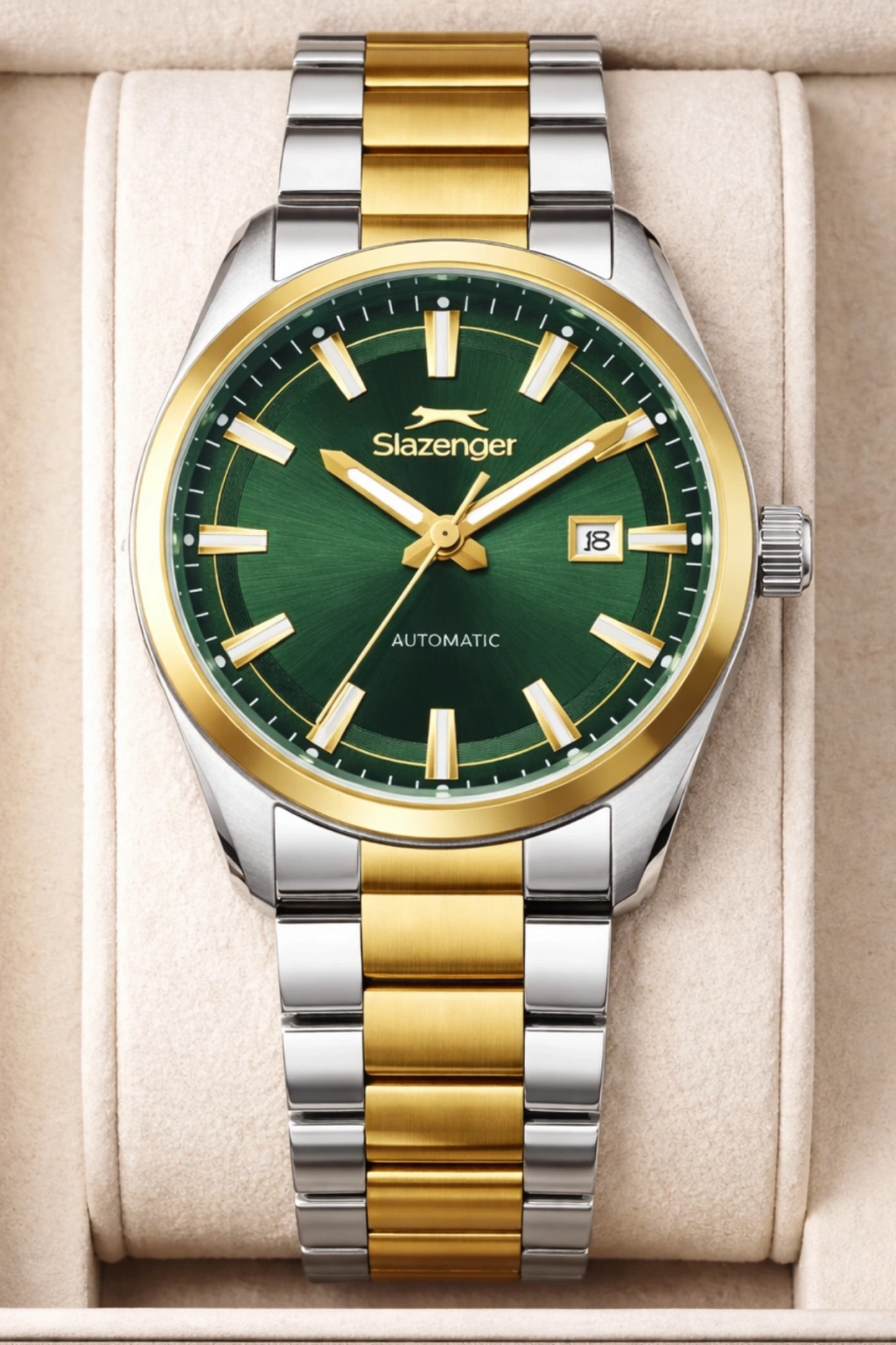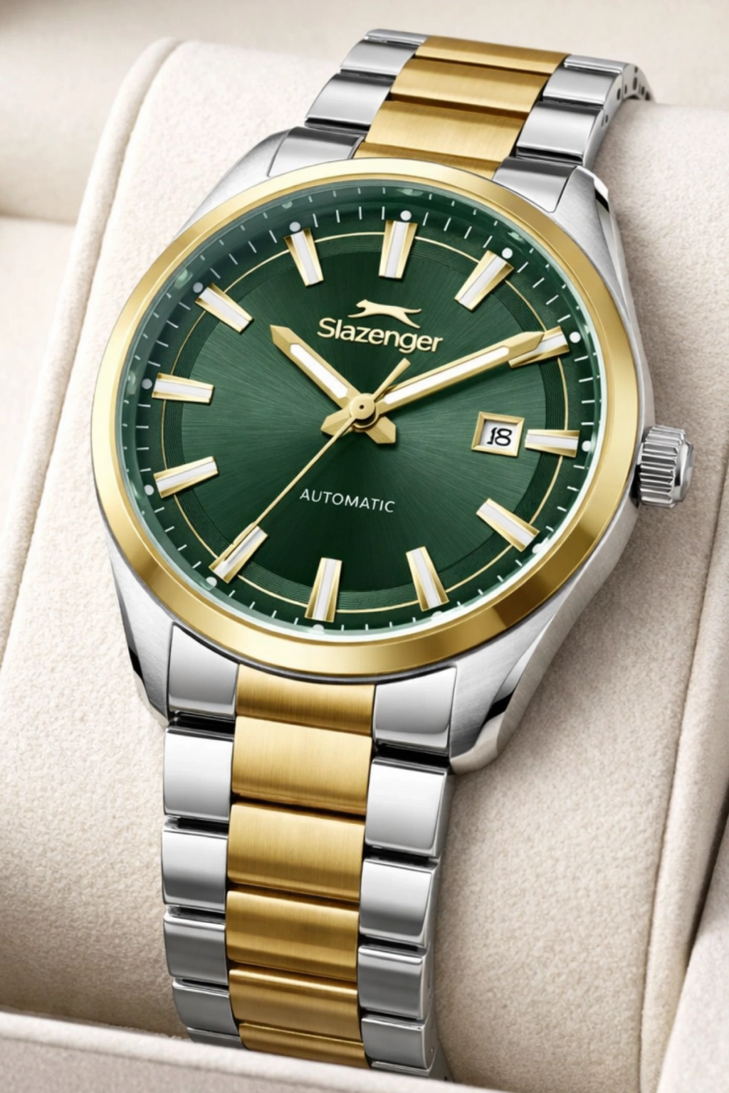 Slazenger Otomatik Mekanizma Çelik Kordon, Çelik Kasa Erkek Kol Saati Bileklik Hediyeli Gümüş-Gold sdslz013