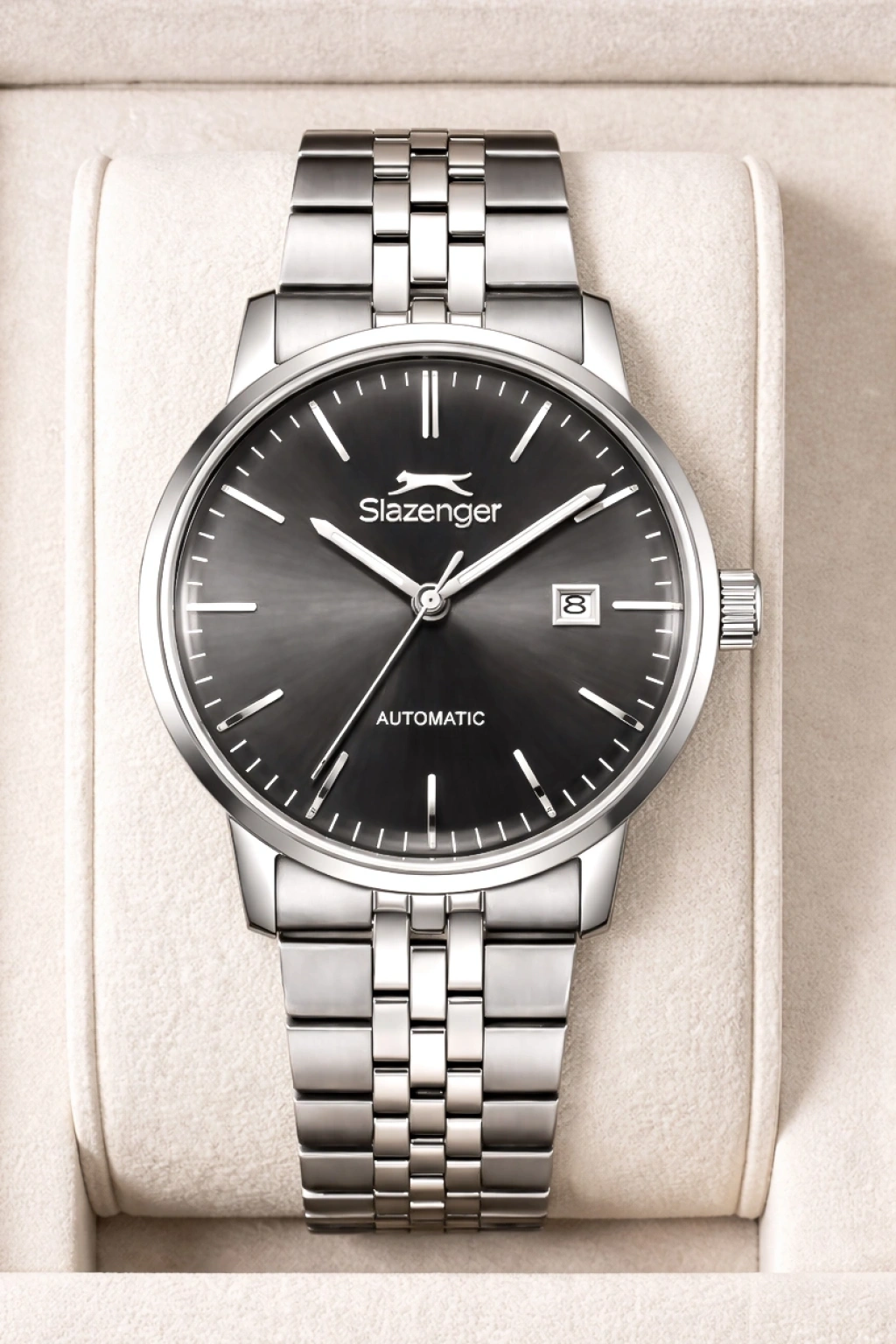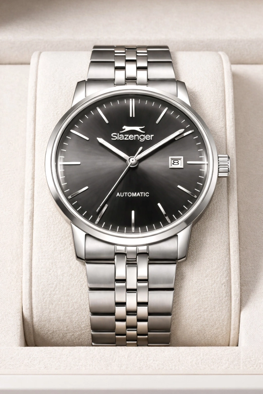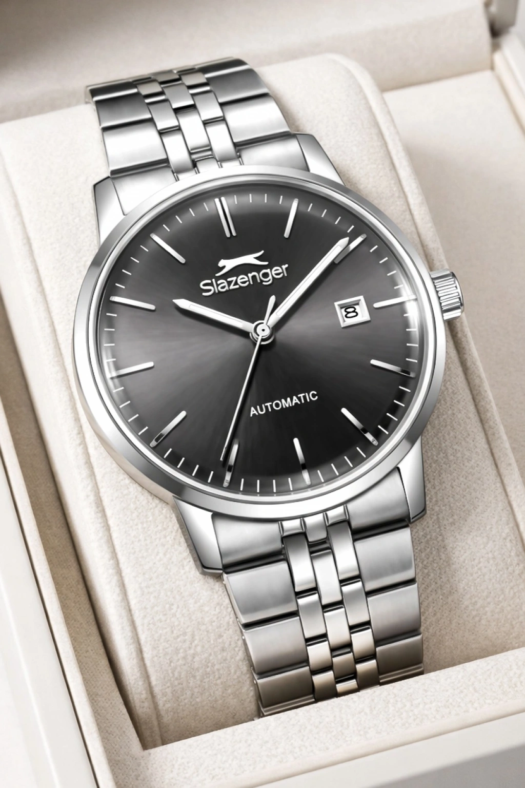 Slazenger Otomatik Mekanizma Çelik Kordon, Çelik Kasa Erkek Kol Saati Bileklik Hediyeli Gümüş-Siyah sdslz017