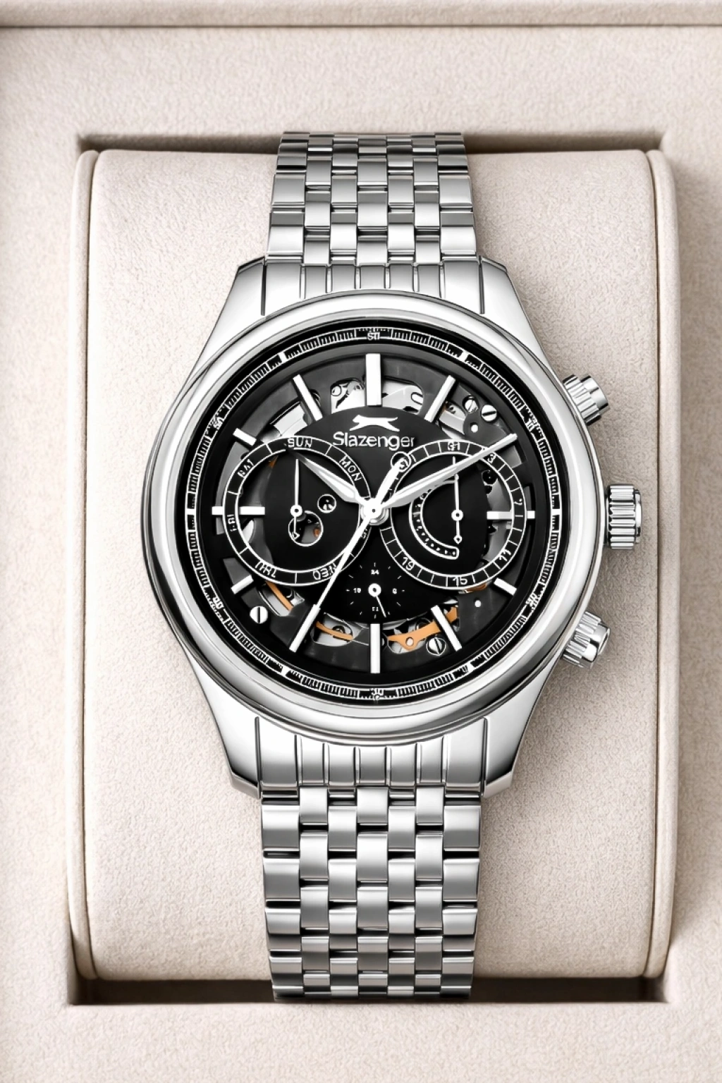 Slazenger Otomatik Mekanizma Çelik Kordon, Çelik Kasa Erkek Kol Saati Bileklik Hediyeli Gümüş-Siyah sdslz019