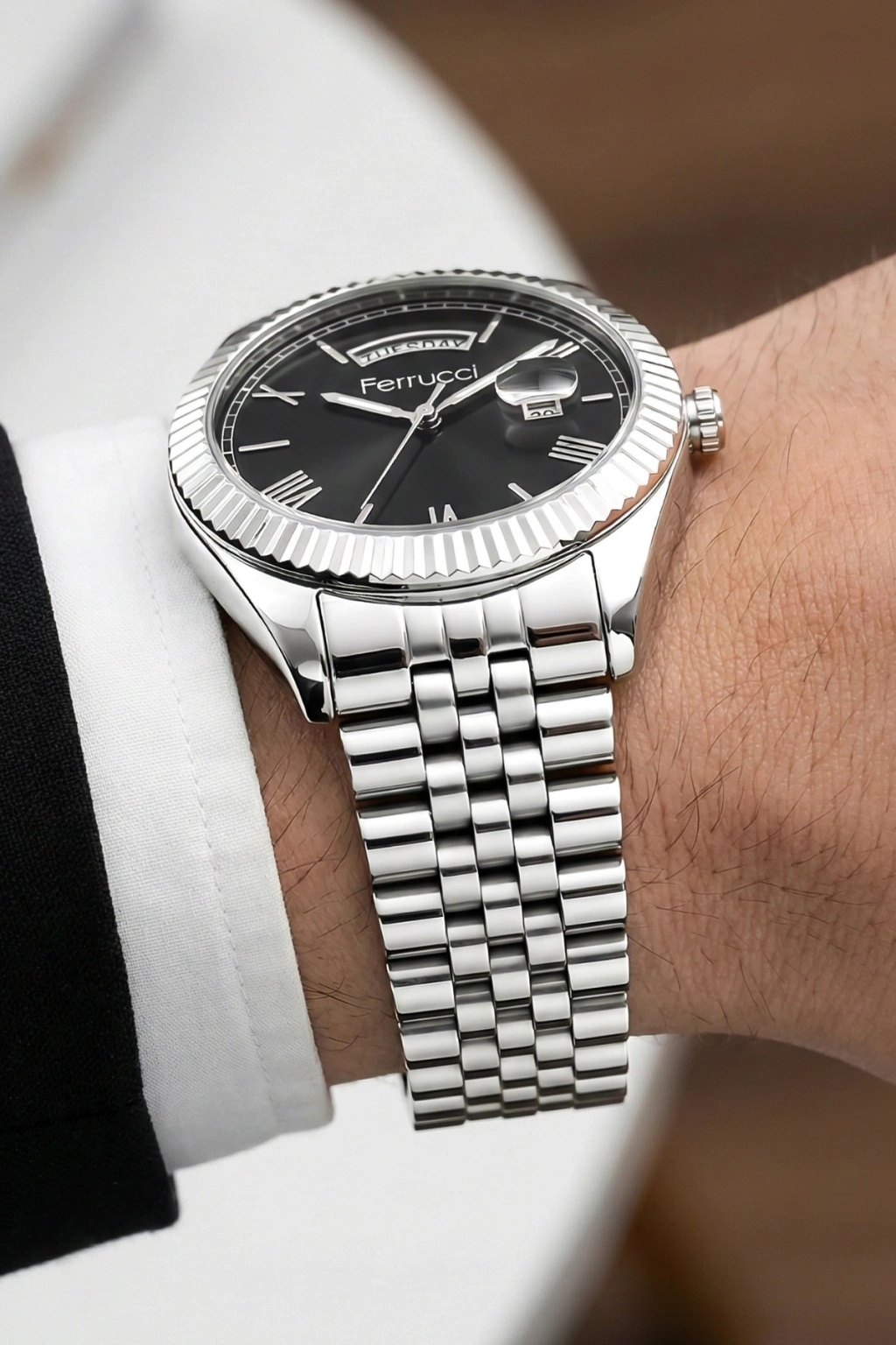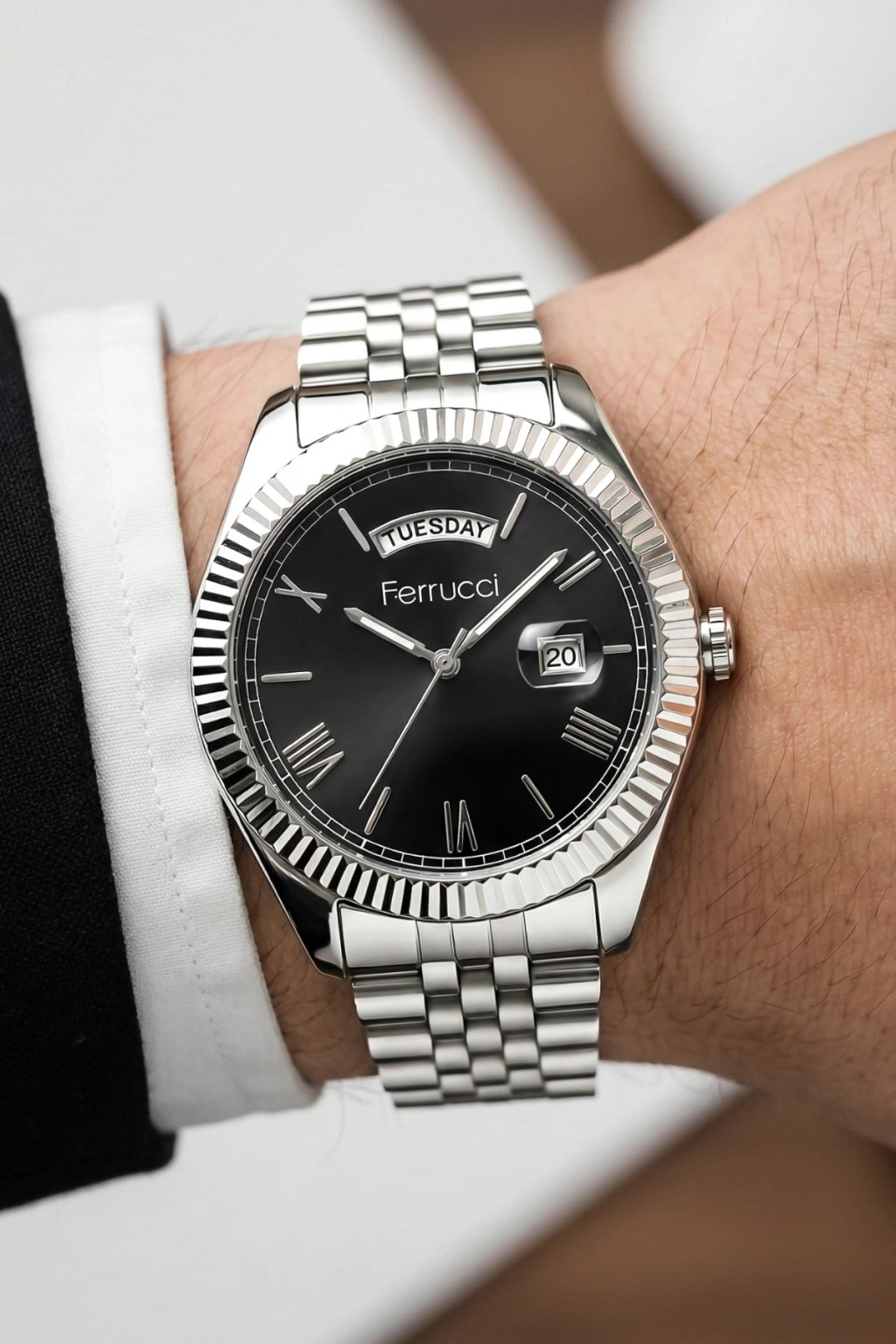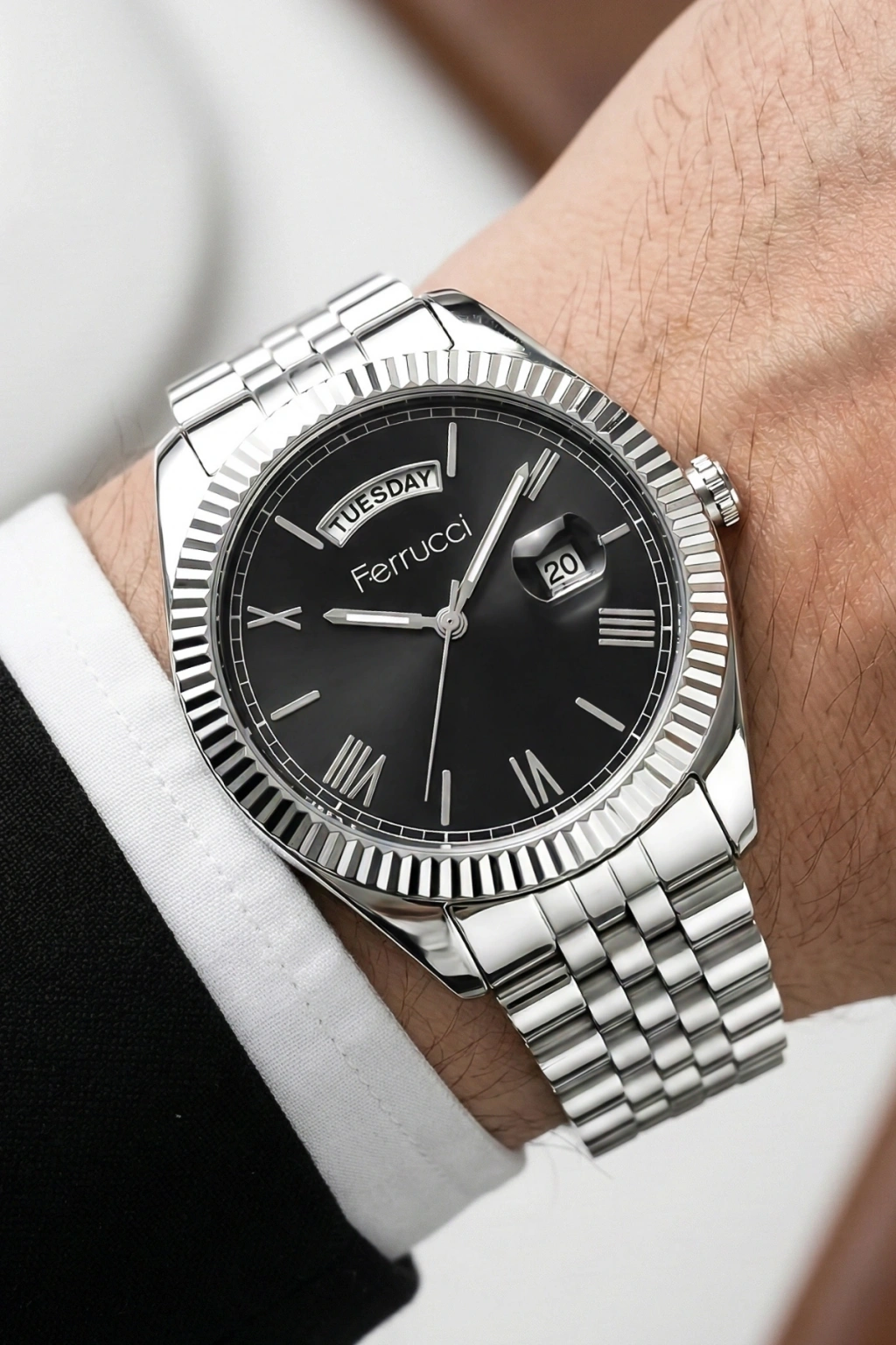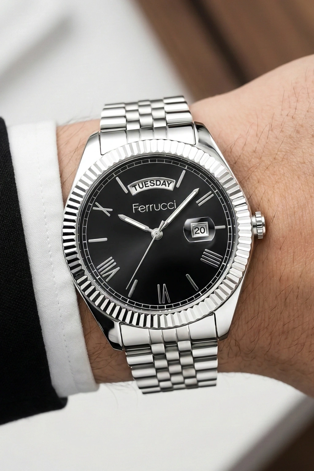 Kadran tasarımı Ferrucci’nin imza çizgisini taşır. Farklı renk alternatifleriyle sunulan sade ve okunaklı kadran yapısı, ışık altında zarif yansımalar oluşturarak saatin prestijli görünümünü destekler. Roma rakamları ve baton indekslerin dengeli yerleşimi, hem klasik hem modern bir estetik sunar. Saatin gün göstergesi (haftanın günü) ve tarih penceresi, günlük hayatın temposunda pratik bir kullanım avantajı sağlar. Bu fonksiyonlar, özellikle iş hayatında zamanı ve tarihi tek bakışta kontrol etmek isteyen kullanıcılar için büyük kolaylık sunar.