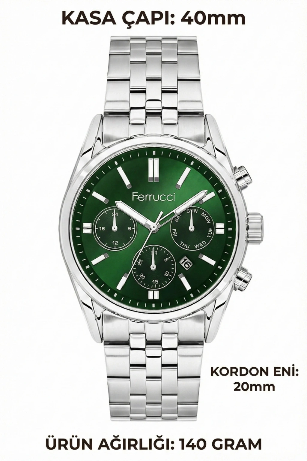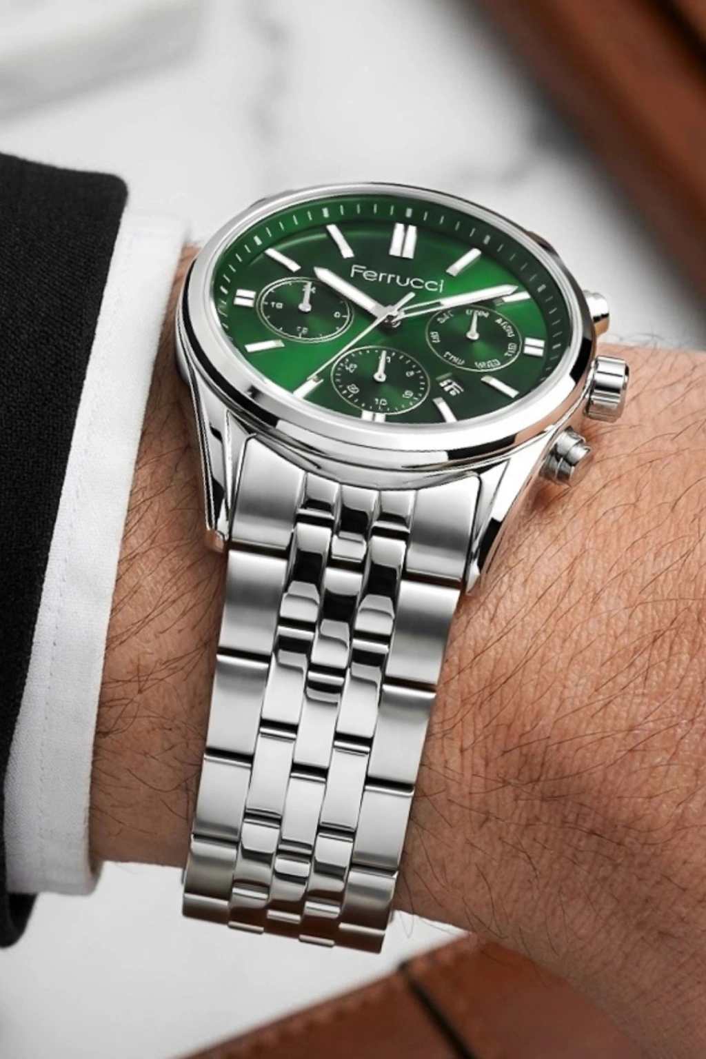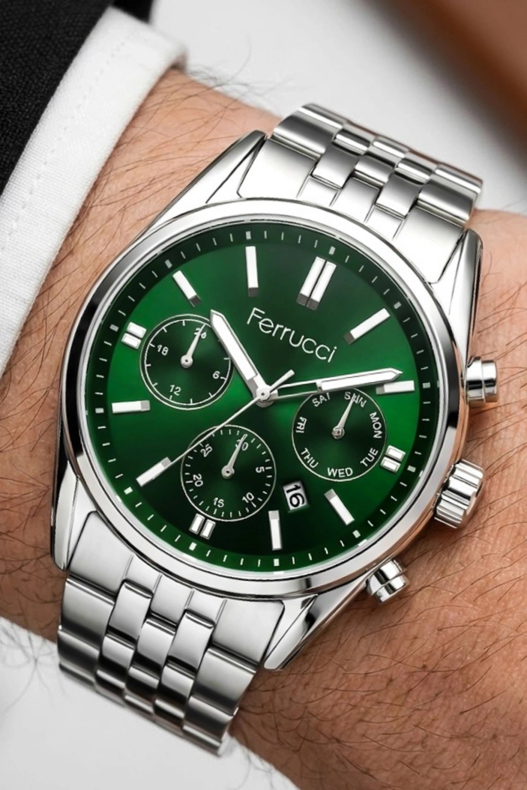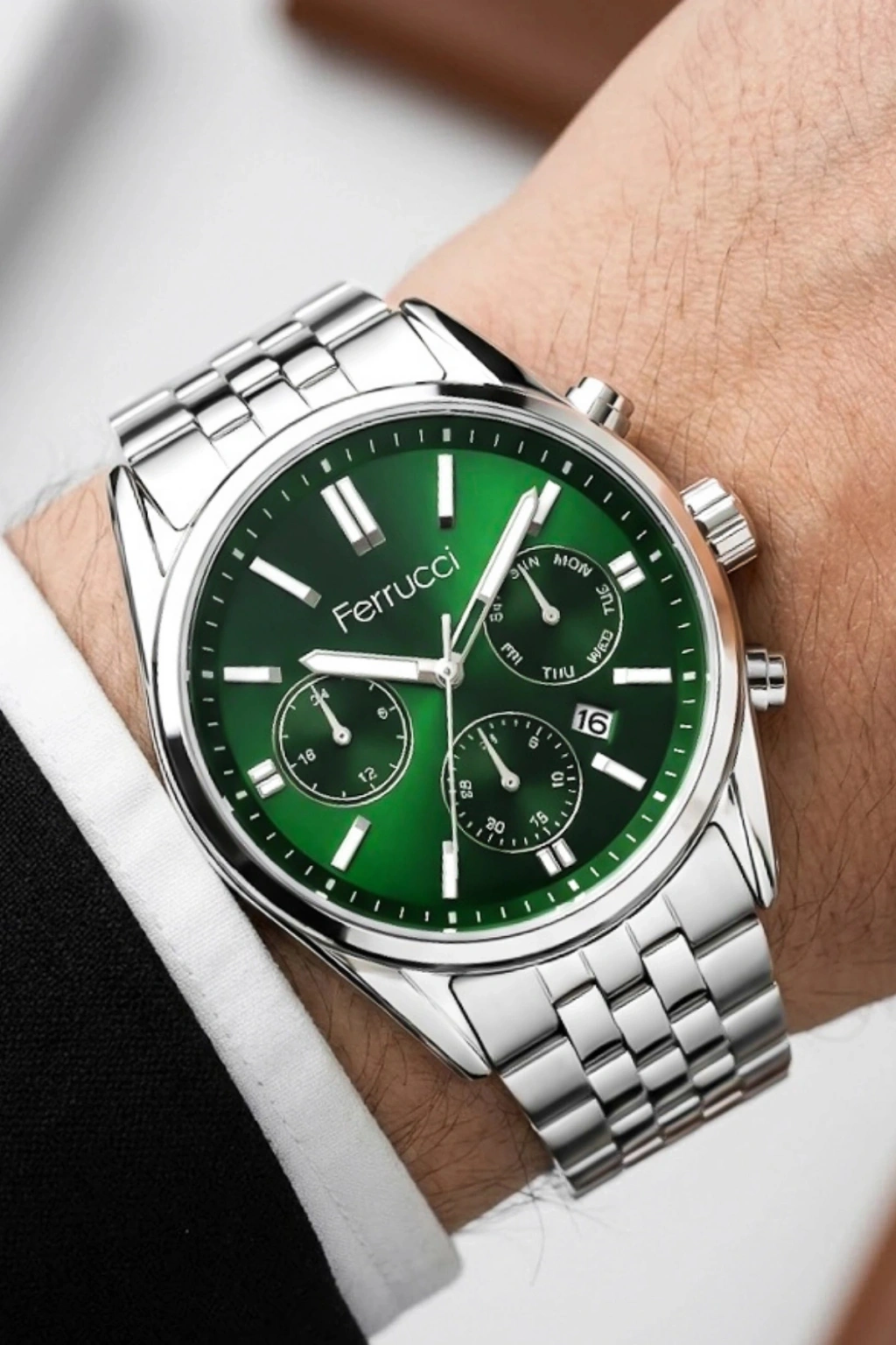 • Kadran tasarımında Ferrucci imzası net biçimde hissedilir. Siyah, lacivert, yeşil ve gümüş tonlu seçeneklerle sunulan kadranlar; ışığa göre derinlik kazanan yapısı sayesinde her açıdan etkileyici bir görünüm sunar. Uygulamalı baton indeksler ve net okunabilir akrep-yelkovan formu, saatin hem şık hem de işlevsel olmasını sağlar. Kadran üzerinde yer alan çok fonksiyonlu alt göstergeler, haftanın günleri, 24 saat formatı ve ek zaman fonksiyonları ile kullanıcıya pratik bir deneyim sunar. Saat 4–5 yönünde konumlandırılan tarih penceresi ise tasarımı bozmadan işlevselliği artırır.
